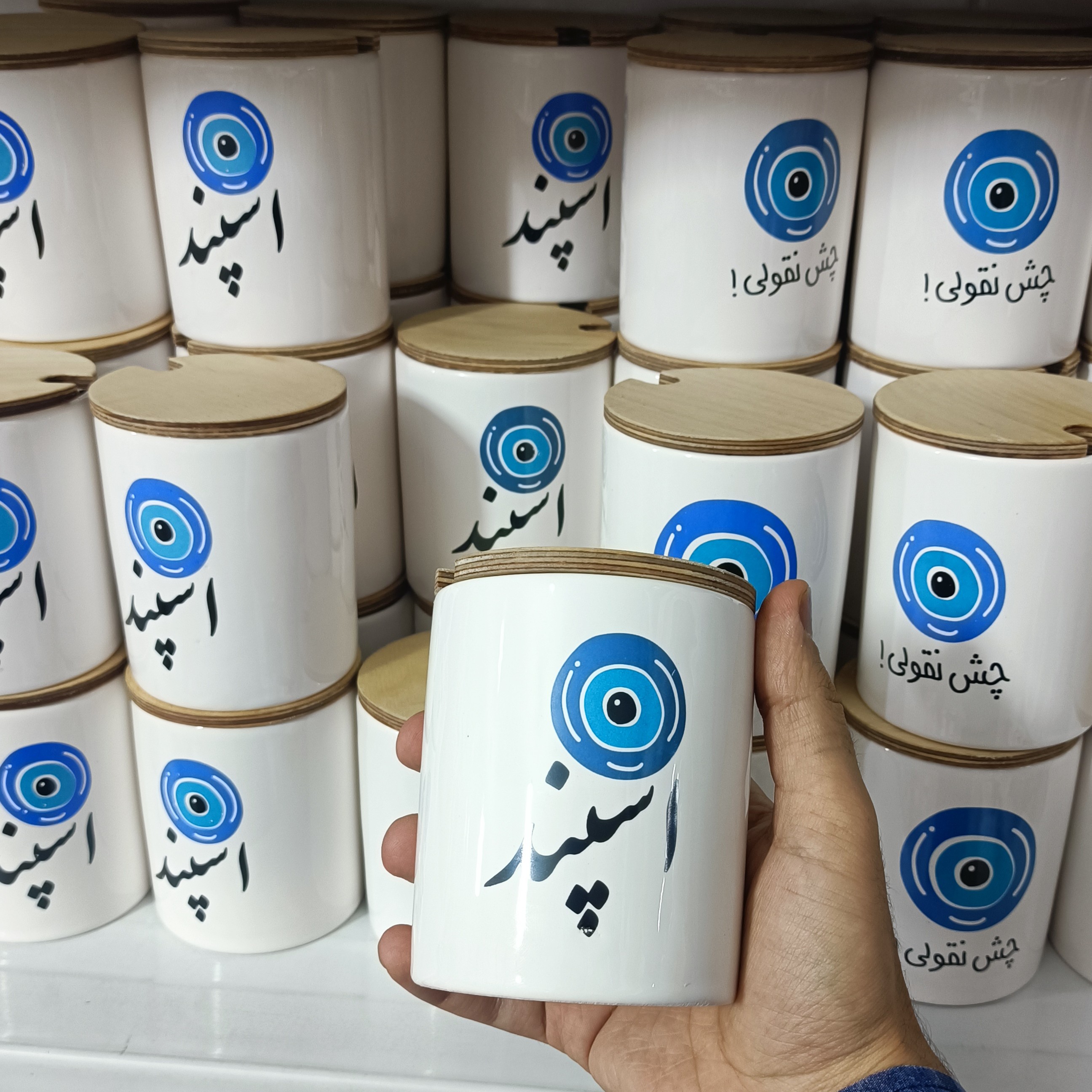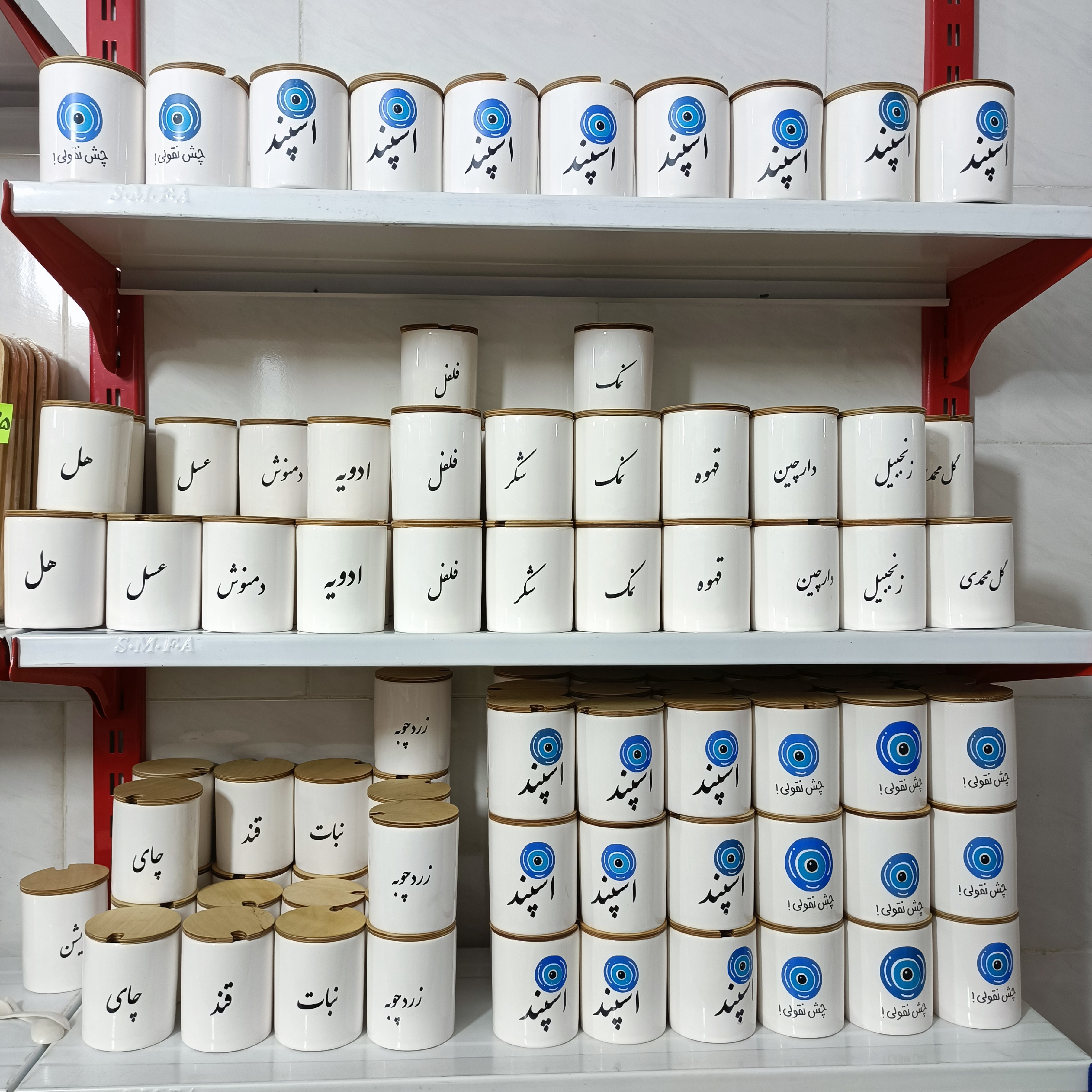 بانکه تکست سرامیکی فارسی انتخابی درب چوبی مخصوص ادویه و چای قند شکر دمنوش هل زنجبیل دارچین مبلمونسرا مدل 288087