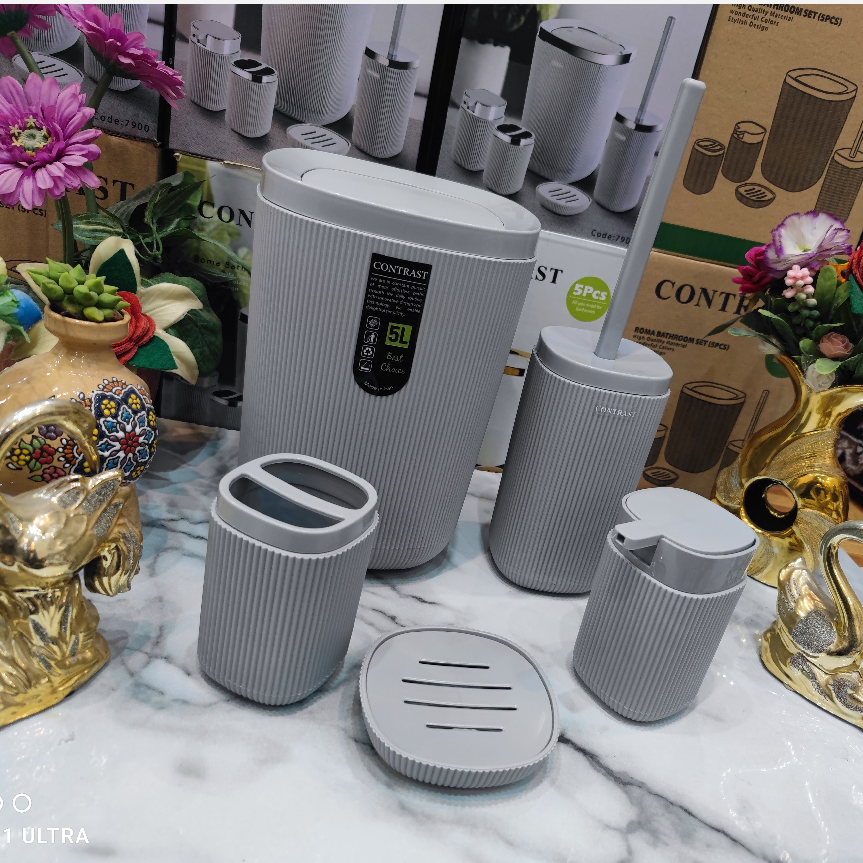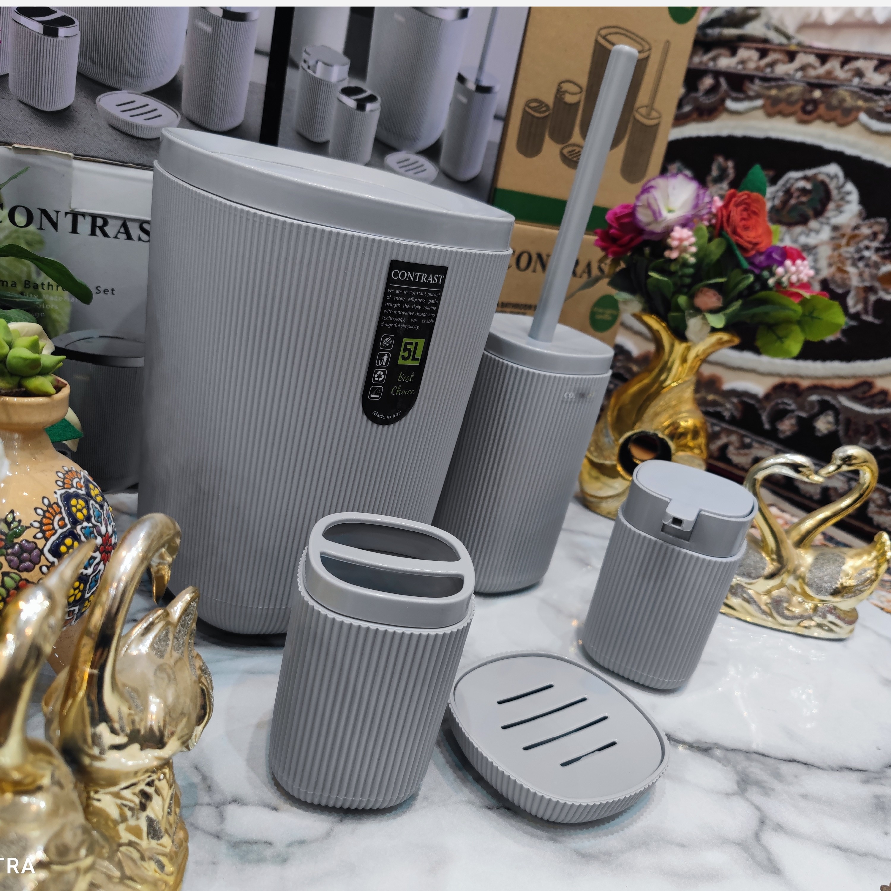 ست سرویس بهداشتی 5 پارچه طرح جدید روما خطی شیاردار برند کنتراست نو آکبند رنگ بسیار زیبا و شکیل و جذاب طوسی مات کیفیت ساخت بسیار مناسب و قیمت خوب و مناسب مناسب استفاده در سرویس بهداشتی یا جهیزیه ست سرویس بهداشتی شامل: 1.سطل زباله با درب بادبزنی باکیفیت بالا 2.برس مخصوص شستشوی سرویس بهداشتی 3.جامایع دستشویی با سرپمپ باکیفیت 4.جای مسواک و جای خمیر دندان 5.جای صابون جامد طرح بسیار زیبا و جذاب روما خطی طوسی مات ارسال سریع و رایگان به تمام نقاط کشور برای خریداران عزیز