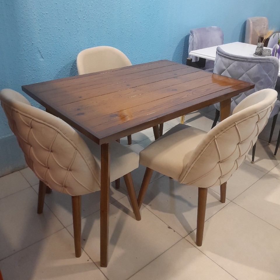 صفحه میز از چوب ترمو پایه میز چوب روس پایه صندلیها چوب چنار پارچه آرسن مخمل رنگ کرم نشیمنگاه عالی ارسال بصورت پسکرایه درب منزل بامشتری است