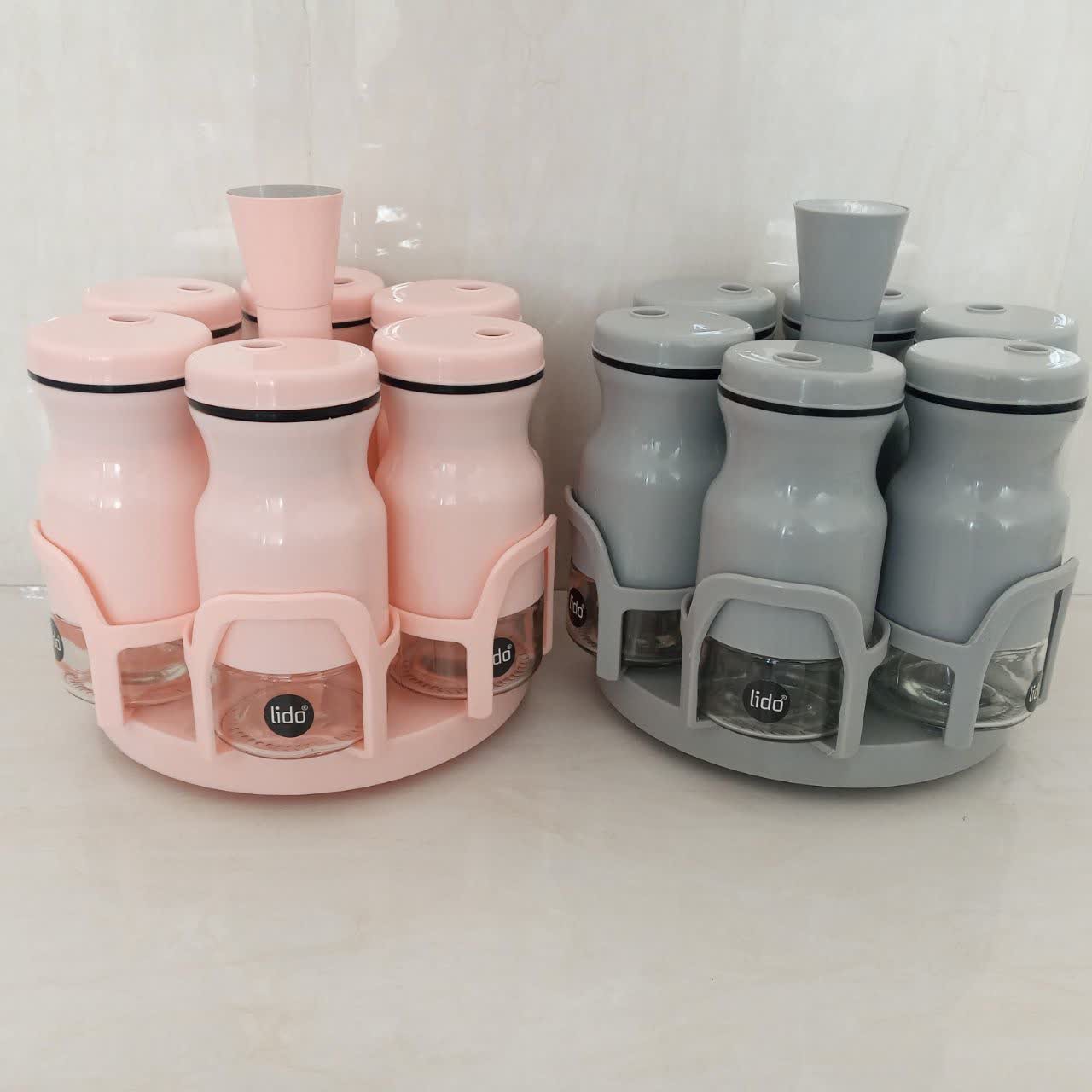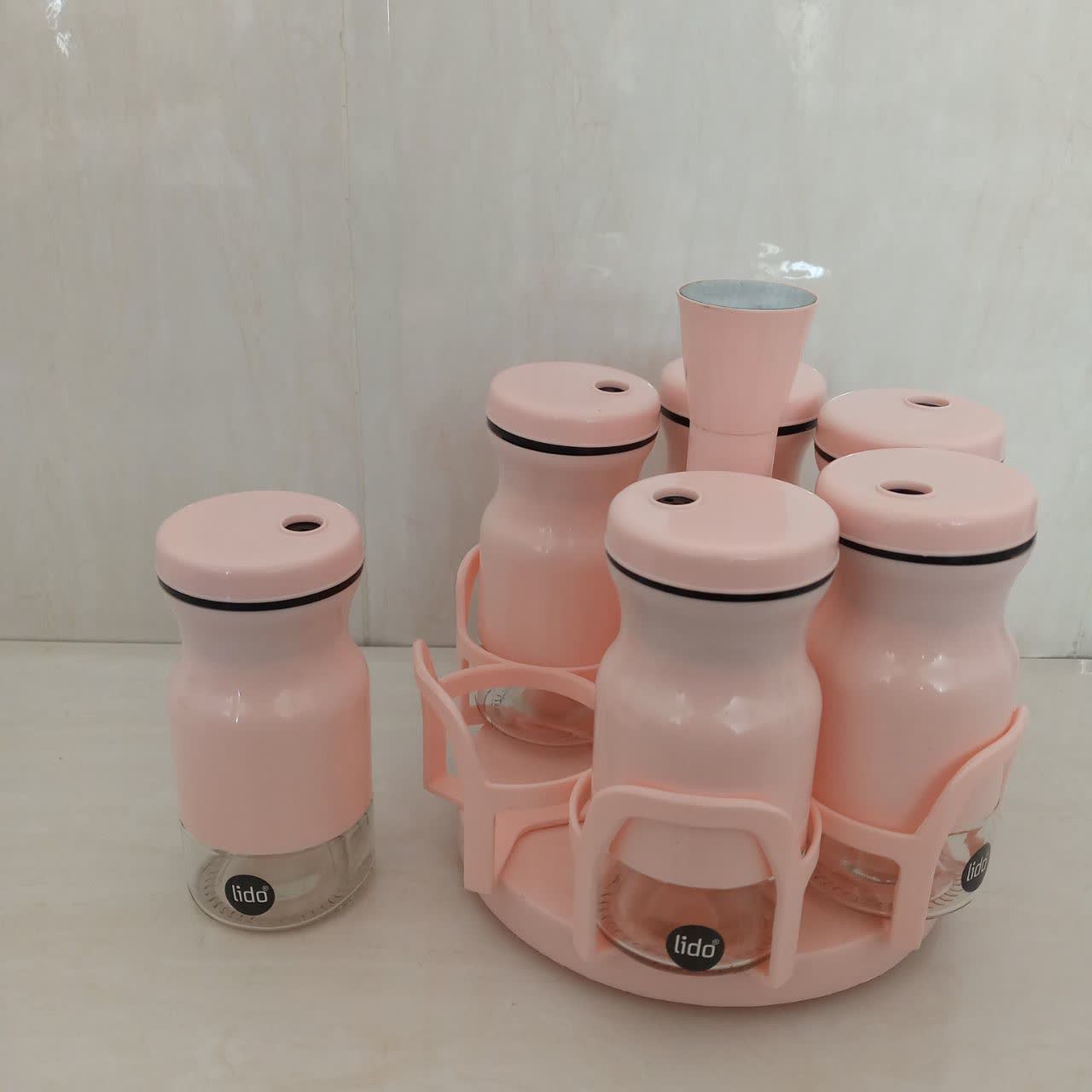 جا ادویه چرخشی رنگ صورتی ۷ پارچه شامل ۶ عدد جاادویه و یک عدد هم استند دارای شبکه چرخشی جنس شیشه ای با روکش پلاستیک فشرده جنس استند پلاستیک فشرده مقاوم