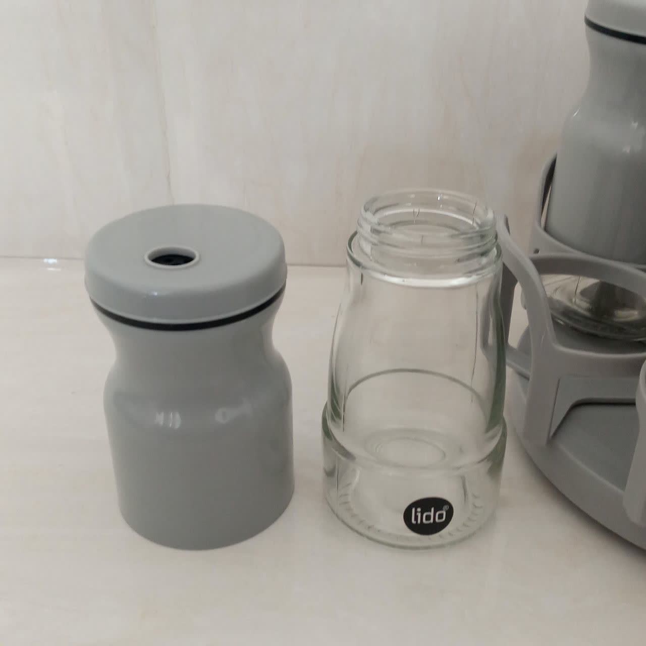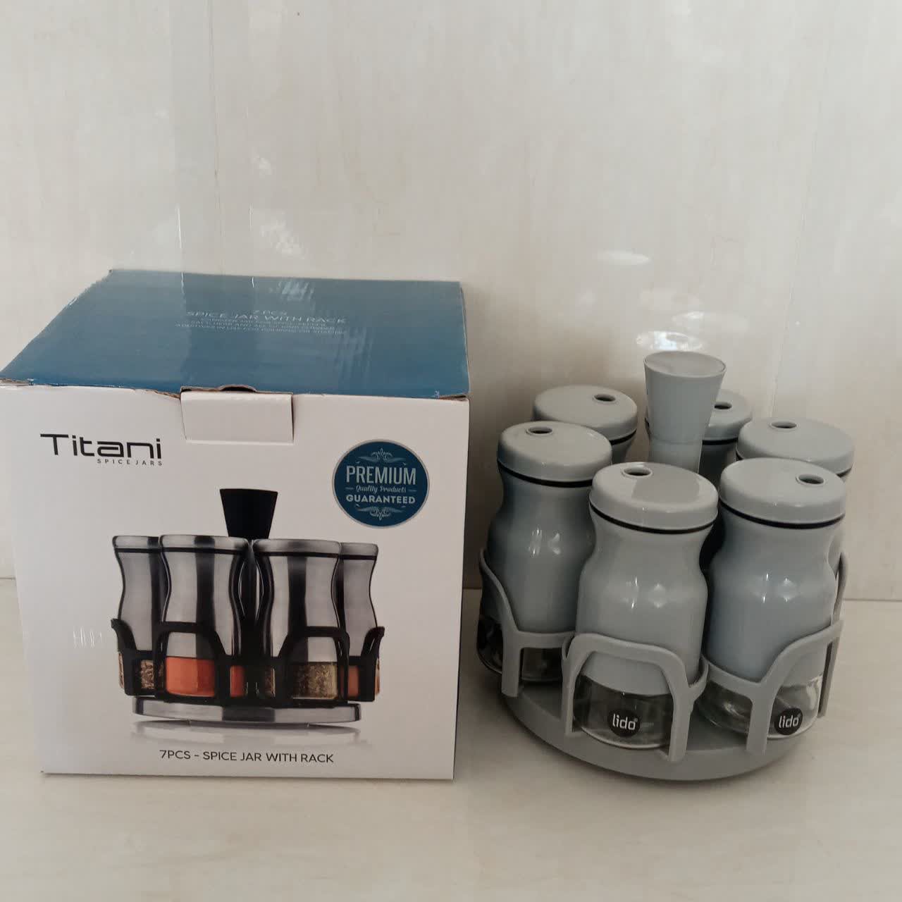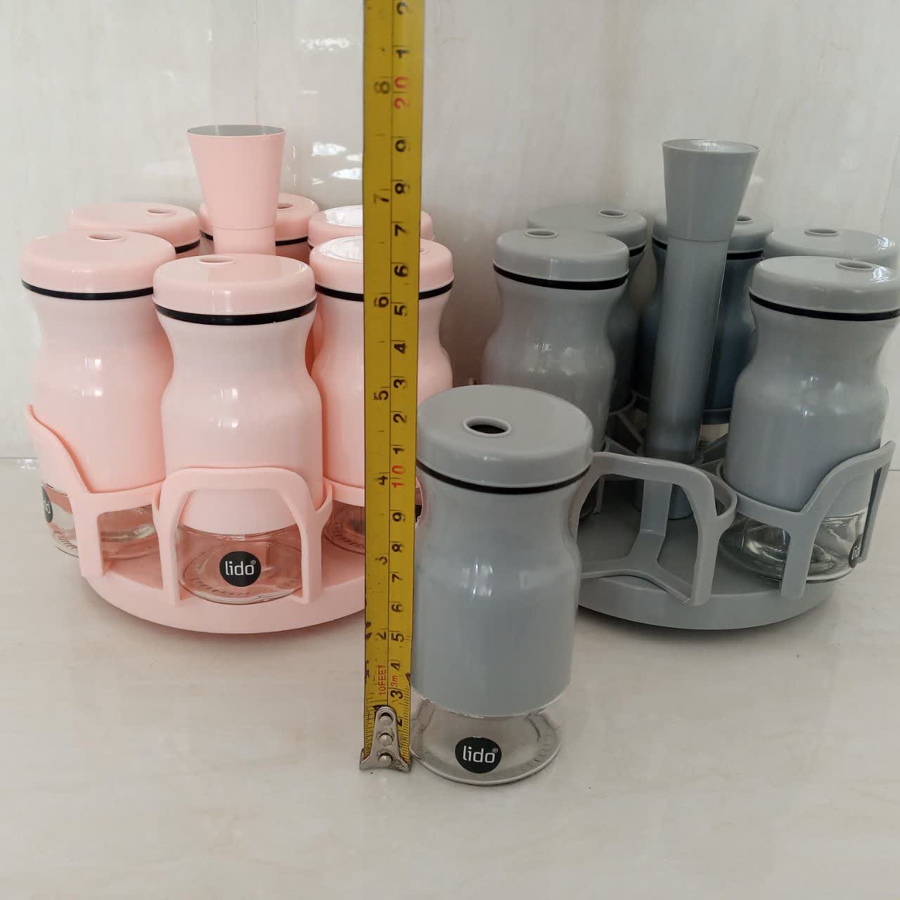 جا ادویه چرخشی رنگ طوسی ۷ پارچه شامل ۶ عدد جاادویه و یک عدد هم استند دارای شبکه چرخشی جنس شیشه ای با روکش پلاستیک فشرده جنس استند پلاستیک فشرده مقاوم