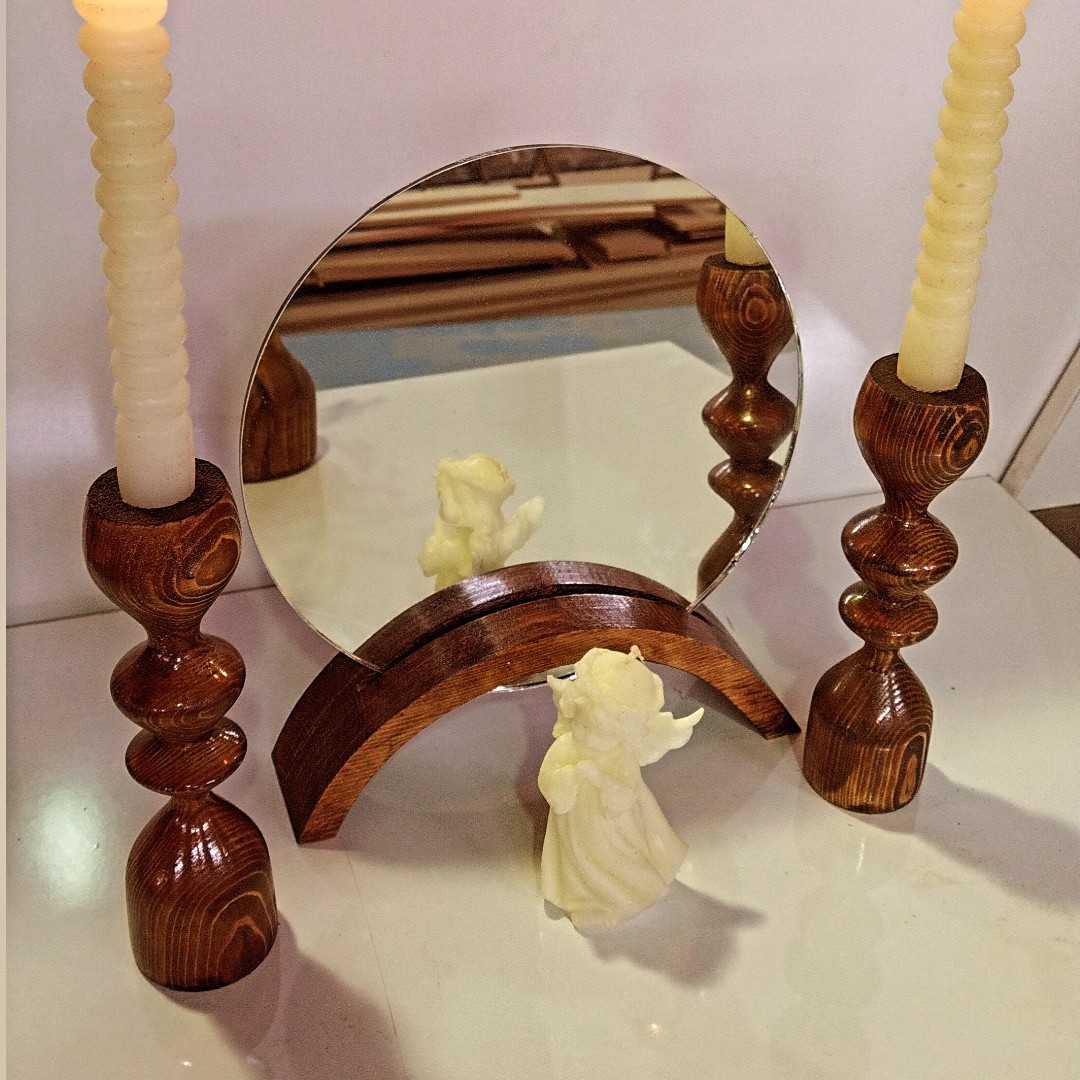 ست آینه و شمعدان و گلدان متریال چوب روس ارتفاع اینه 30 قطر 24 ارتفاع شمعدان 20 گلدان 10 قابل سفارش به تعداد بالا برای دریافت قیمت عمده پیام دهید ترک و دفرمگی و گره و تفاوت رنگ در کار چوب طبیعی هستش