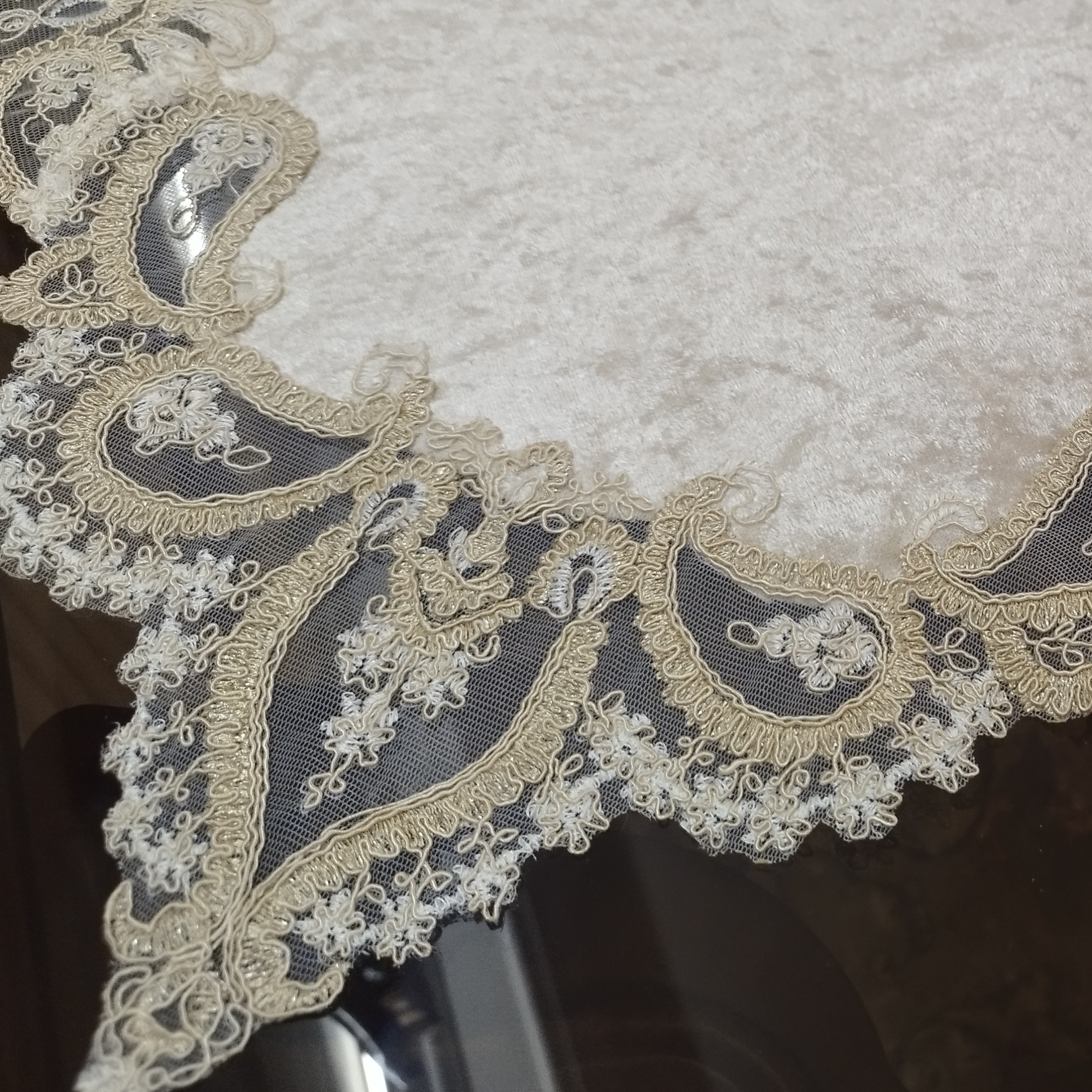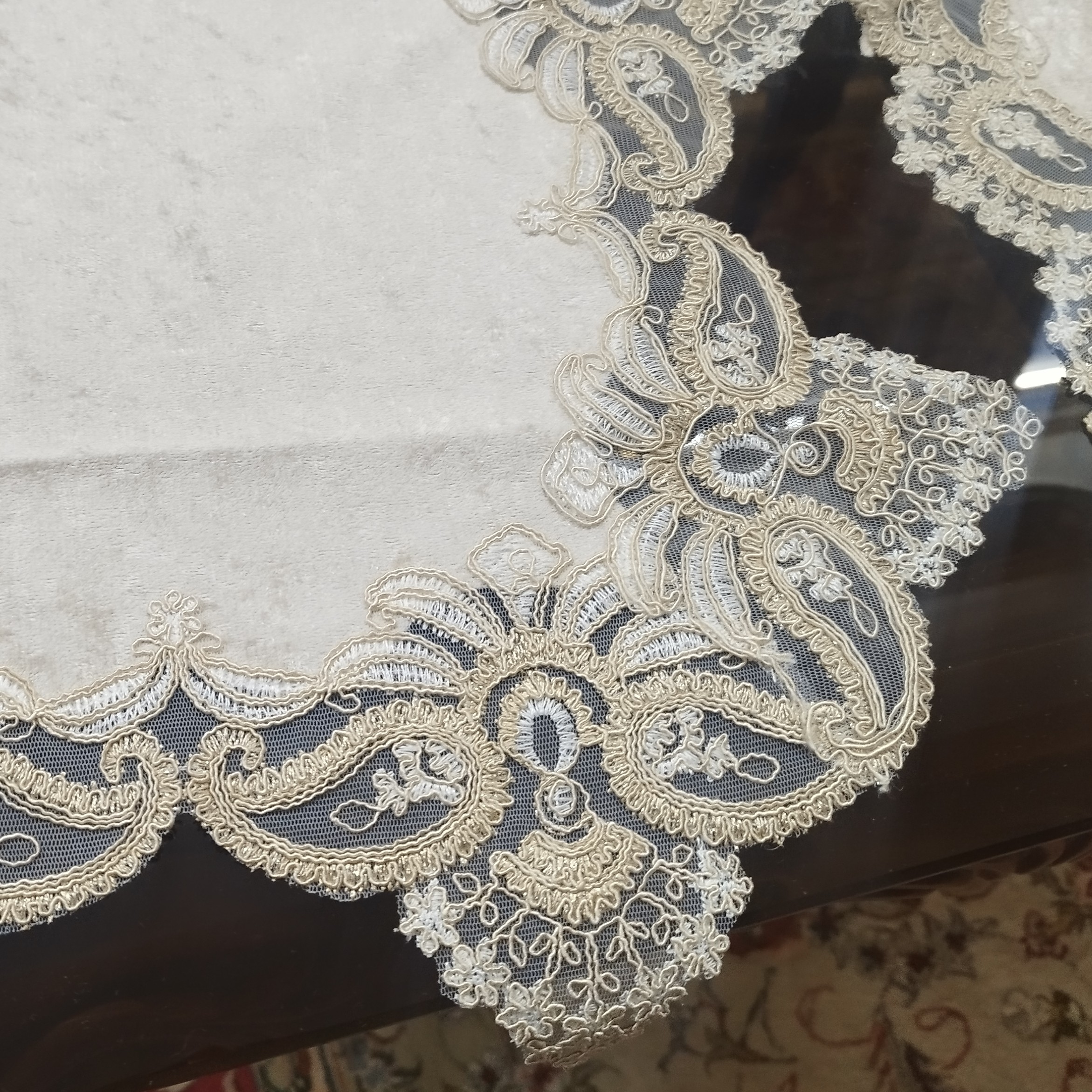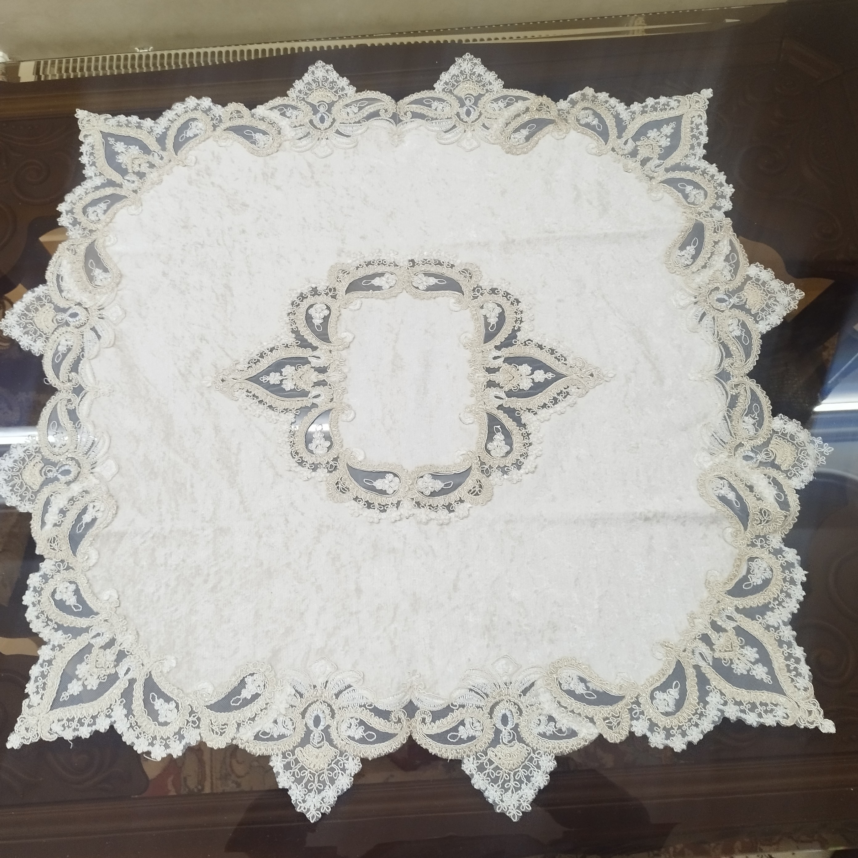 رومیزی سه تیکه مربع دانتل ومخمل ترک با رنگ نسکافه ای اندازه جلو مبلی82*82 عسلی46*46 قابل شستشو بدون هیچ گونه تغییر در رنگ وشکل مناسب برای میزهای مربع