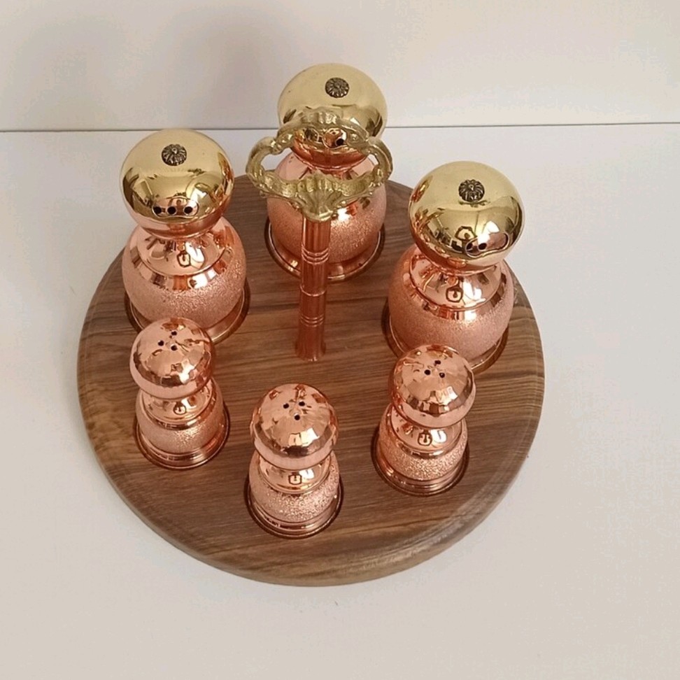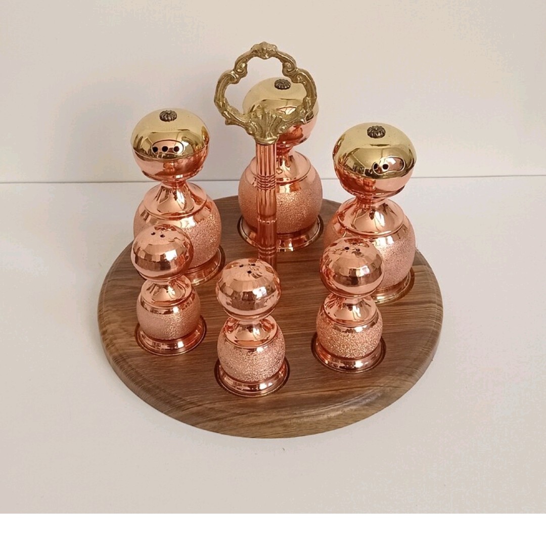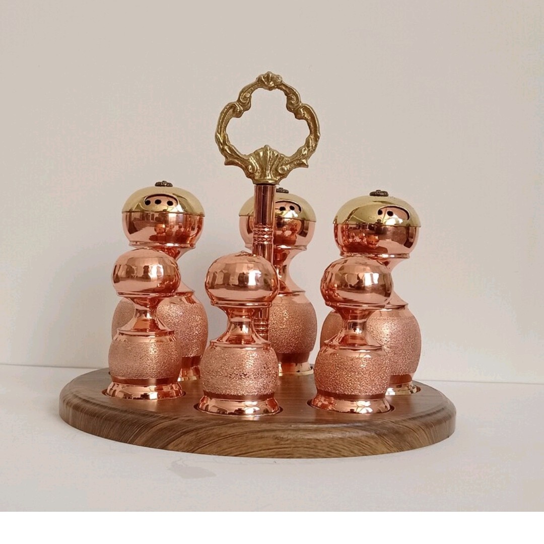 این ظرف مسی دارای سه عدد جا ادویه مسی و سه عدد نمکدان مسی میباشد و در یک استند بسیار زیبا چیده شده که دارای دستگیره بسیار زیبایی برای حمل و جا به جایی میباشد
