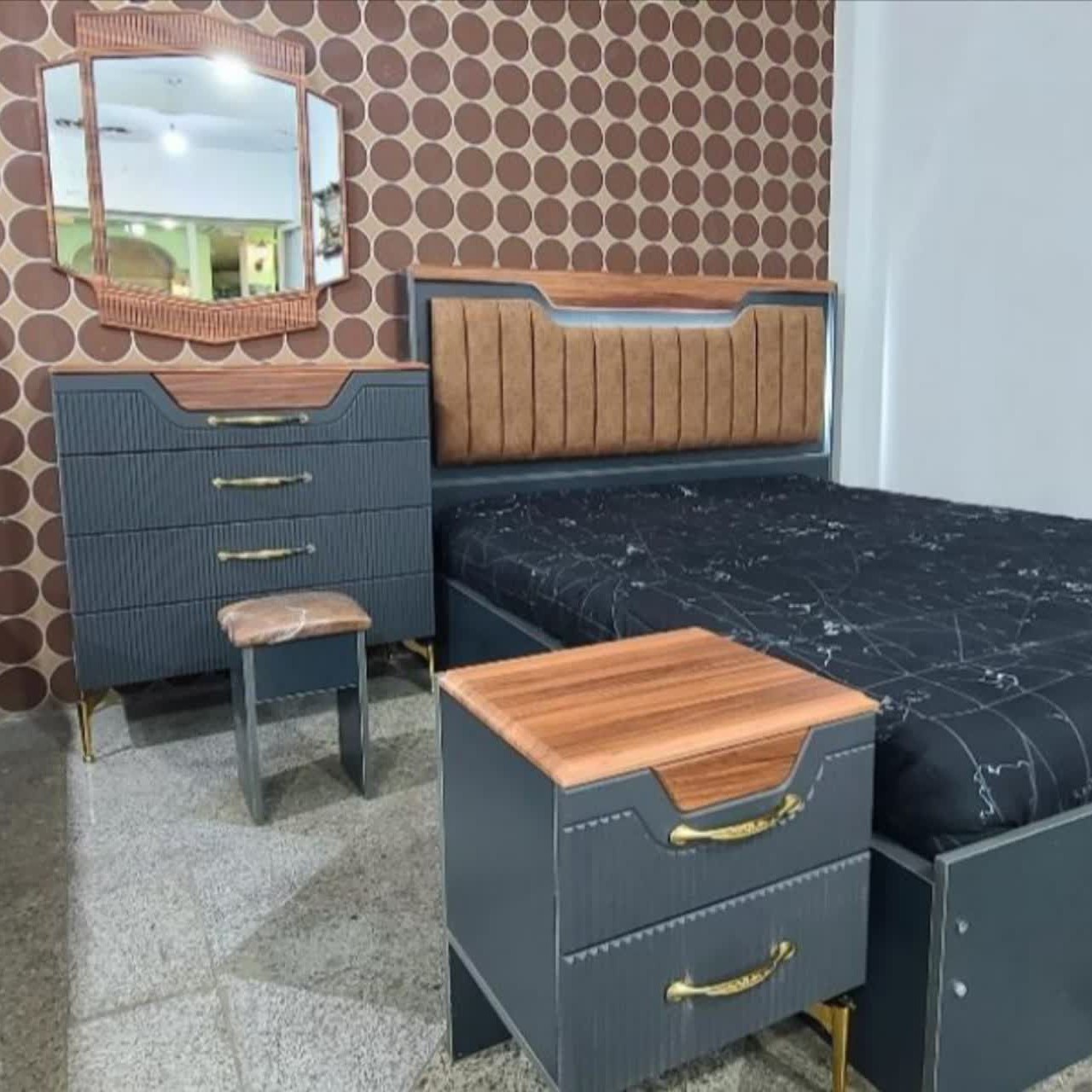 سرویس خواب دونفره همراه با لوازم تخت میزآرایش دوعدد پاتختی دوعدد کفی تخت و صندلی میزآرایش جنس ملامینه و ام دی اف رنگ بندی دارد ابعاد 160 در 200 ارسال به تمام نقاط کشور