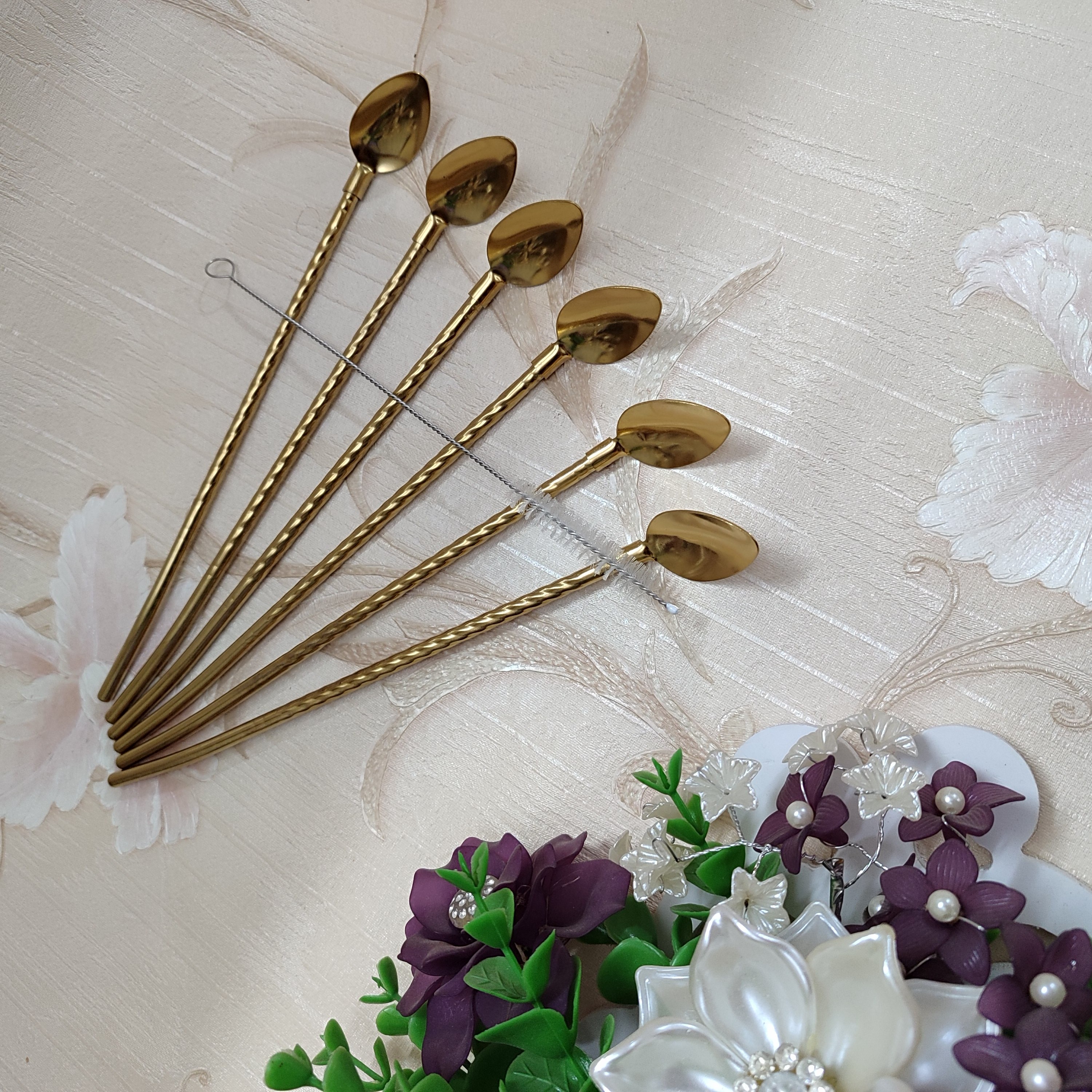 نی استیل قاشق دار طلایی رنگ همراه با فرچه ی نظافت کننده مناسب پذیرایی لطفاً قبل از سفارش موجودی بگیرید
