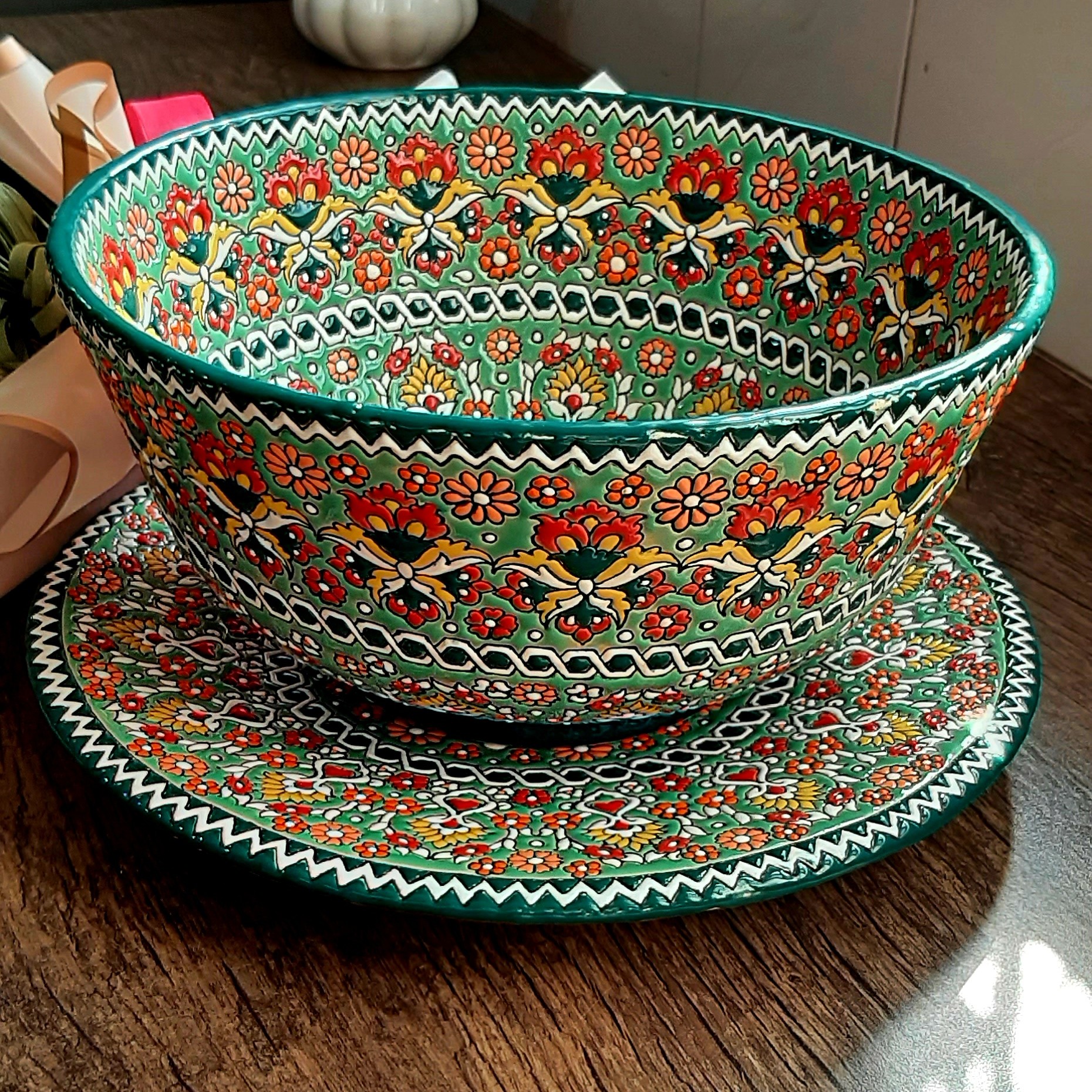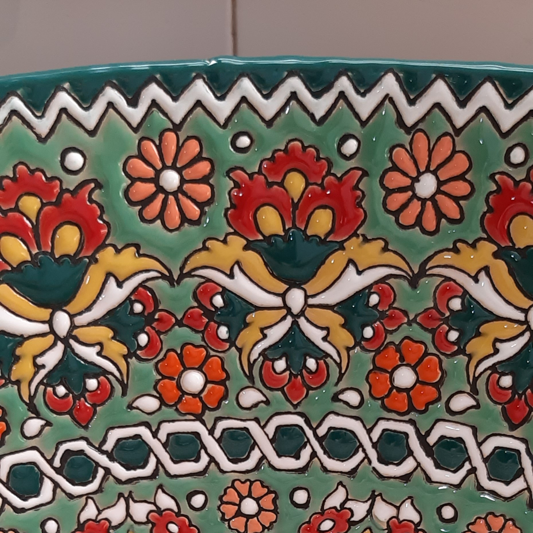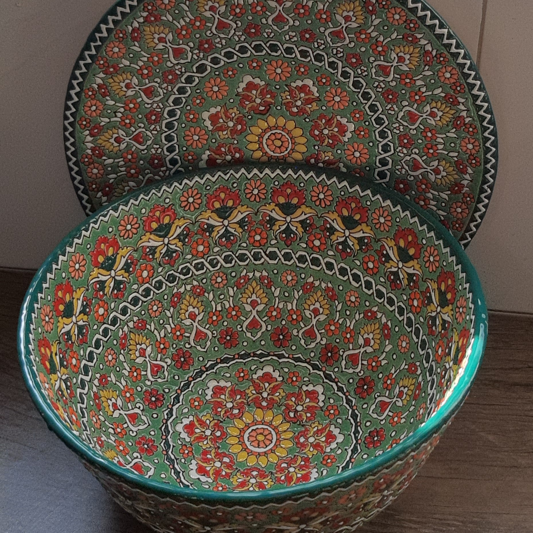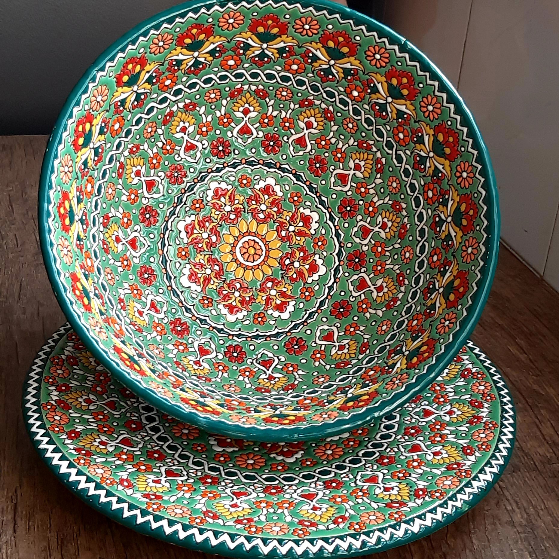 کاسه بشقاب سفالی ست و هماهنگ بسیار به رنگ سبز فیروزه و گلهای قرمز و زرد و ... مبلمونسرا مدل 292014