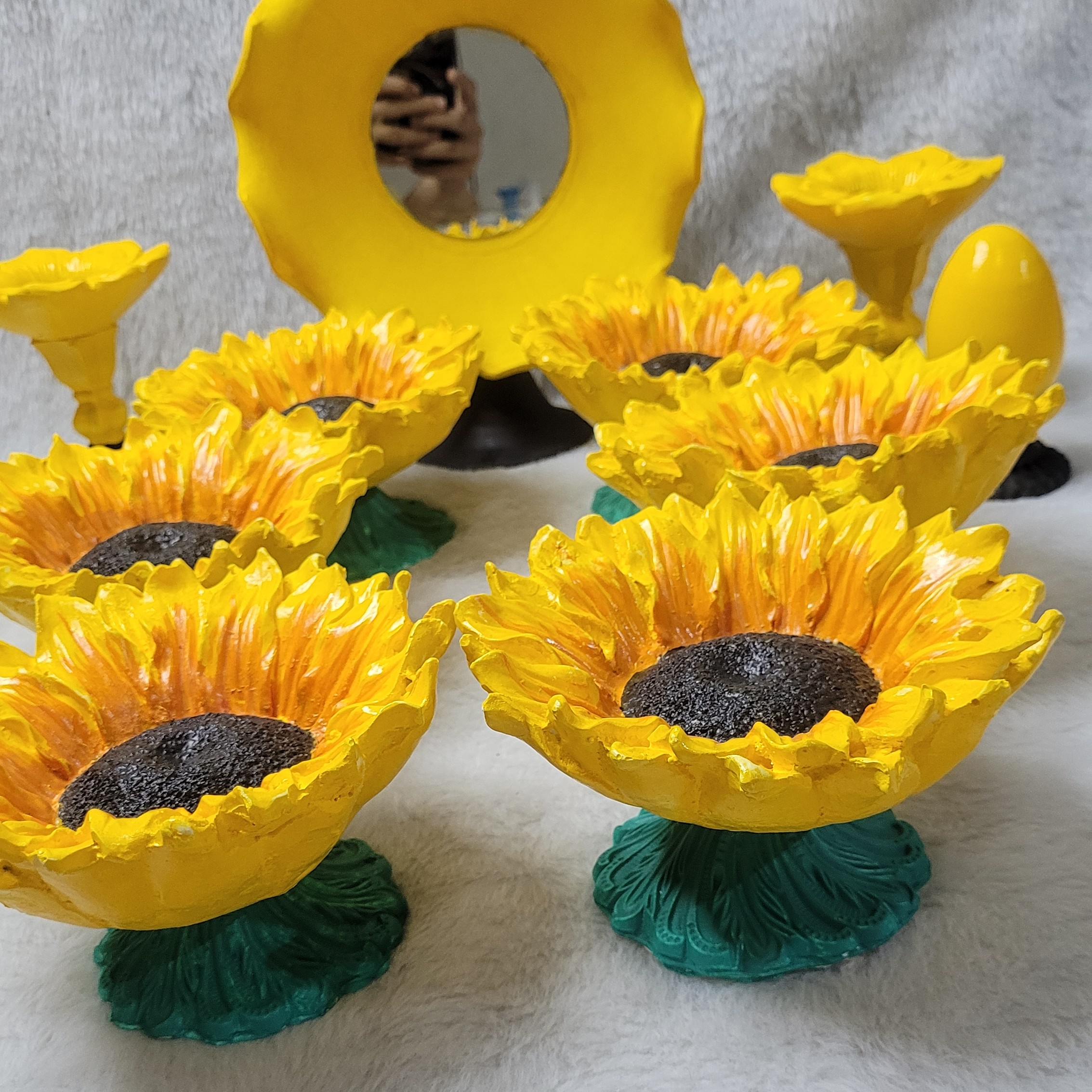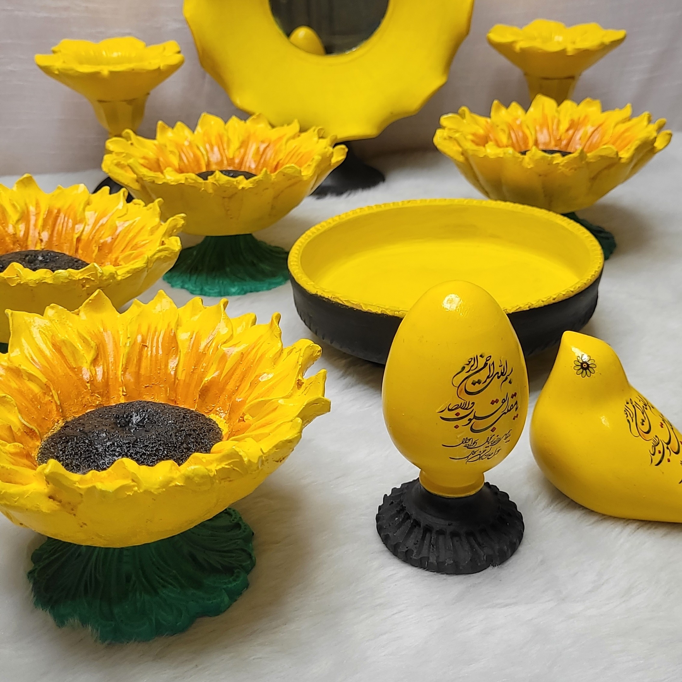 هفتسین آفتابگردون دو منظوره هم هفتسین هم بجای آجیل خوری میتونی استفاده کنید. شامل 6 ظرف آفتابگردون یگ جفت شمعدان یک عدد آینه یک عدد مرغ و تخم مرغ بصورت اشانتیون یک عدد ظرف جای سبزه