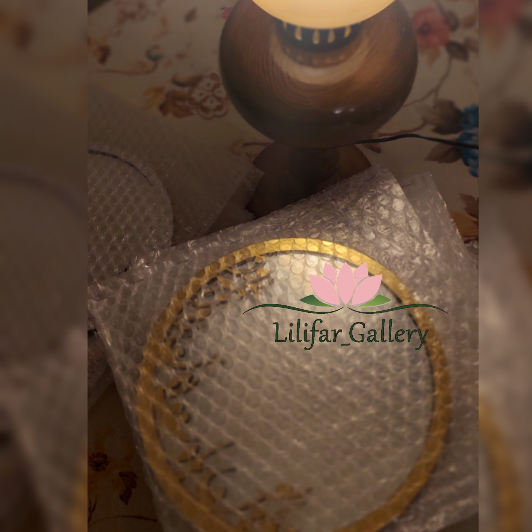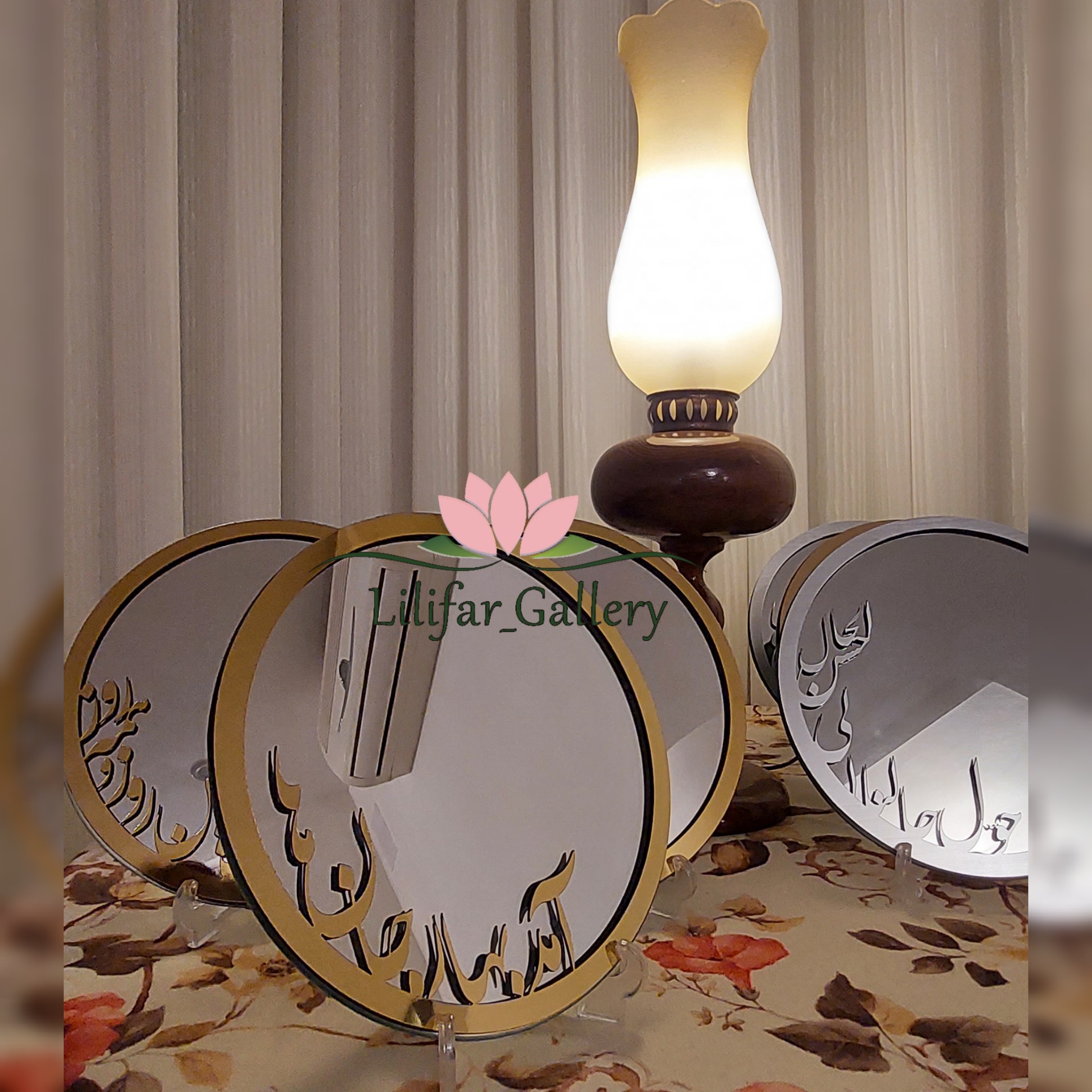 آینه رومیزی قطر بیست و نه سانت با متن برجسته دارای دو رنگ نقره ای و طلایی