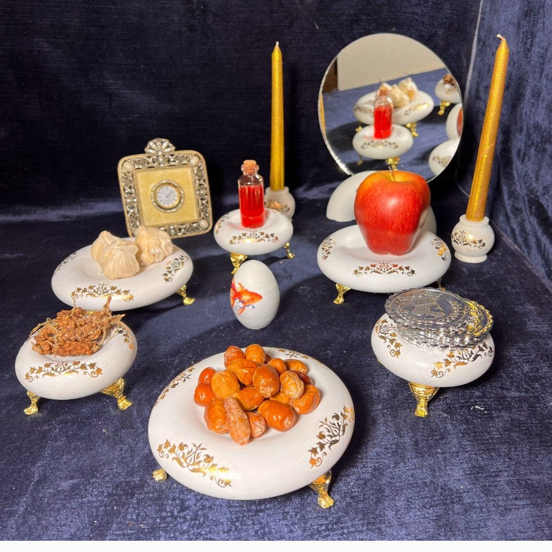 مجموعه ست هفتسین تهیه شده از پودر بتن زودگیر یا سنگ مصنوعی هست که به اکسسوری های سنگ مصنوعی معروف هستند این مجموعه ۴ دست رنگ خورده و نقاشی شده سپس با تثبیت کننده های شیمیایی مانند کیلیر و وارنیش تثبیت شده است . این مجموعه قابل شست و شو می باشد و مناسب سرو خوراکی های خشک میباشد. این مجموعه به هیچ عنوان مناسب سرو خوراکی های داغ و تر نمی باشد این مجموعه شامل یک عدد پایه آینه یک جفت شمعدان ۳ عدد ظرف قطر ۱۵ سانت پایه دار ۳ عدد ظرف قطر ۱۰ سانت پایه دار