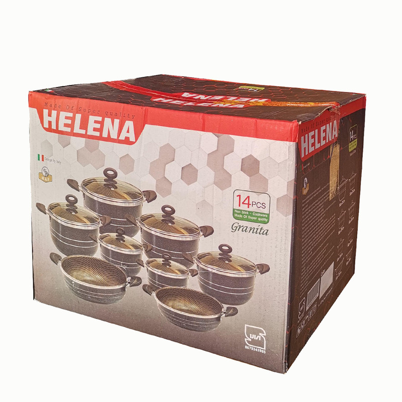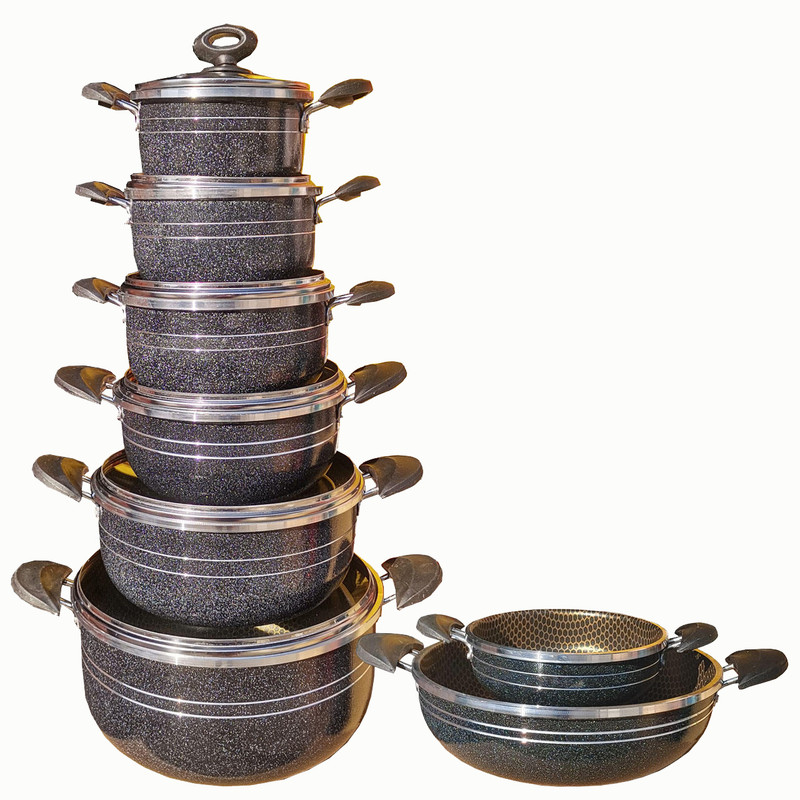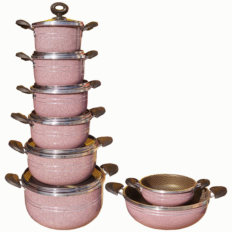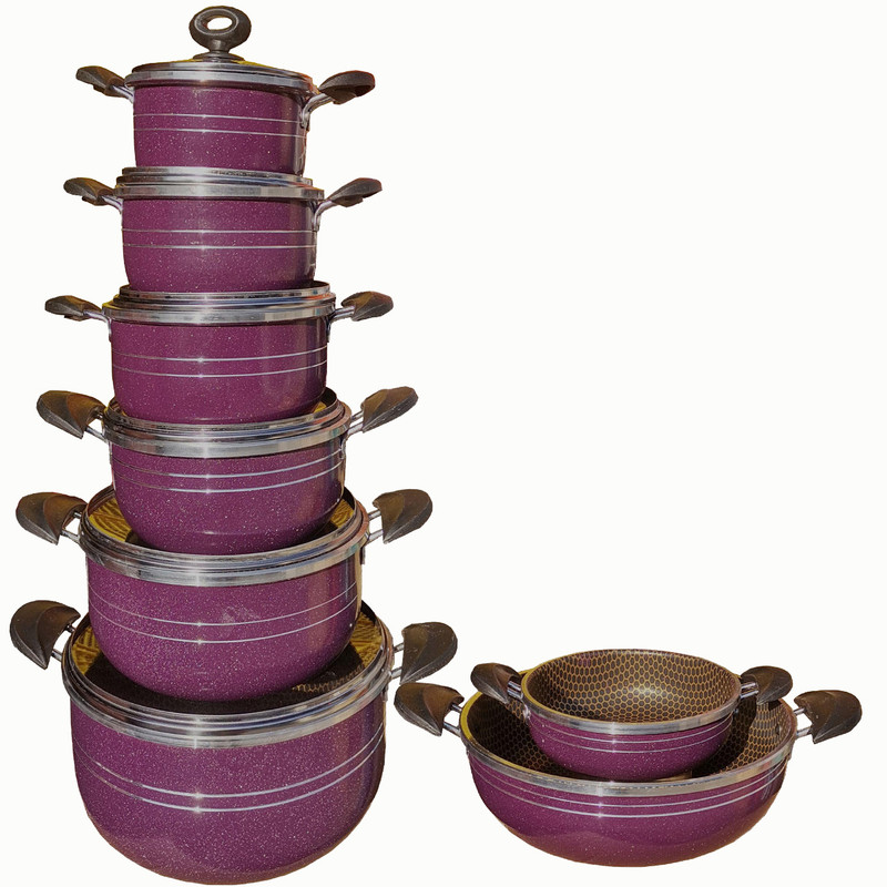 سرویس 14پارچه تابه و قابلمه سرویس قابلمه 14 پارچه طرح زنبوری دارای: - شش عدد قابلمه ی 1، 2، 3، 4، 6 و 8 نفره و دو عدد تابه 3 و 8 نفره می باشد. - قابلمه ها دارای شش عدد درب پیرکس هستند و برای تابه ها می توانید مشترکا از درب قابلمه ها استفاده کنید. - پوشش داخلی گرانیت و رنگ بیرونی کوره ای می باشد. - هر محصول دارای رو عدد دستگیره عایق می باشد.سرویس طرح (زنبوری)است. مهر استاندارد دارد. ضخامت لبه 5 میلیمتر است ضخامت بدنه 2 میلیمتر است دسته ها مقاوم در برابر گرما هستند
