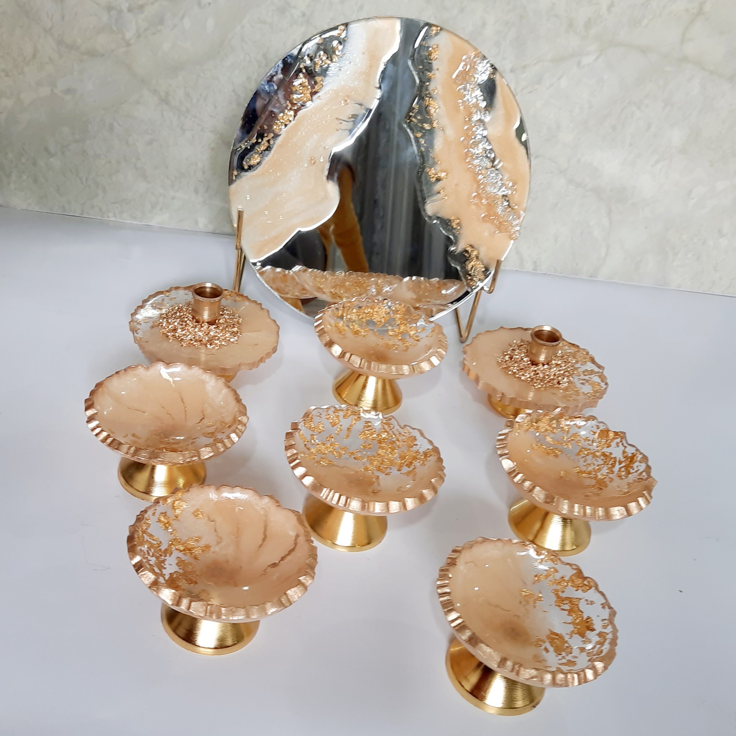 هفتسین عید نوروز جنس رزین اپوکسی درجه یک ،قابل شست وشو با آب و مایع ،نشکن ،اندازه آینه قطر ۲۵سانت ،اندازه پیاله ها قطر ۱۲