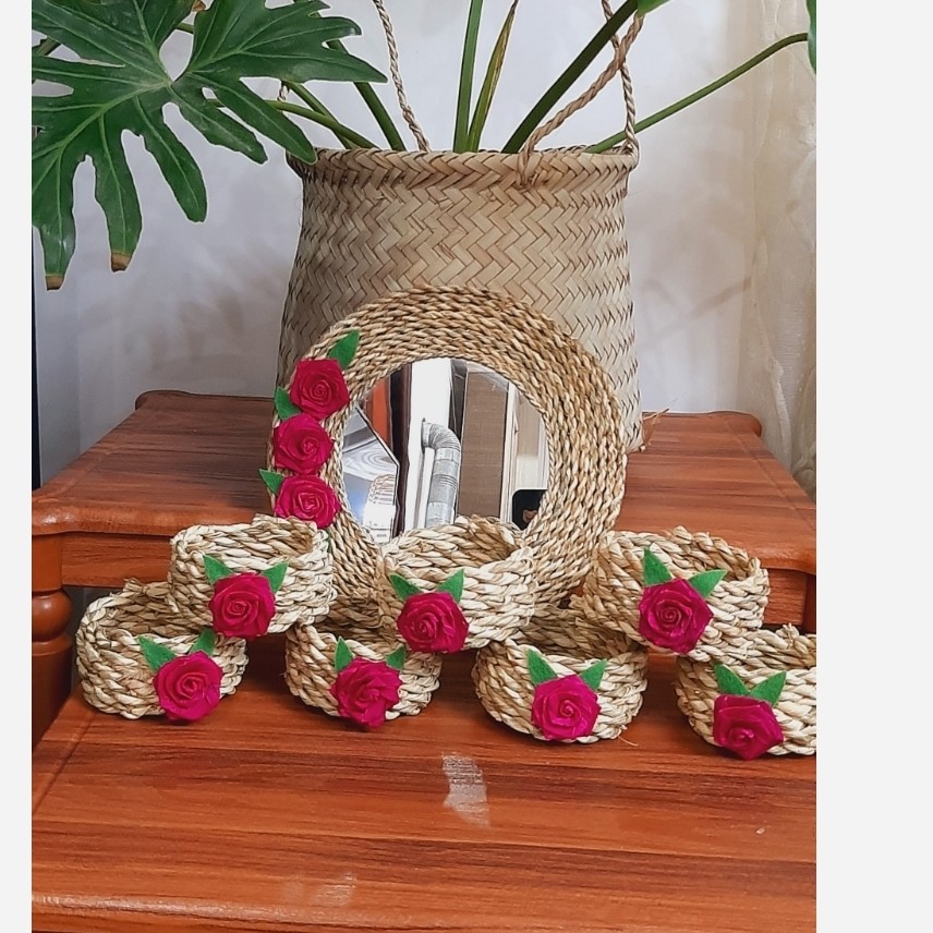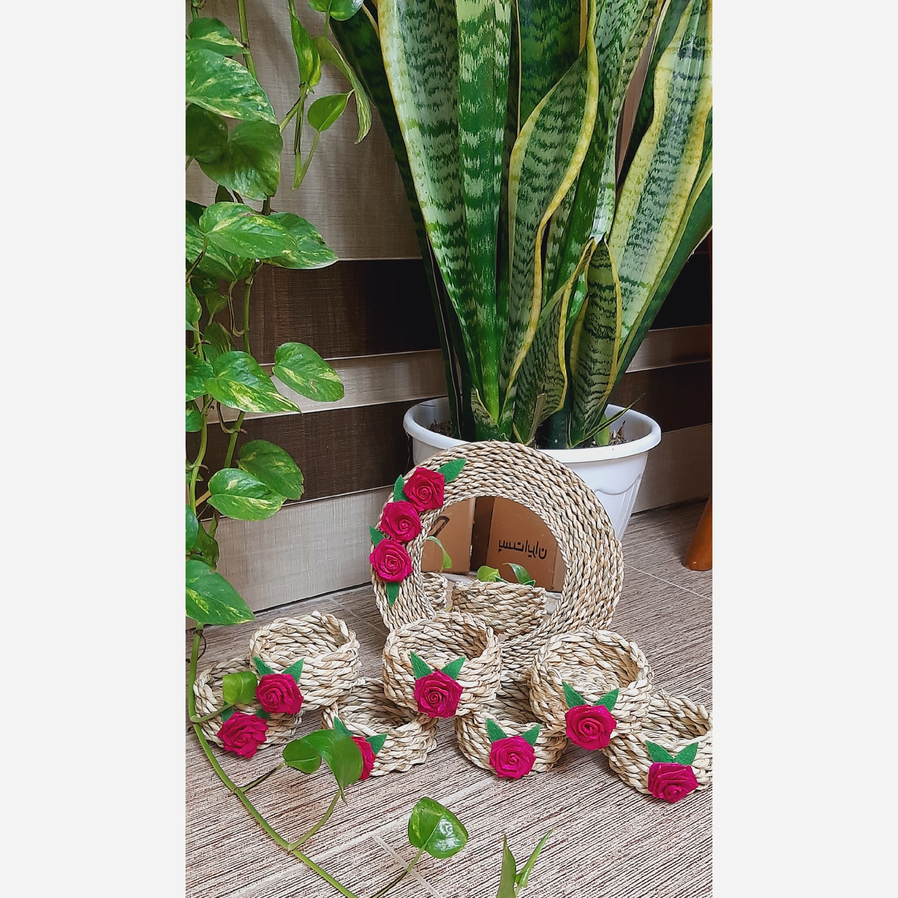 هفت سین حصیری که شامل یک اینه حصیری 25 سانتی که پشت اینه چوب ام دی اف کار شده و هفت پیاله حصیری گلدار با دوخت مخفی