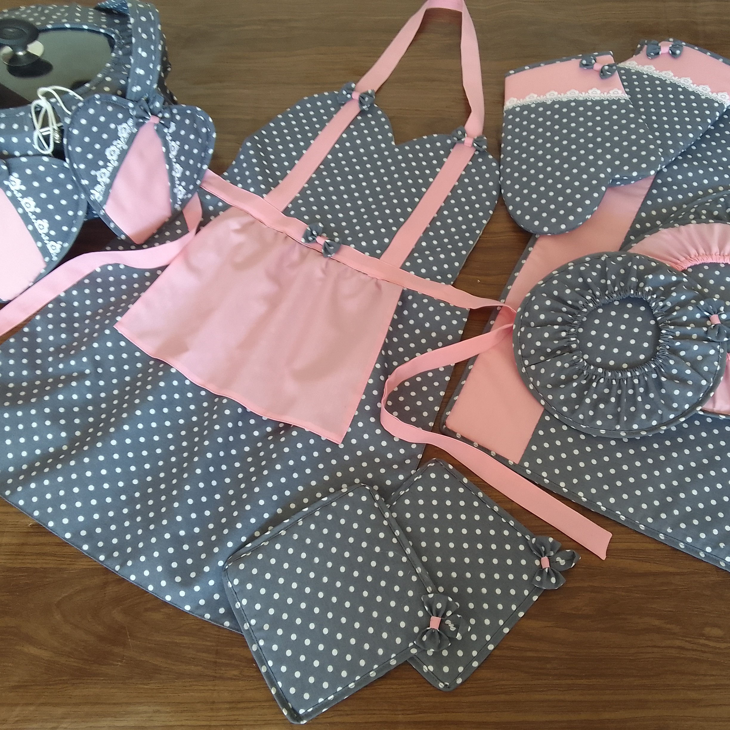 تکه ها شامل دمکنی سه عدد نمگیر پیشبند دستکش فر کاورقابلمه دستگیره قلب دوعدد دستگیره مربع دوعدد اسلاید دوم عکس نزدیک پارچه