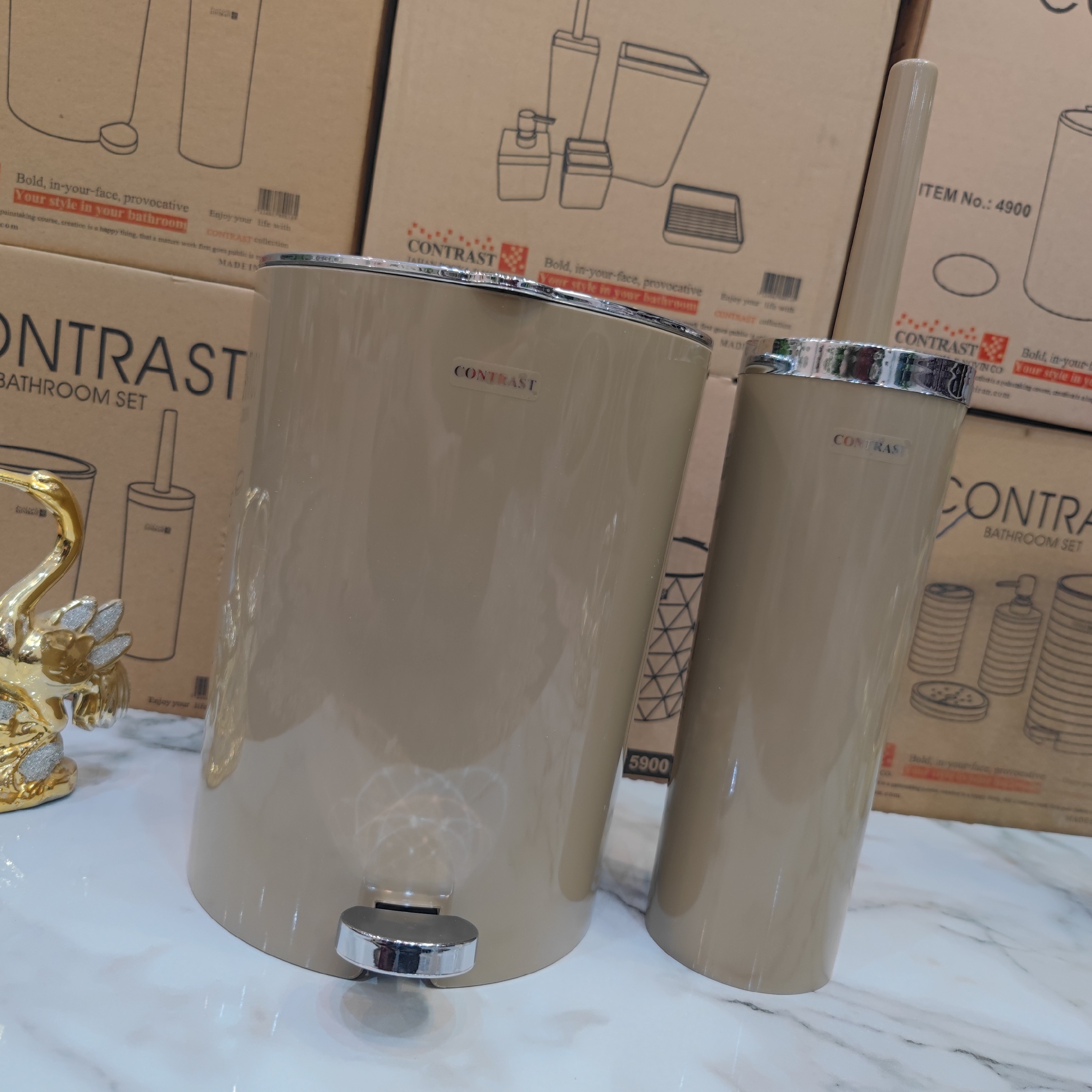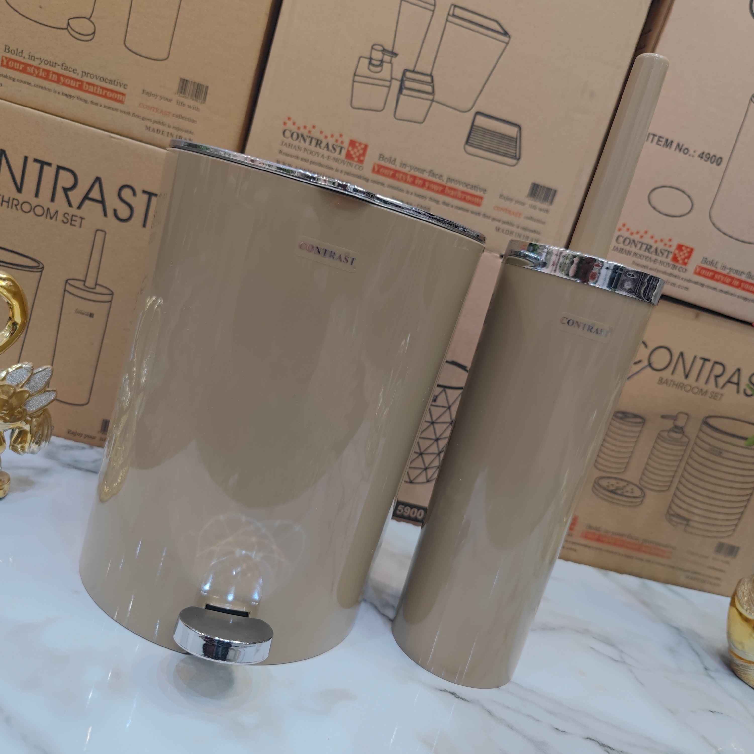 ست سرویس بهداشتی سطل و فرچه برند کنتراست نو آکبند رنگ زیبای نسکافه کروم همراه ارسال سریع