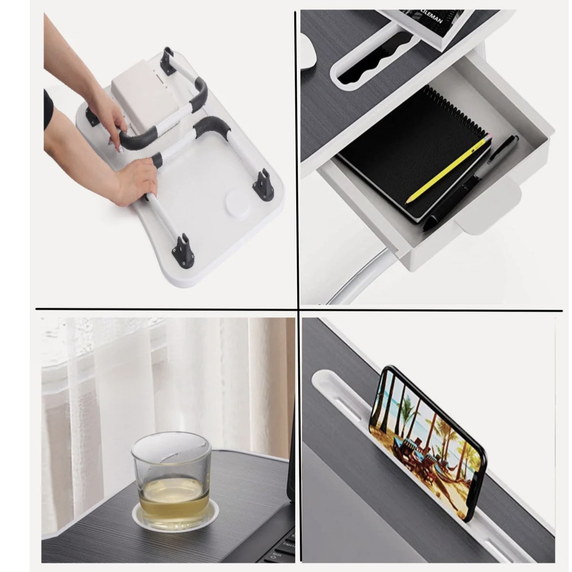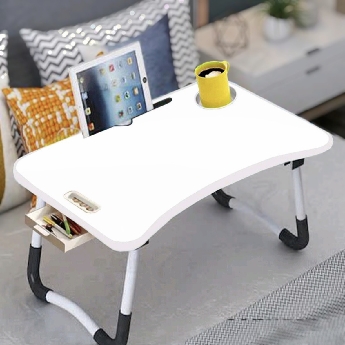 میز تحریر تاشو مناسب لپ تاپ و تبلت و گوشی با امکاناتی منحصر بفرد و با کیفیت ترین قطعات با صفحه ای از جنس ام دی اف و پایه های فلزی ضد لغزش شامل: جالیوانی، جاتبلت و گوشی دستگیره، جامدادی کشویی که در دو رنگ سفید و مشکی می باشند معمولا همگی سفید یا همه مشکی می باشند . به صورت تصادفی و یا به صورت سفارشی سایز: 45*65با ارتفاع 29سانتیمتر سفید براق وایت بردی 🌹لبه های میز با پی وی سی رنگ سفید کار شده 🌹 این میز مناسب برای استفاده روی زمین،تخت،مبل،بصورت نشسته یک میز سبک و قابل حمل🌹 این میز تاشو برای لپ تاپ، تبلت و تلفن همراه یا ساختن صنایع دستی مناسب است. همچنین می توان برای استفاده آن را روی مبل یا زمین بگذارید . قسمت بالای میز محلی به طول 28 سانتی متر طراحی شده است که می توان از آن برای قرار دادن موبایل ، تبلت ، کتاب و .... استفاده کرد و از دو شیار دایره ای شکل سمت چپ و راست برای قرار دادن قلم خودکار ماژیک و .... استفاده می شود. علاوه بر این یک نگهدارنده فنجان وجود دارد عمق آن 3.5 سانتی متر و قطر داخلی آن 7.5 سانتی متر است و بدون نگرانی از ریختن نوشیدنی ، فنجان خود را در آن قرار دهید. یک کشو در زیر میز بعنوان جامدادی قرار گرفته صفحه این میز از MDF درجه یک موجود در بازار ایران وقطر16میلیمتر ساخته شده و پایه لوله از جنس آهن با رنگ استاتیک ساخته شده است. این میز دارای طراحی خمیده ارگونومیک ، محکم و بادوام است و تحمل وزن تا 45 کیلو گرم را دارد. میز بسیار سبک و حمل آن آسان است. این میز نیازی به نصب ندارد و هنگام باز شدن می توان مستقیماً از آن استفاده کرد 🌹 می توان به عنوان یک میز کوچک پیک نیک نیز استفاده شود.🌹 🌹🌹🌹🌹🌹🌹این میز بصورت بدون جای دسته ویا هر تغییر قابل اجرا هم قابل سفارش می باشد فقط قبل از خرید هماهنگ کنید🌹🌹🌹🌹🌹🌹