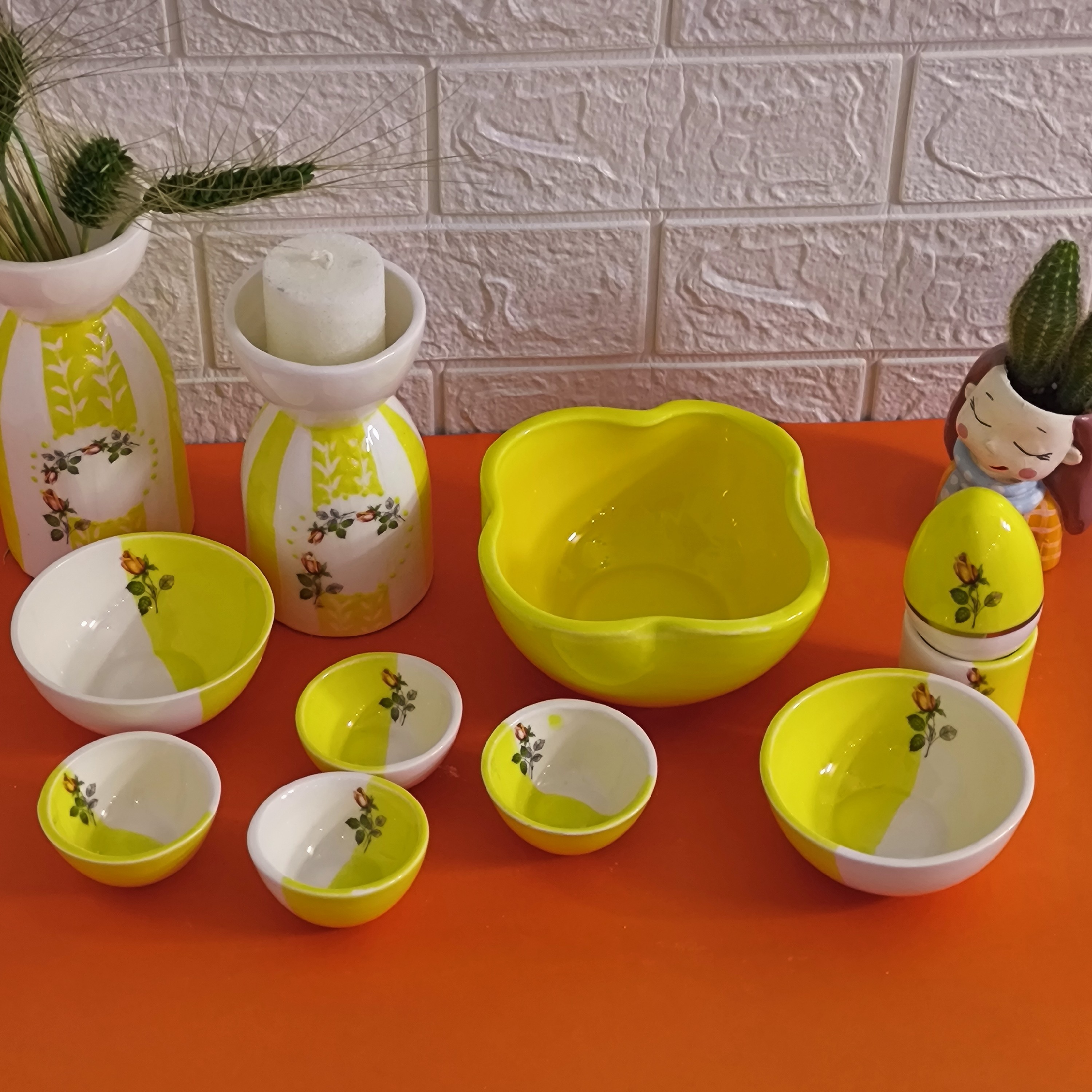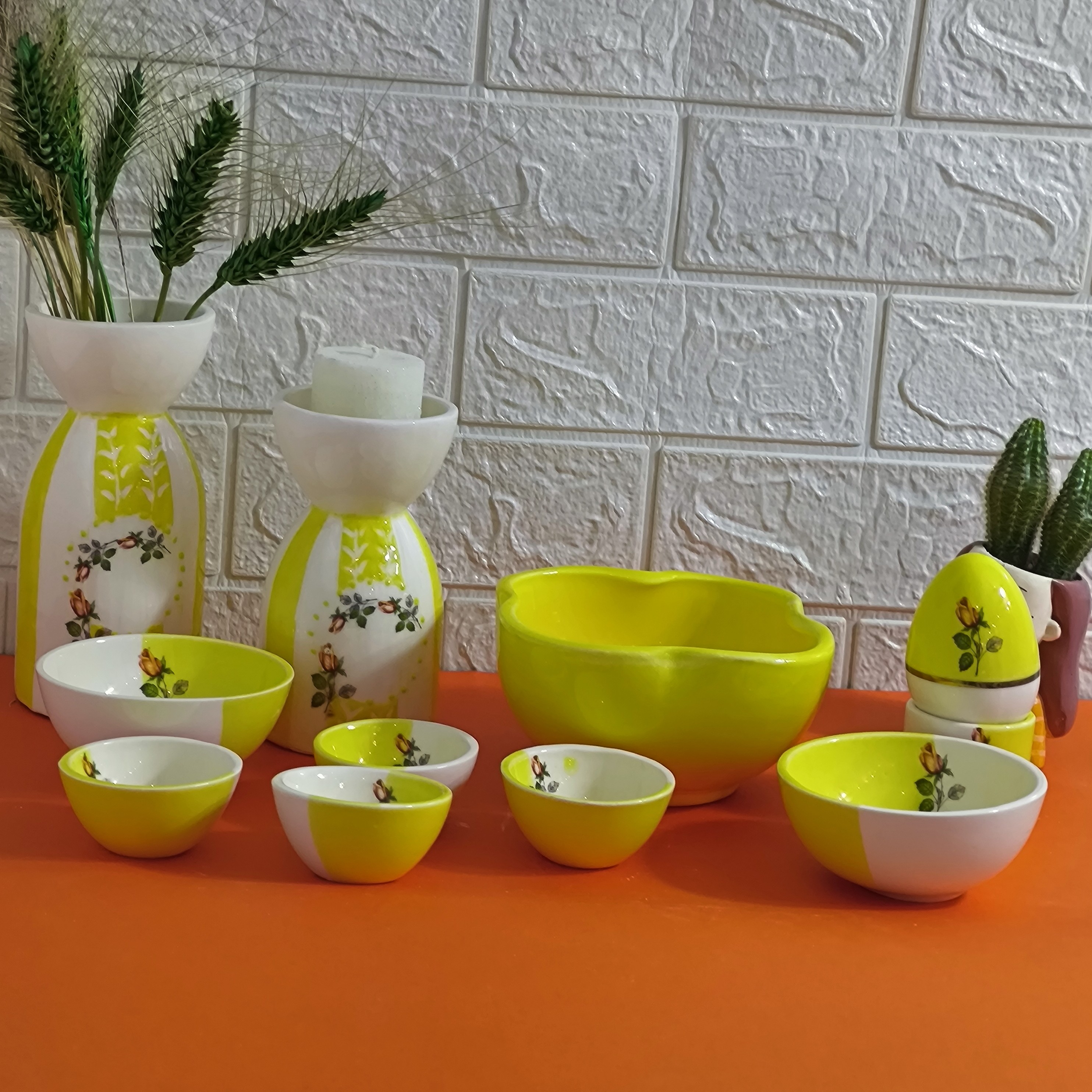 هفت سین سرامیک به رنگ زرد وسفید .کاملا وصرفی وقابل شستشو مناسب هفت سین .سرو تنقلات وخوراکیهای سرد وگرم