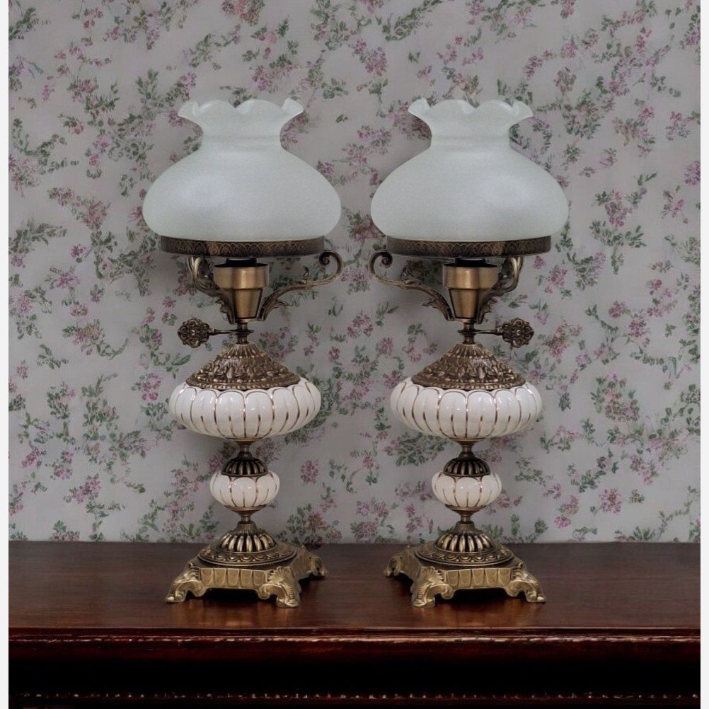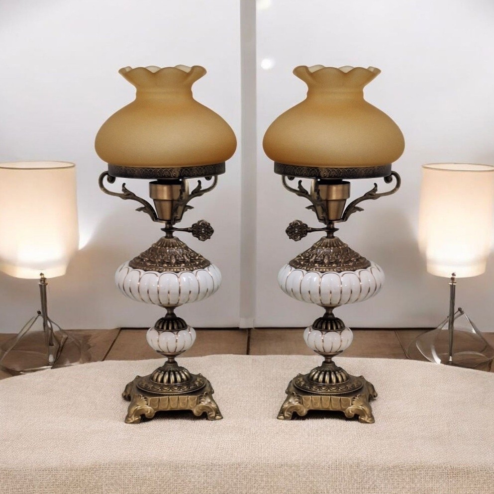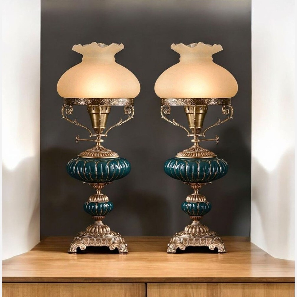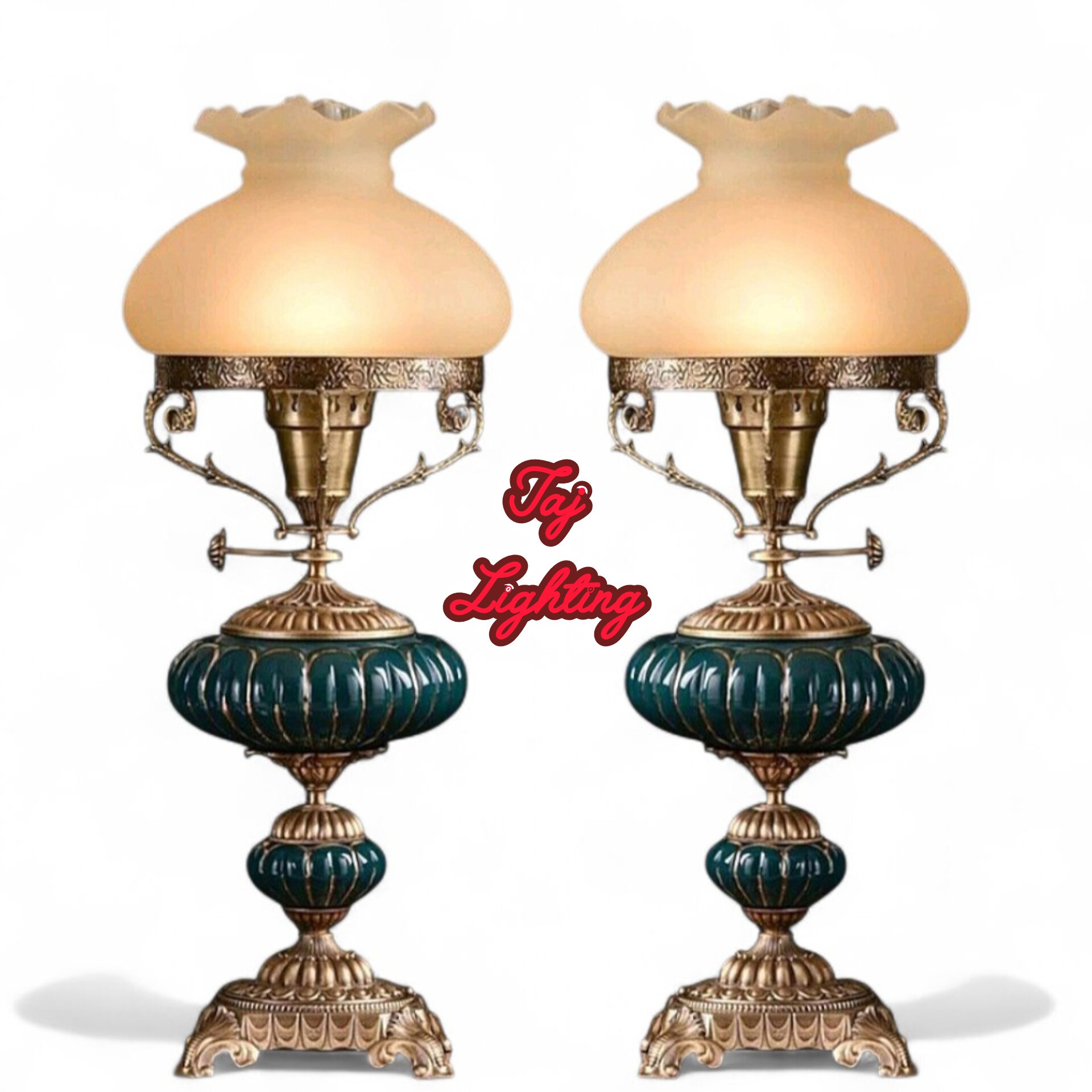 💥قیمت درج شده ، قیمت هر عدد چراغ می باشد جنس لاله : بلور رنگ لاله : عسلی مات جنس وسط تنه : چینی رنگبندی وسط تنه : یشمی، زرشکی، سورمه ای ، فیروزه ای ، سفید ، جنس پایه برنز با آبکاری آنتیک