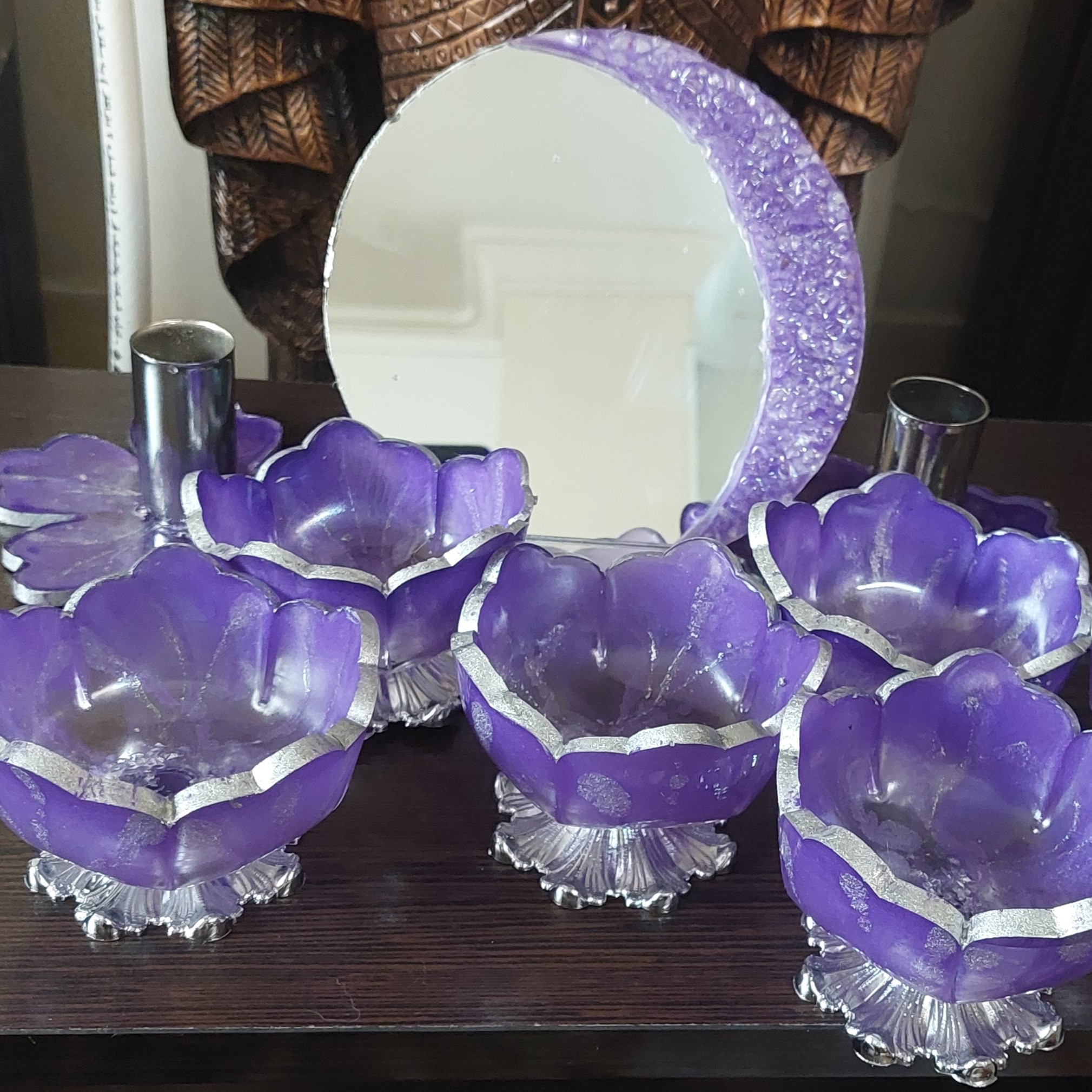 6 عدد کاسه با قطر دهانه 9 سانت و ارتفاع 4 سانت ارتفاع پایه 2 سانت و دوعدد شمعدان و یک اینه به قطر 15 سانت قابل سفارش در رنگهای مختلف میباشد.قابل شستشو با اسفنج نرم و مایع ظرفشویی ملایم