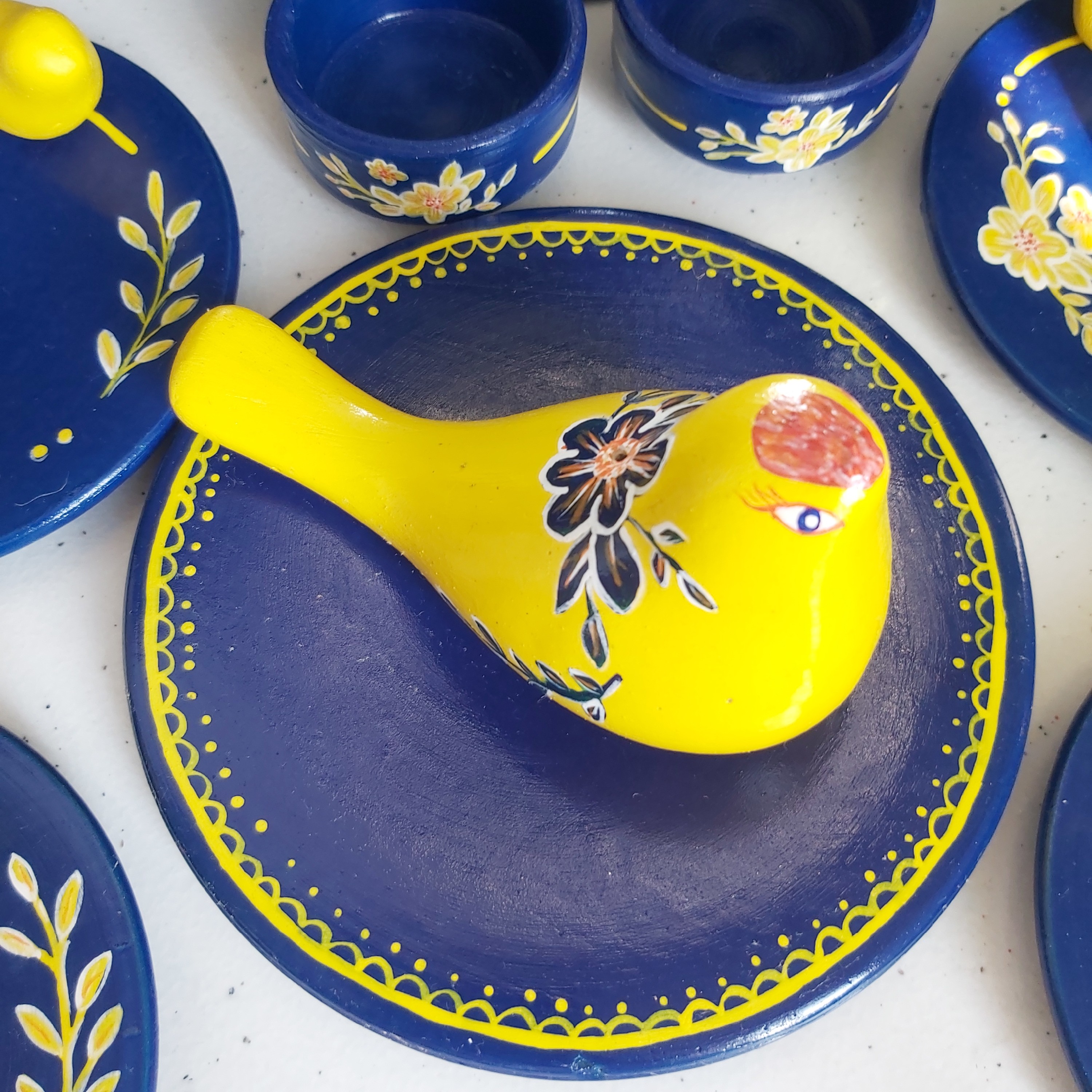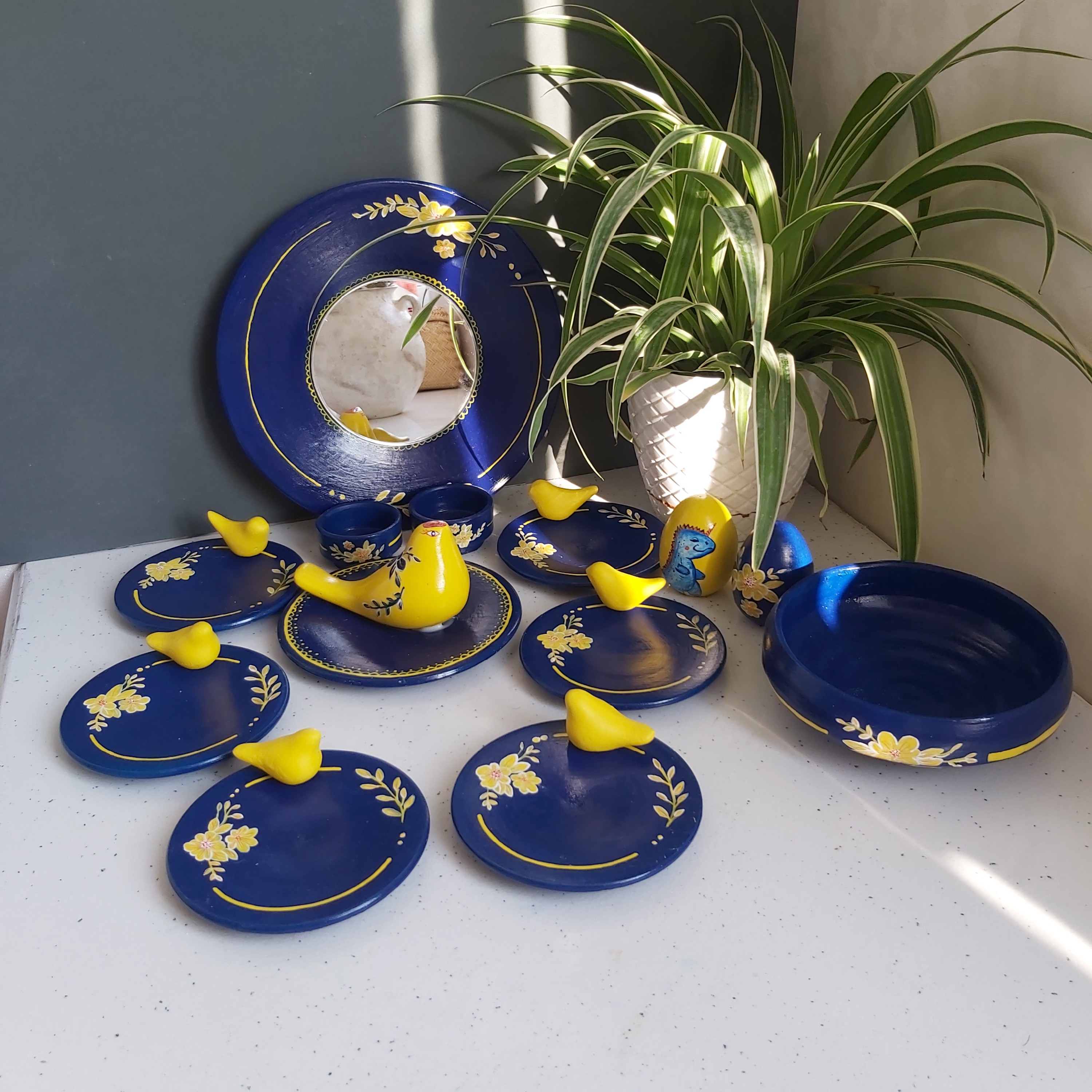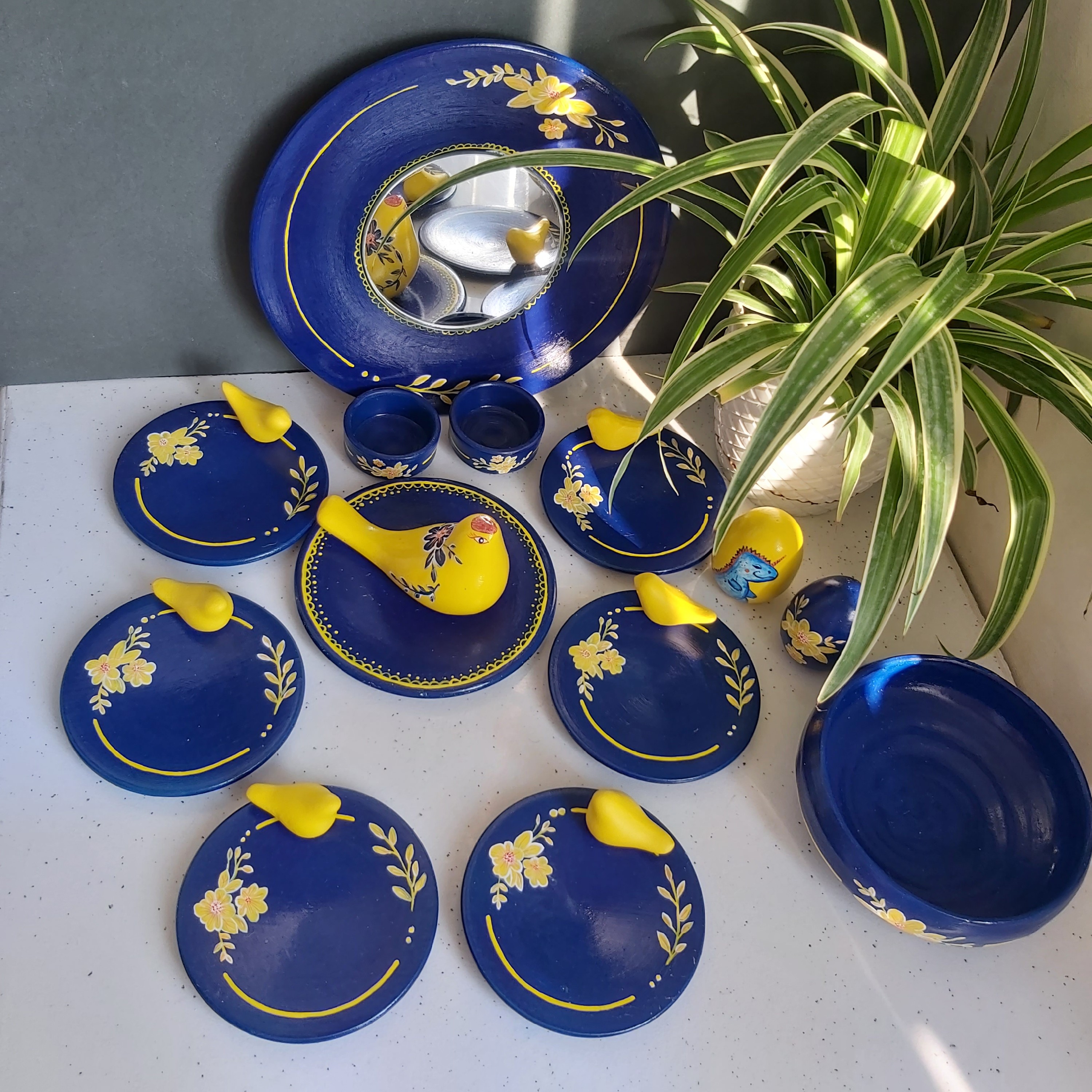 هفت سین سرمه ای گل زرد سال 1403 شش عدد بشقاب جوجه دارقطر 12سانتیمتر آینه دوعدد تخم مرغ جاعودی و ظرف سبزه دوعدد شمعدان مبلمونسرا مدل 259116