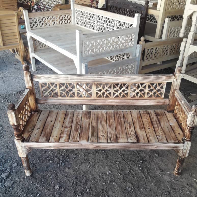ساخته شده با چوب سفید سپیدار ایرانی خشک کف روسی . پایه خراطی . با تکیه گاه دوشاسی ضخیم و مقاوم در برابر سرما و گرما . مناسب برای سه نفر
