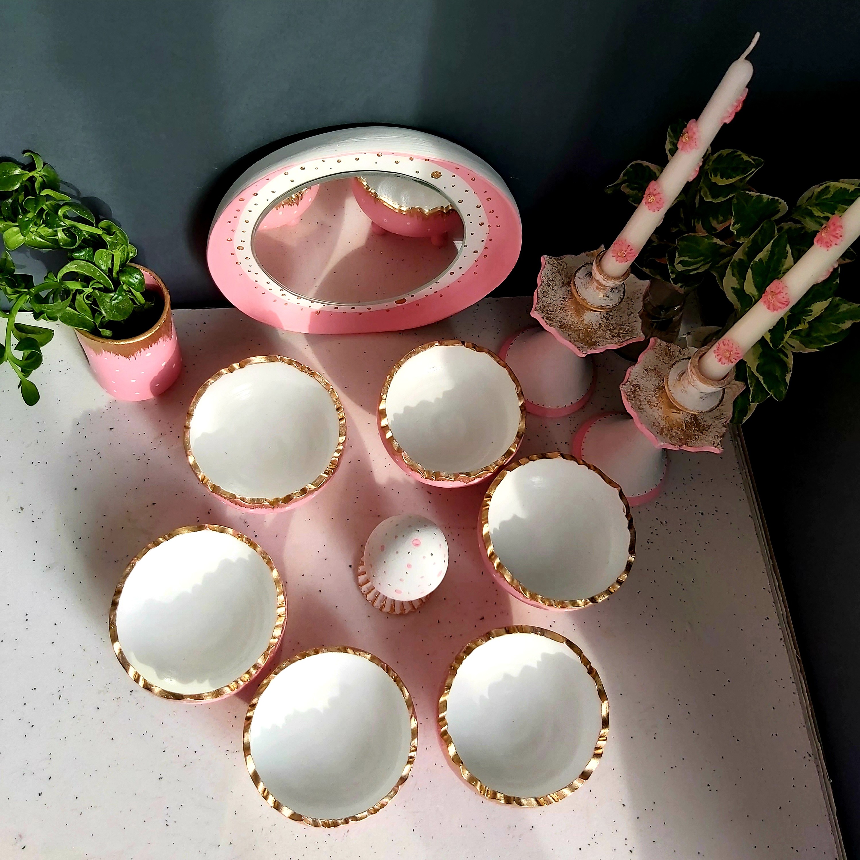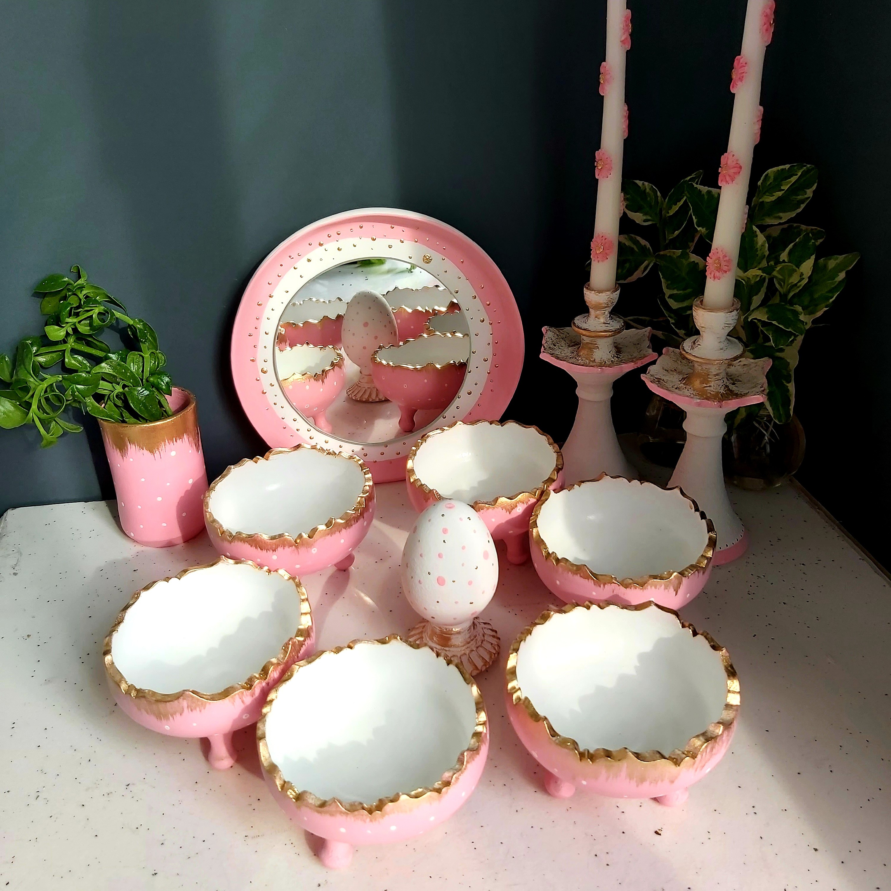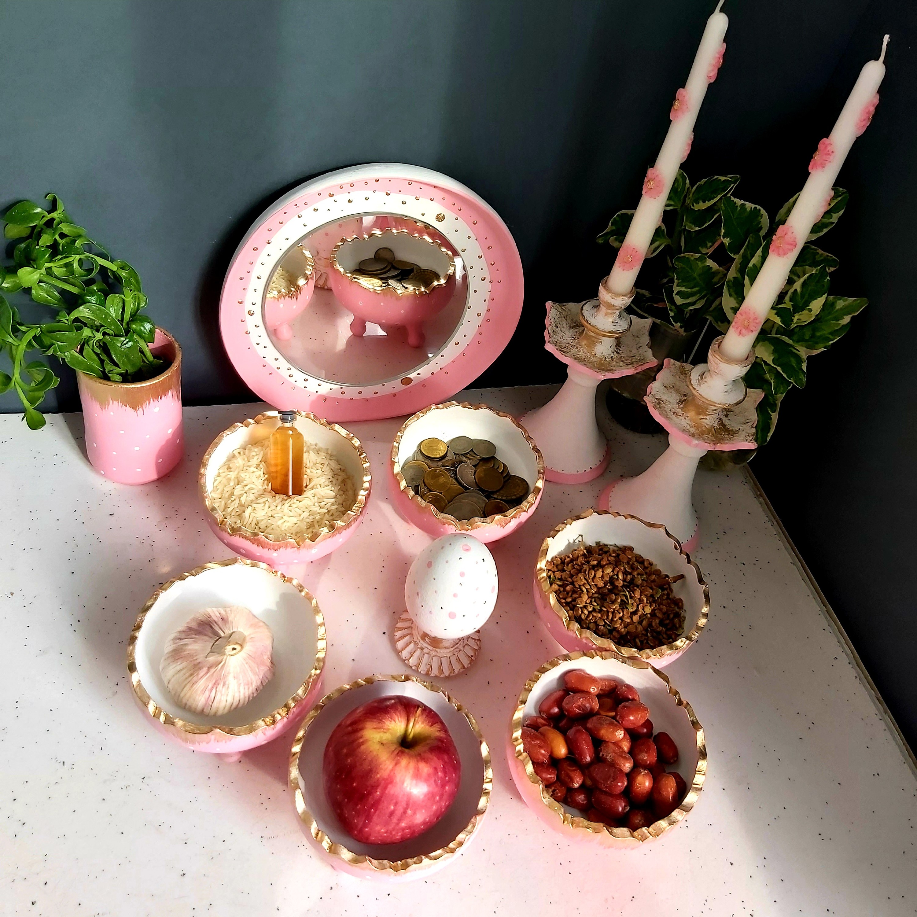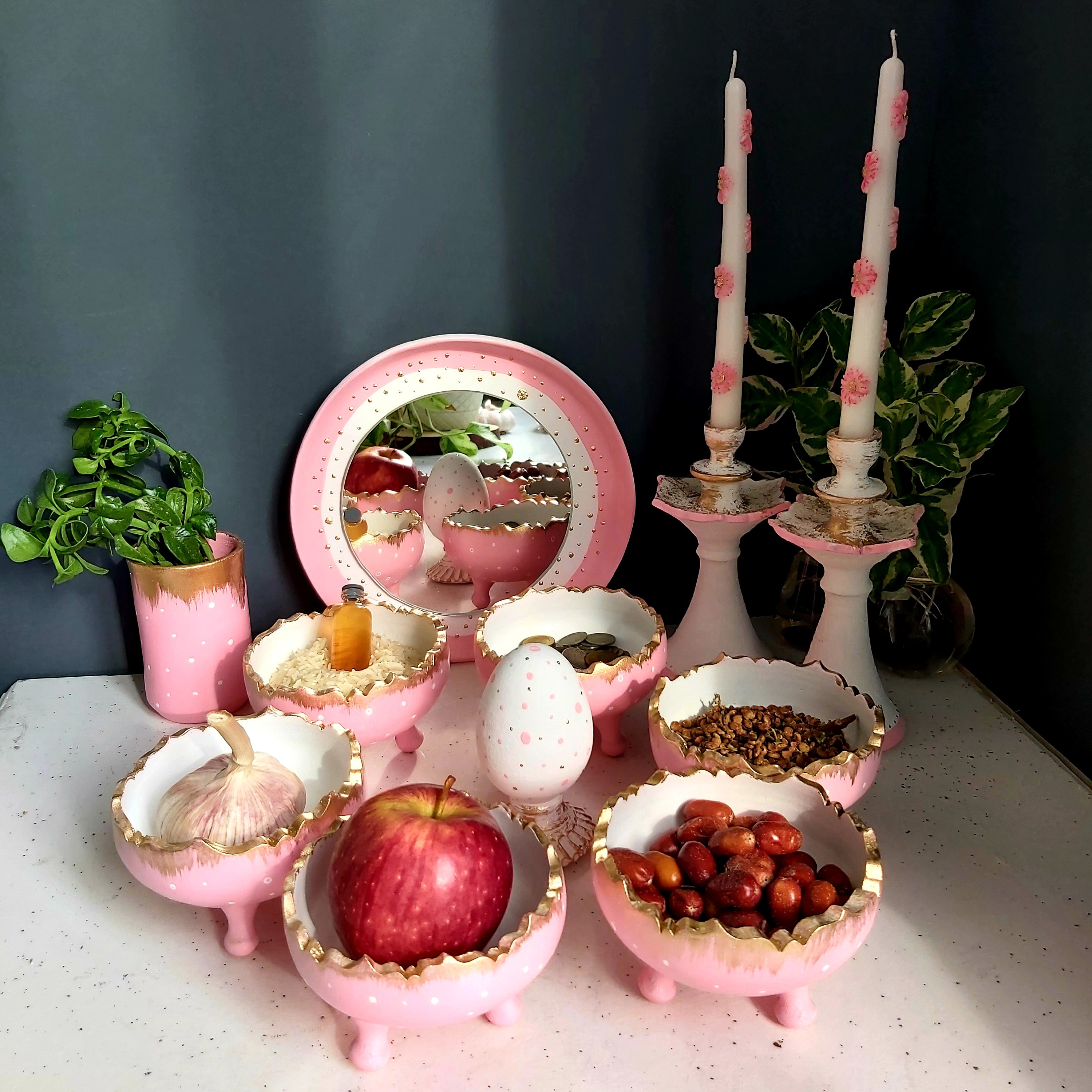 هفت سین صورتی و سفید و طلایی 11تیکه دارای 6ظرف و دوشمعدان و آینه و گلدان و تخم مرغ پایه دار مبلمونسرا مدل 259010