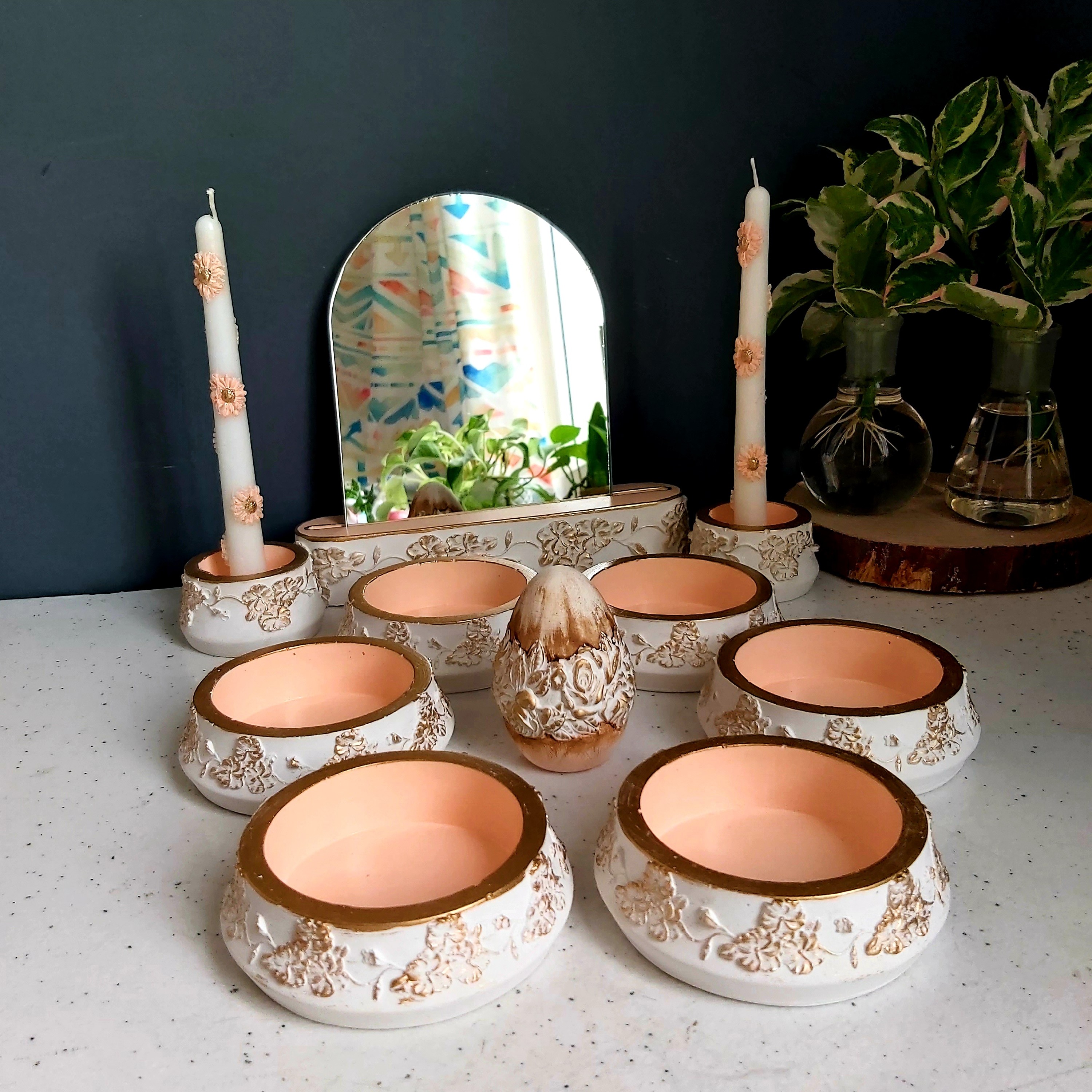 6کاسه ابعاد 10×3/5،پایه آینه ابعاد 22×4×5،تخم مرغ ارتفاع 8،شمعدان 7×4،،آینه ابعاد 19×23