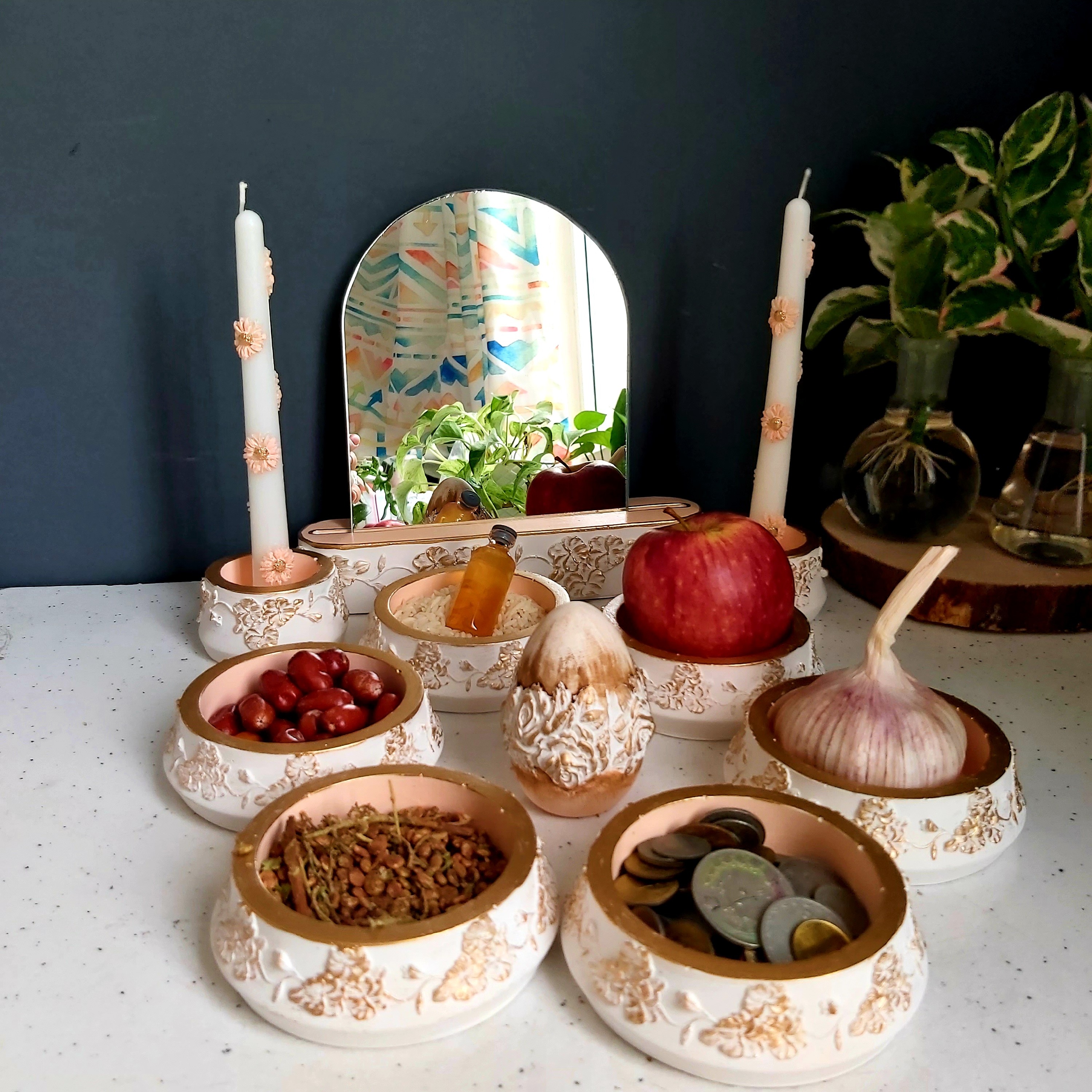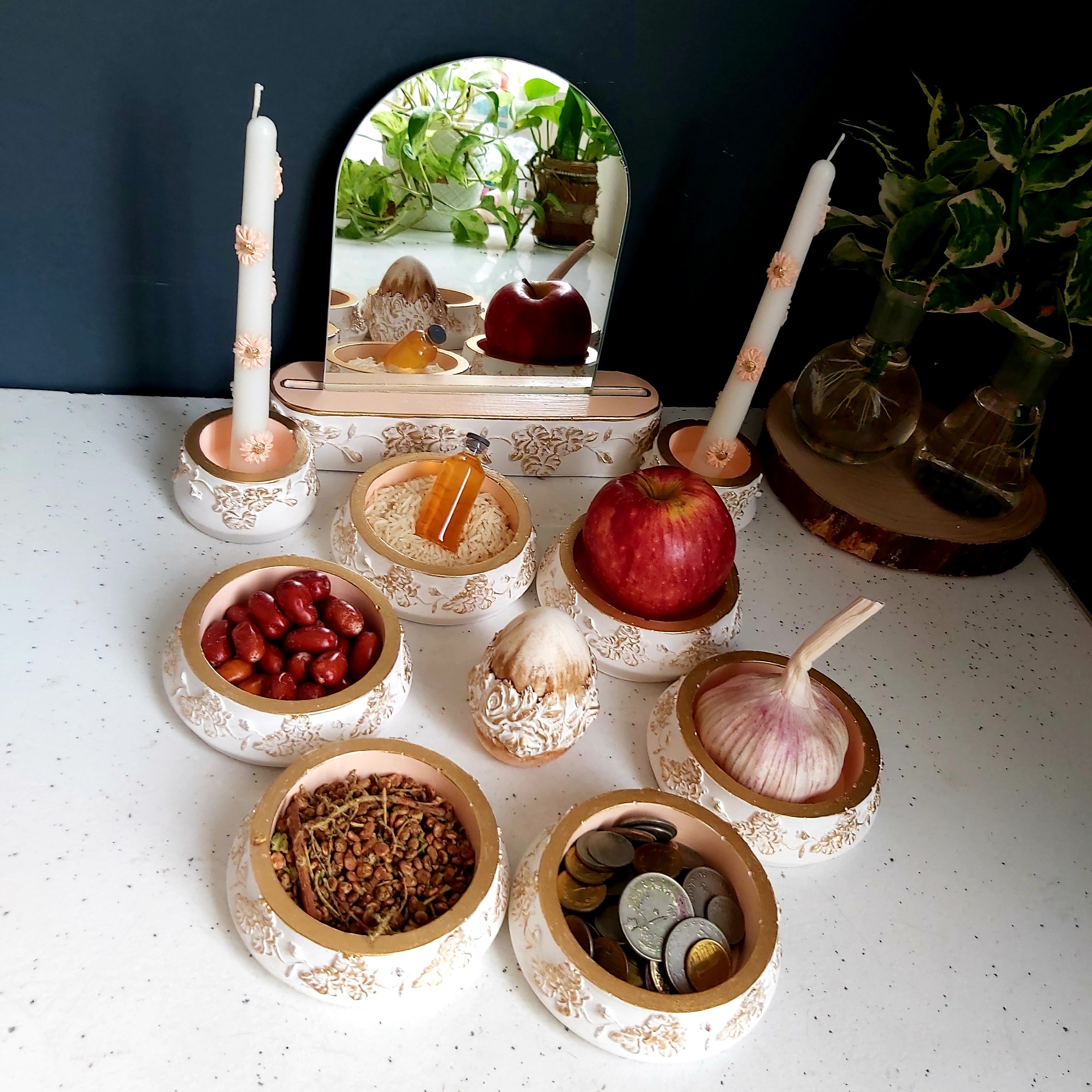 هفت سین گل برجسته رنگ سال1403 سیزده تیکه دارای 6ظرف و دوعدد شمعدان و یک عدد تخم مرغ و یک عدد آینه بهمراه پایه مبلمونسرا مدل 260759