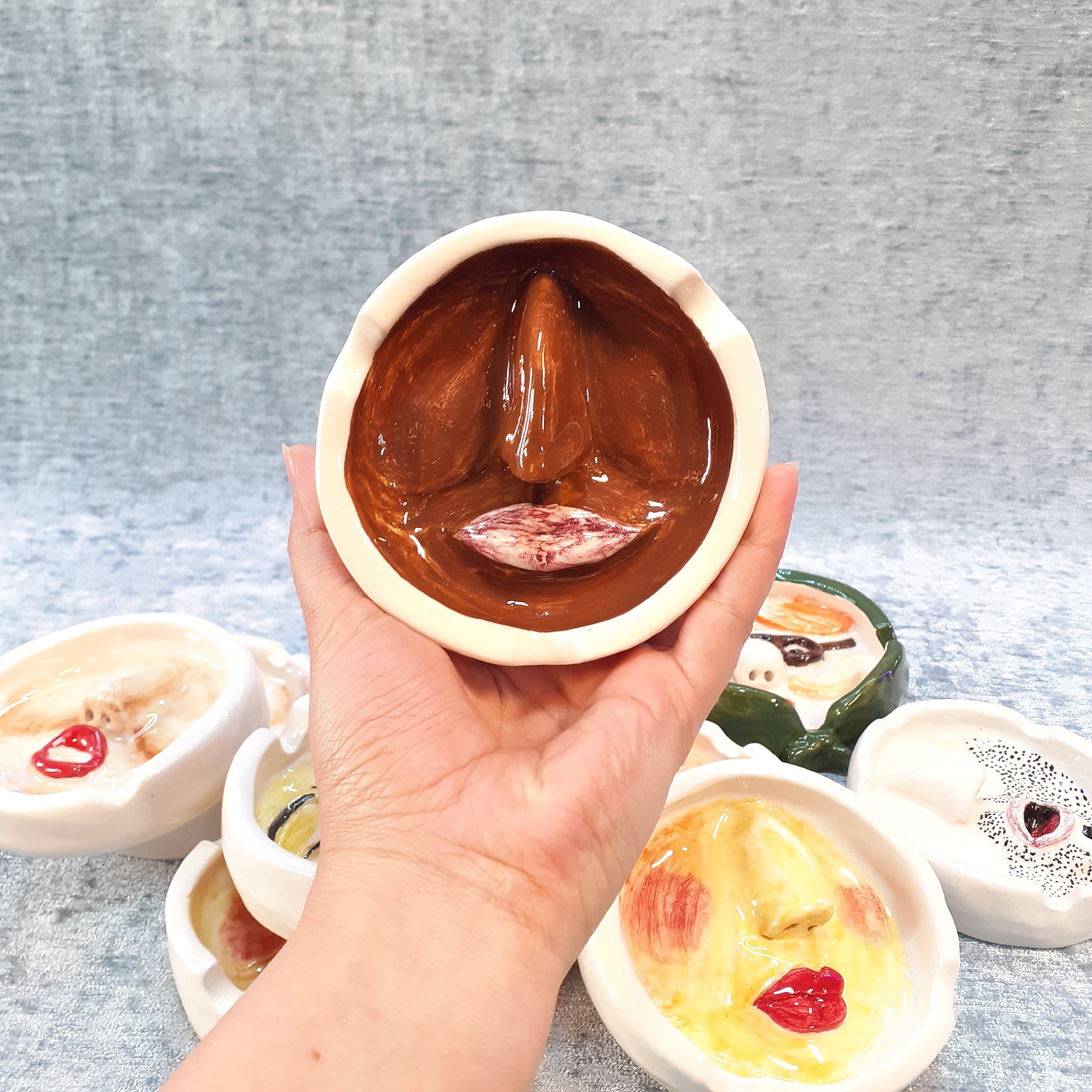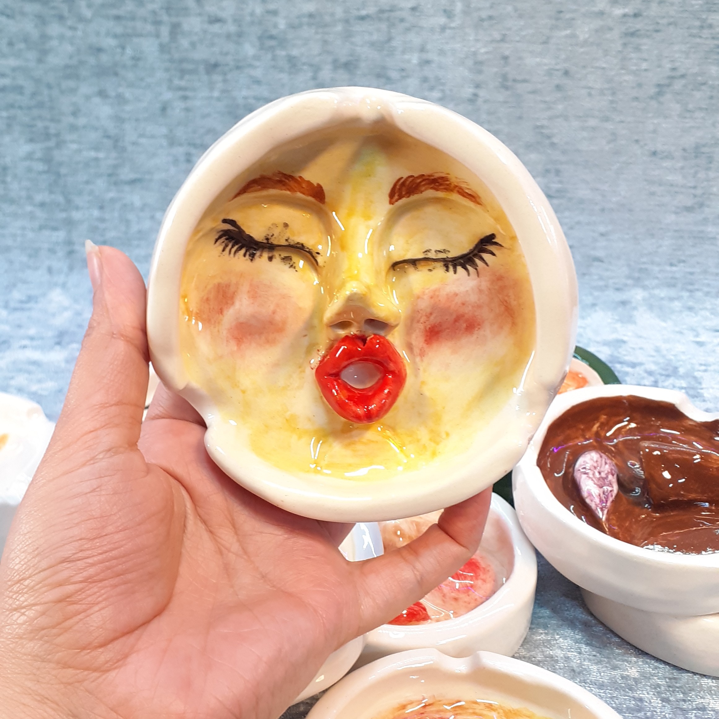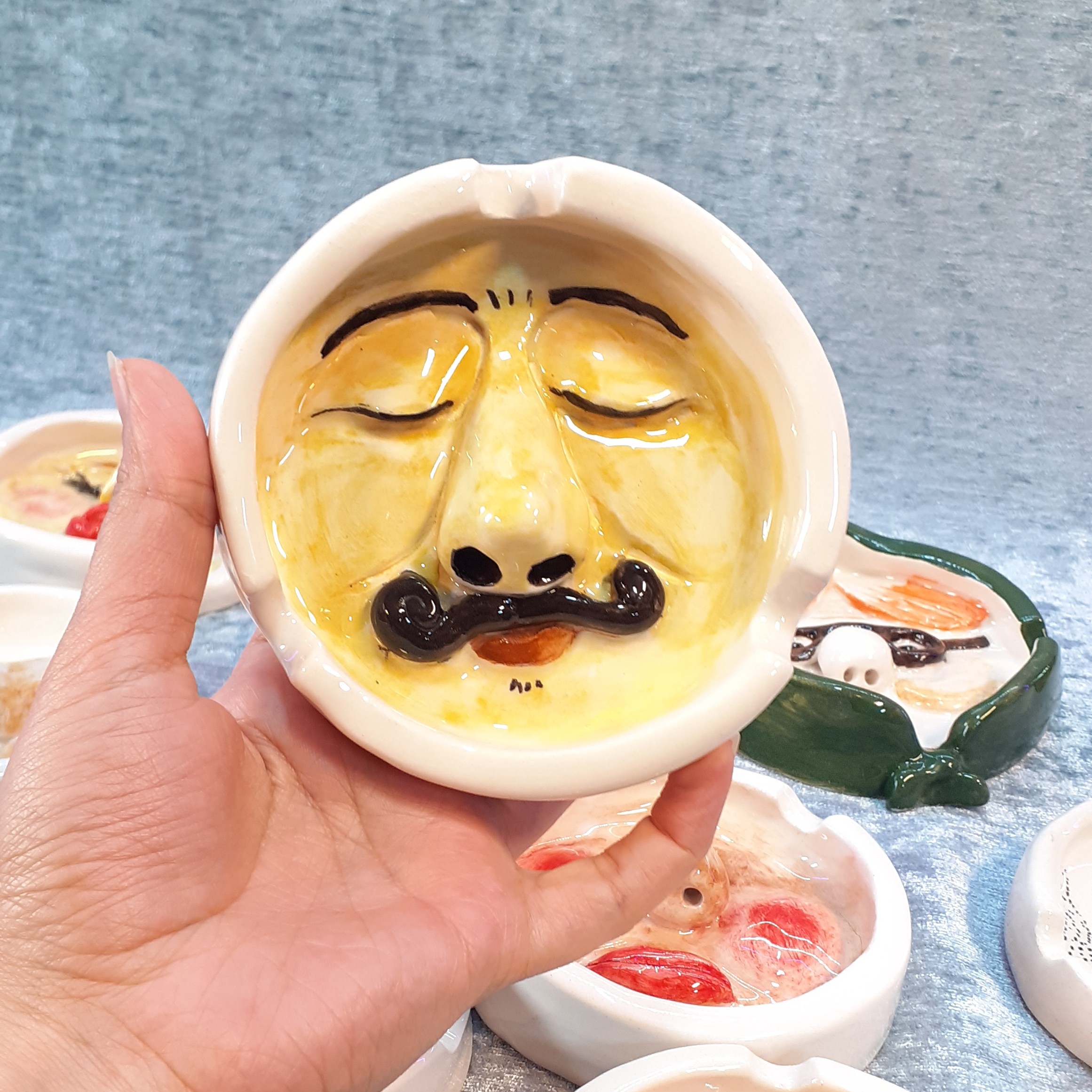 زیرسیگاری سرامیکی دست ساز صورت دار طرح برجسته قابل شستشو و رنگ ثابت کمی حالت دفرمه دارد