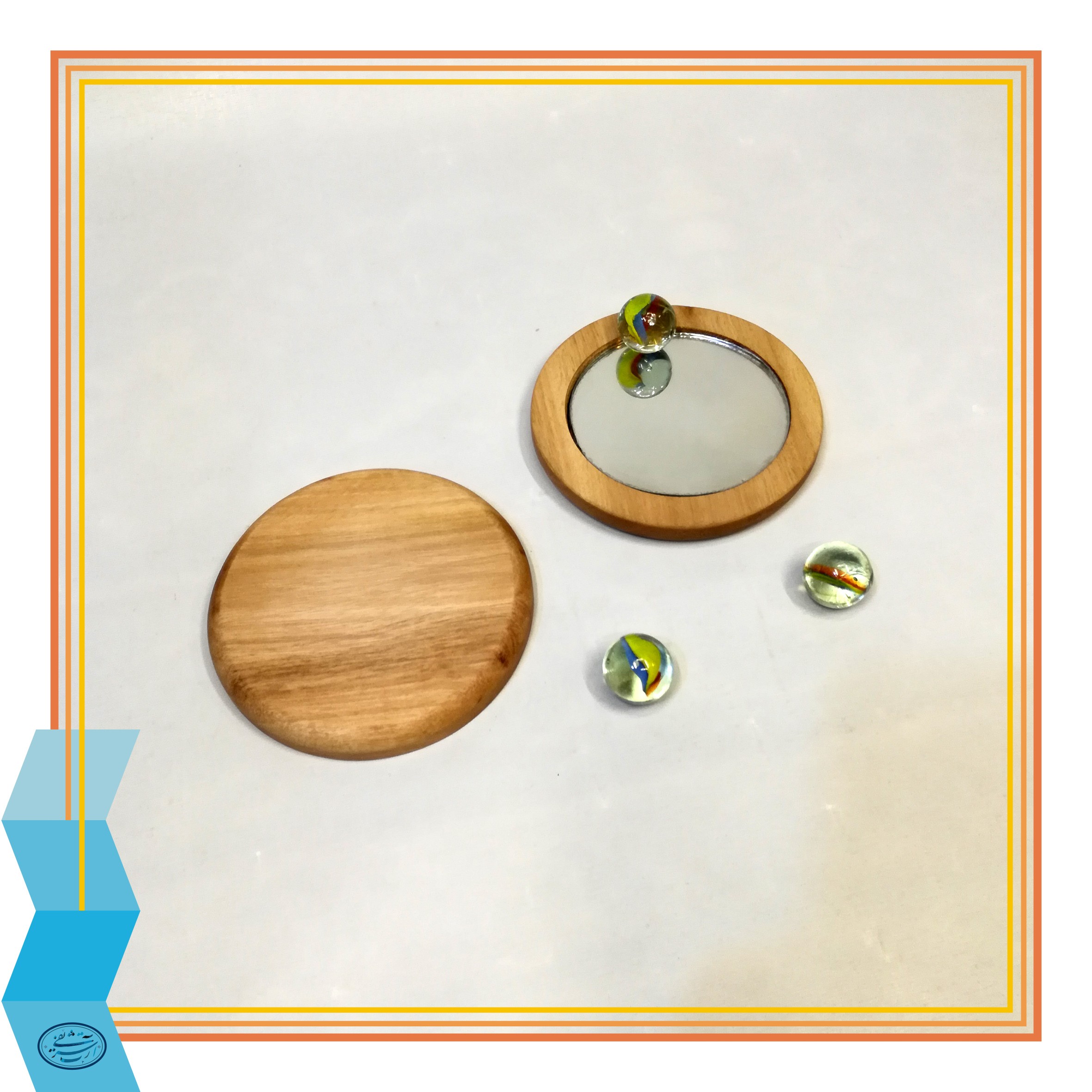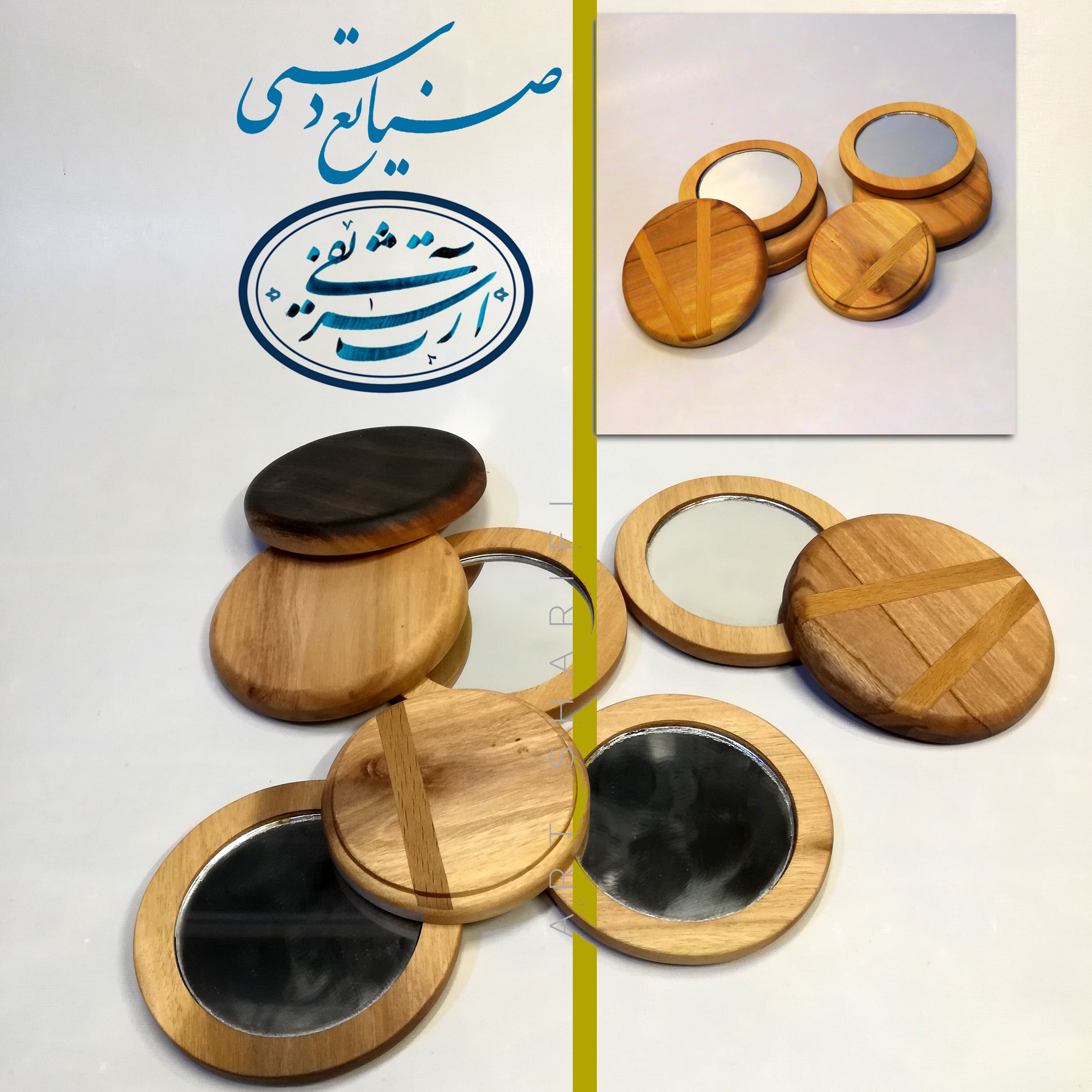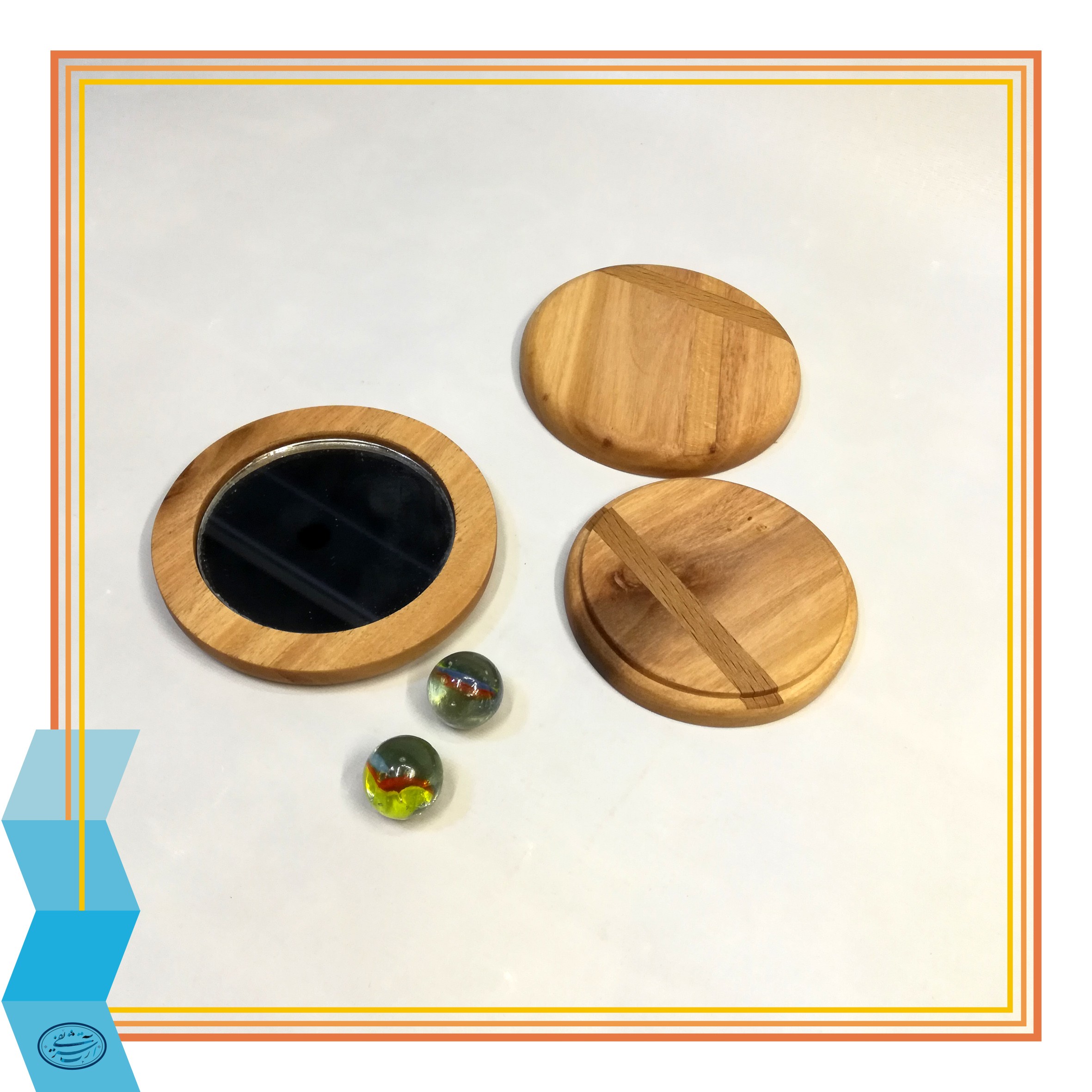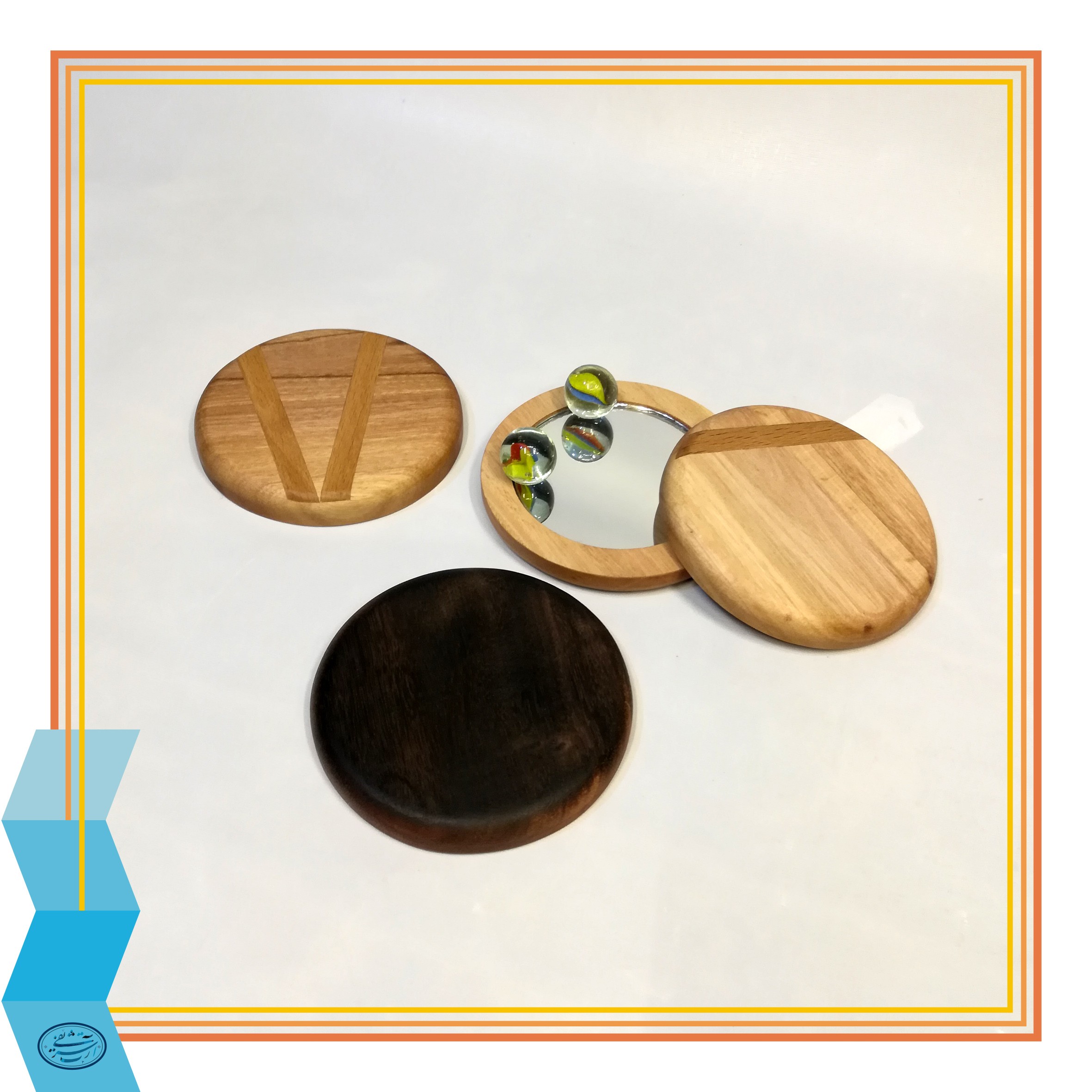 این آیینه های کوچک جیبی با چوب اکالیپتوس ساخته شده و در پشت بعضی نوارهای چوبی متفاوتی کار شده که قیمت آن را کمی متفاوت کرده است