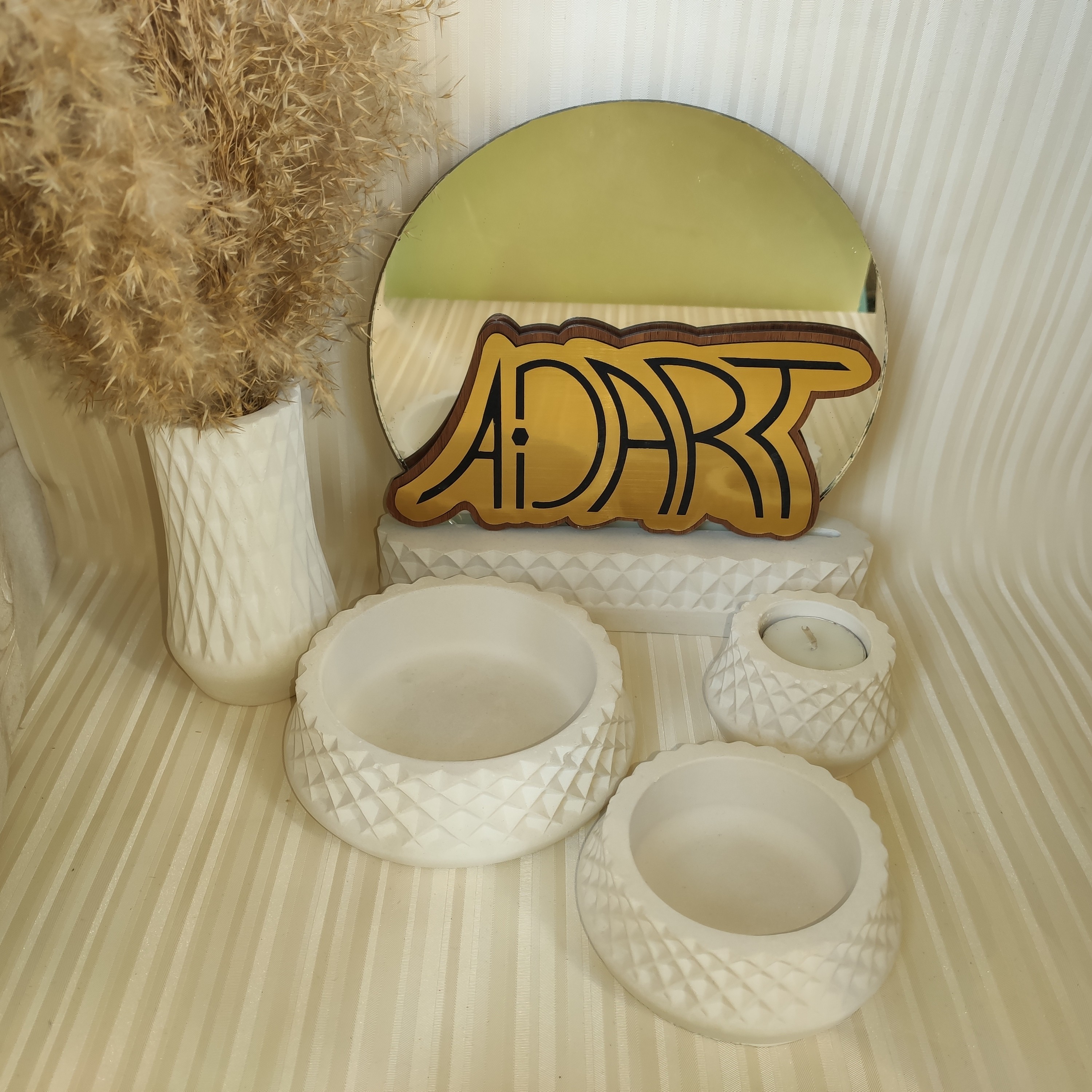 هفت سین لوزی مدل هفتسین مهسا 11 تیکه همراه با گلدان ، پایه آینه ، جاشمعی ،ظرف هفتسین ،جا سبزه سنگ مصنوعی بتنی مبلمونسرا مدل 259187