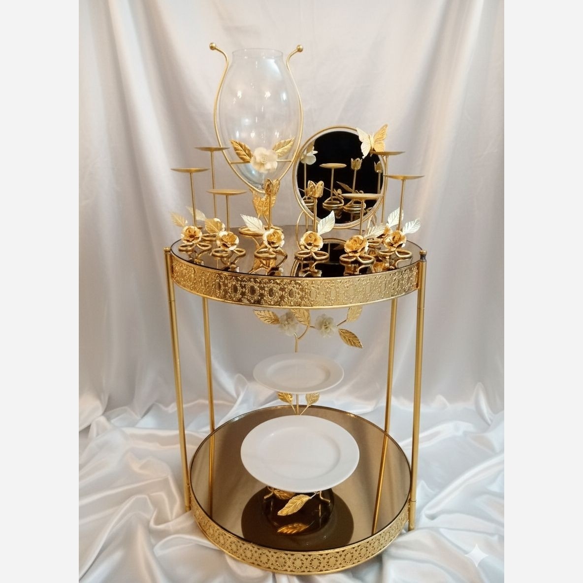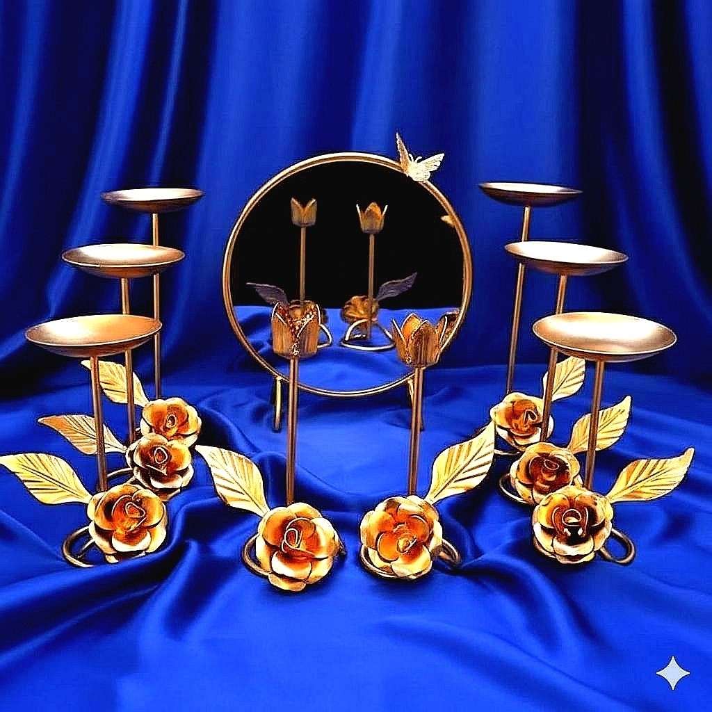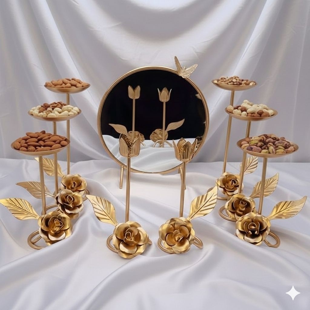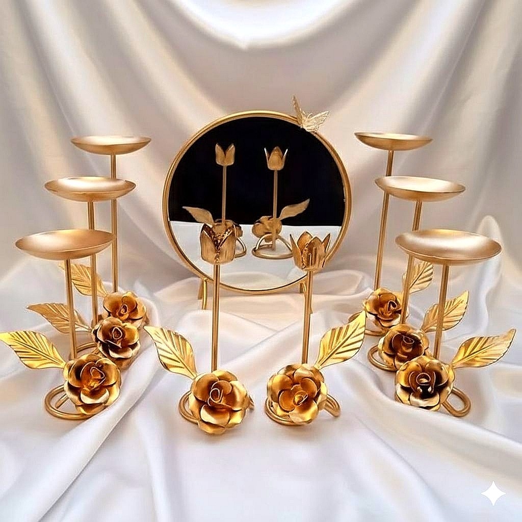 ست زیبای 9 پارچه هفت سین گل رز که بارنگ طلایی اکرلیک متالیک با گل تای رز درشت وبرگ های پیچ طرح دار که جلوه لوکس بودن به فضای منزل شما در میهمانی ها و دور همی هایتان میدهد و سالها به رغم کیفیت و رنگ خوب که دارد در منزل شما جلوه گری میکند و نظر همه را به خود جلب میکند طرح گل و برگ از ژرنال ROZET فرانسه تک و عمده ارسال به کل کشور ما همه جوانب را در نظر گرفته ایم و کار رابرای شما آسان کرده ایم ابعاد👌 کیفیت رنگ👌👌 قیمت👌👌 میز هفت سین با آینه های شامپاینی کنار سالنی ست لوکس هم قابل سفارش میباشد به شدت پیشنهاد میشود ومن اله توفیق