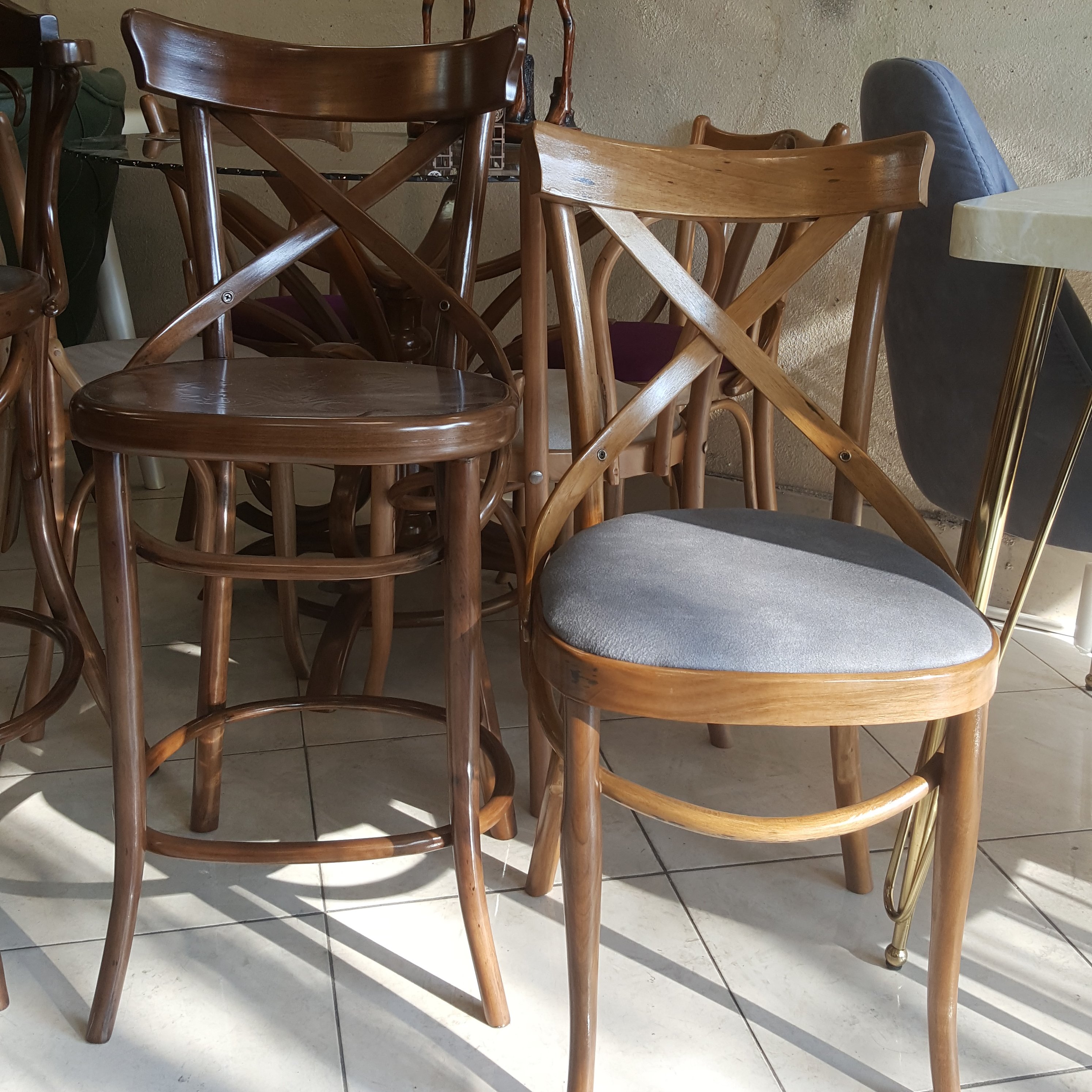 این صندلی مدل اوپن یا همون کانتر هست ارتفاع معمول رو هم داریم از چوب گردو ساخته شده کلیه اجزا خم کاری میباشد نشیمنشون پارچه ایی و چوبی میتونه باشه چوب و پارچه هر رنگی بخوایین تقدیم میکنیم