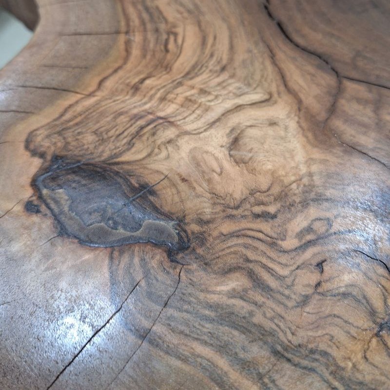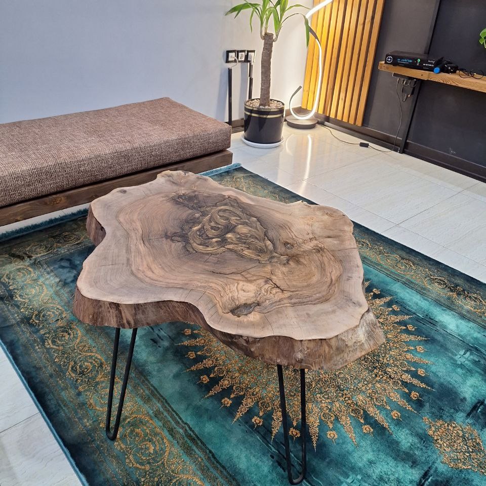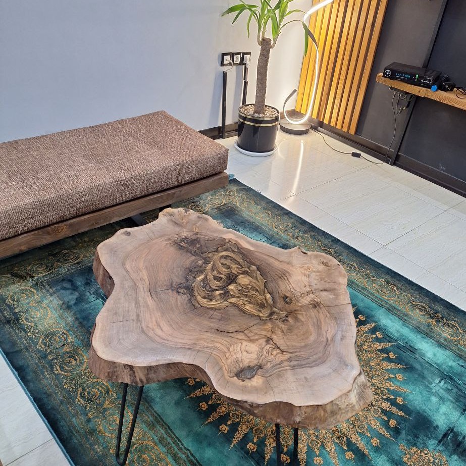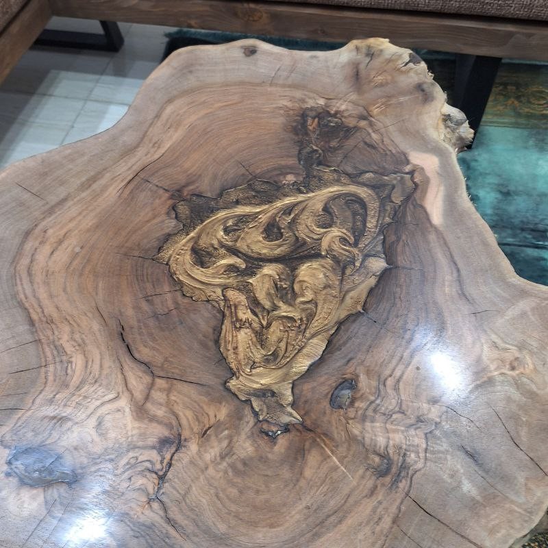 جلومبلی چوب گردو و رزین روغن گیاهی کرال خورده. حفره ها با رزین رنگ قهوه ای طلایی پر شده. پایه سنجاقی مشکی یا چوبی مشکی. ست کار با عسلی موجود میباشد .