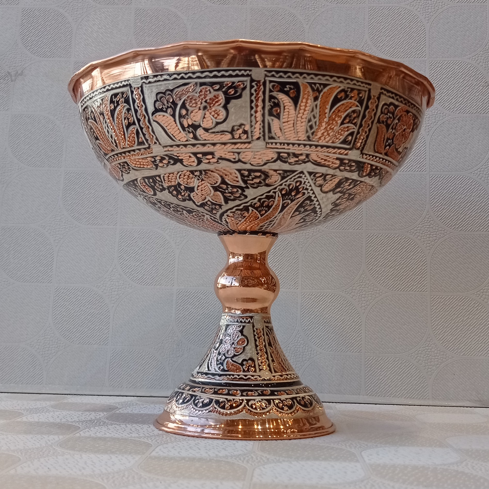 جام مسی نقره کوب سایز 4نانو الماس تراش و نقره کوبی شده میباشد . ارتفاع : 23سانتی متر قطر : 25سانتی متر مناسب برای میوه , آجیل و ...
