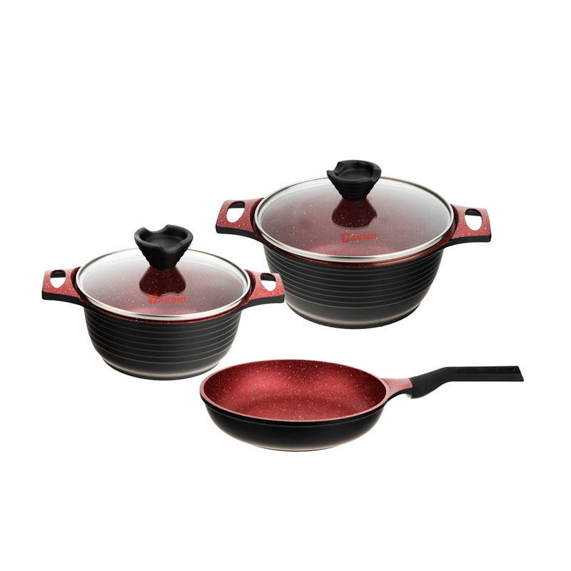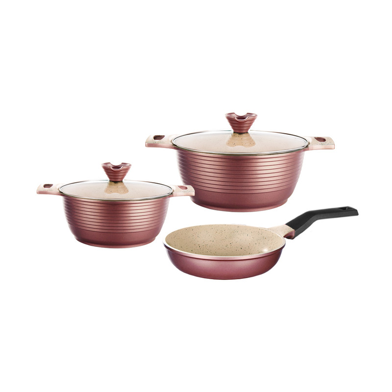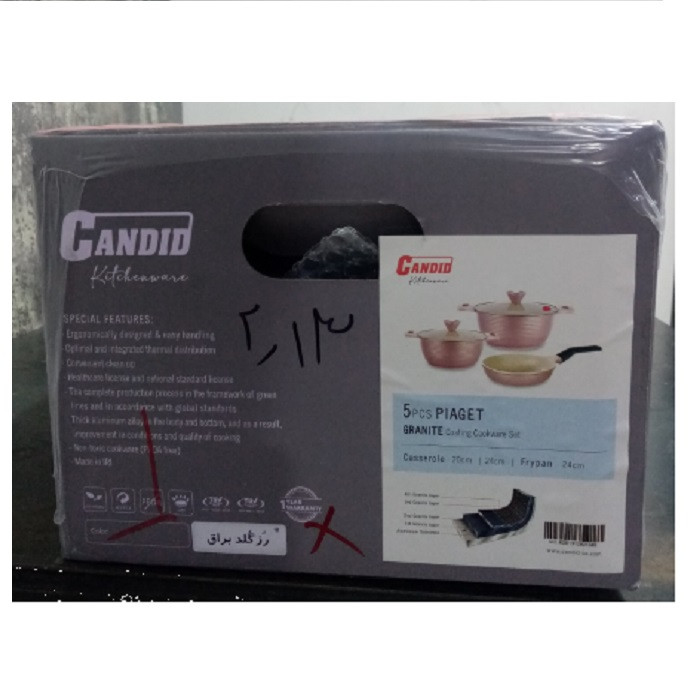 سرویس پخت و پز 5 پارچه مدل پیاژه پلاس با پوشش گرانیت در رنگبندی رزگلد و دودی و مشکی می باشد که دارای قابلمه های سایز 20 و 24 و یک عدد تابه تکدسته سایز 24 است.