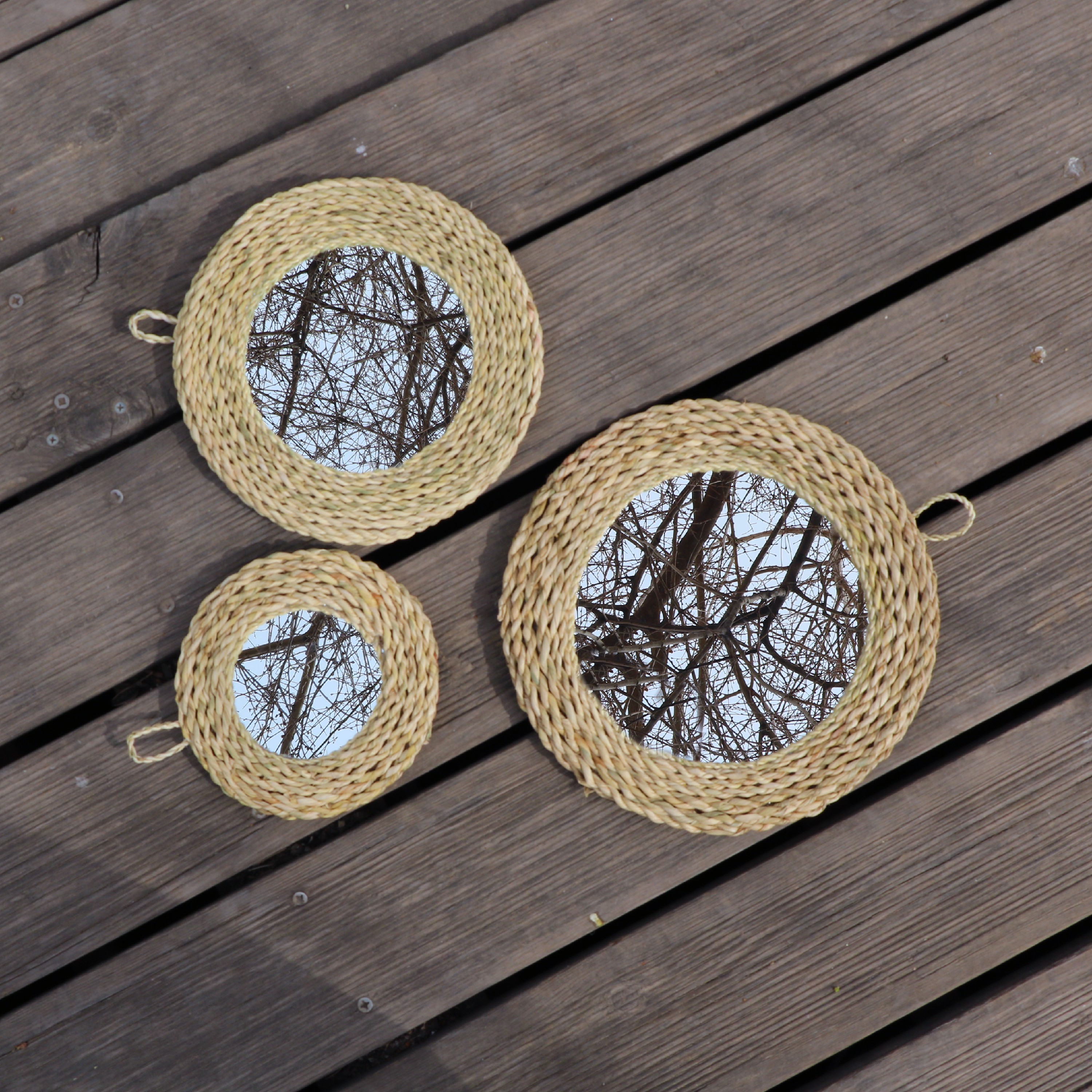 این اینه های حصیری شامل سه سایز می باشند . 👌👌👌 در تصویر دوم هر سه رو کنار هم عکاسی کردیم تا تفاوت سایز رو متوجه بشید . ❌️❌️ اینجا براتون سایز کوچیک رو معرفی می کنم . 😊👌 🌱 هم می تونید روی پایه قرار بدید برای هفت سین و هم می تونید آویز کنید. 👌👌