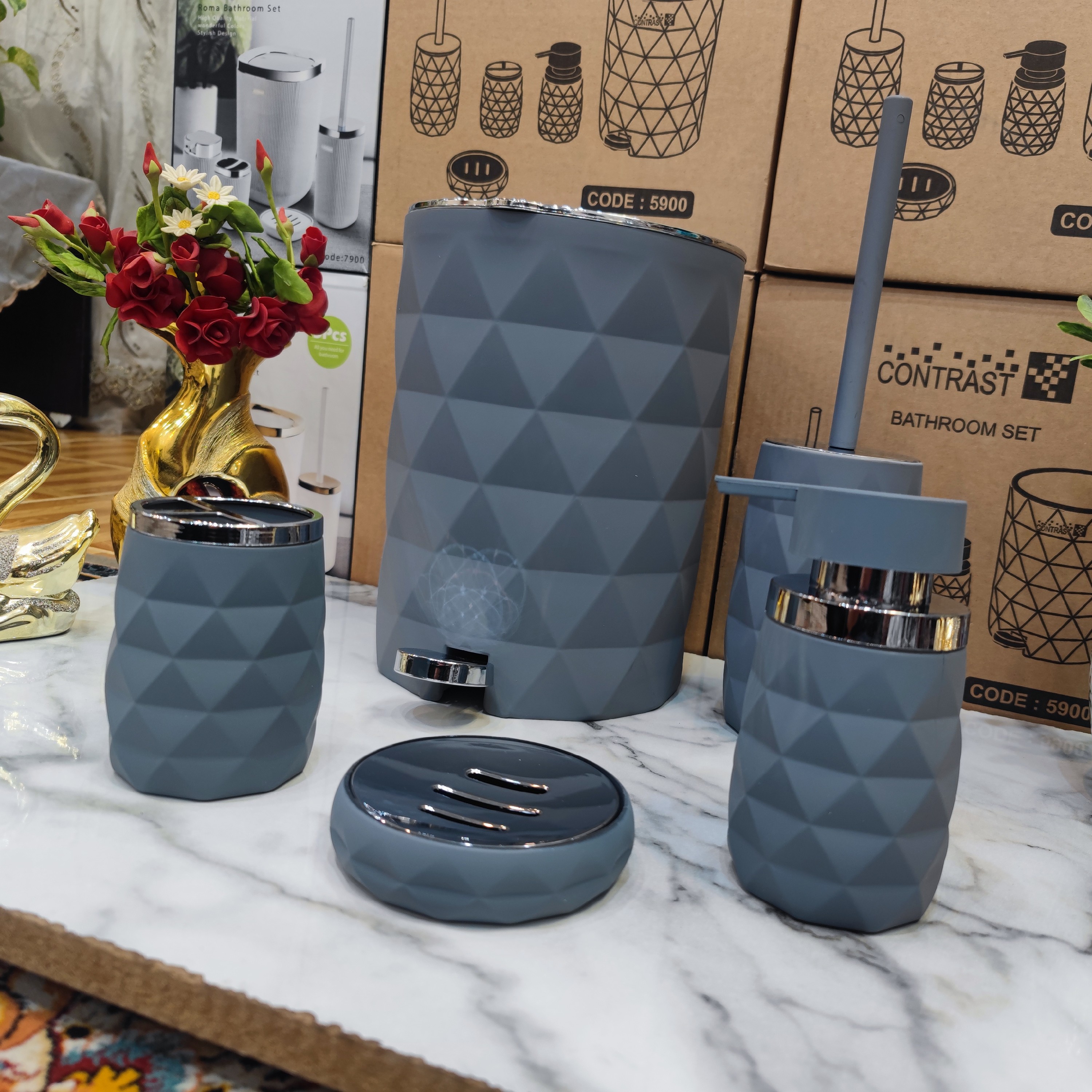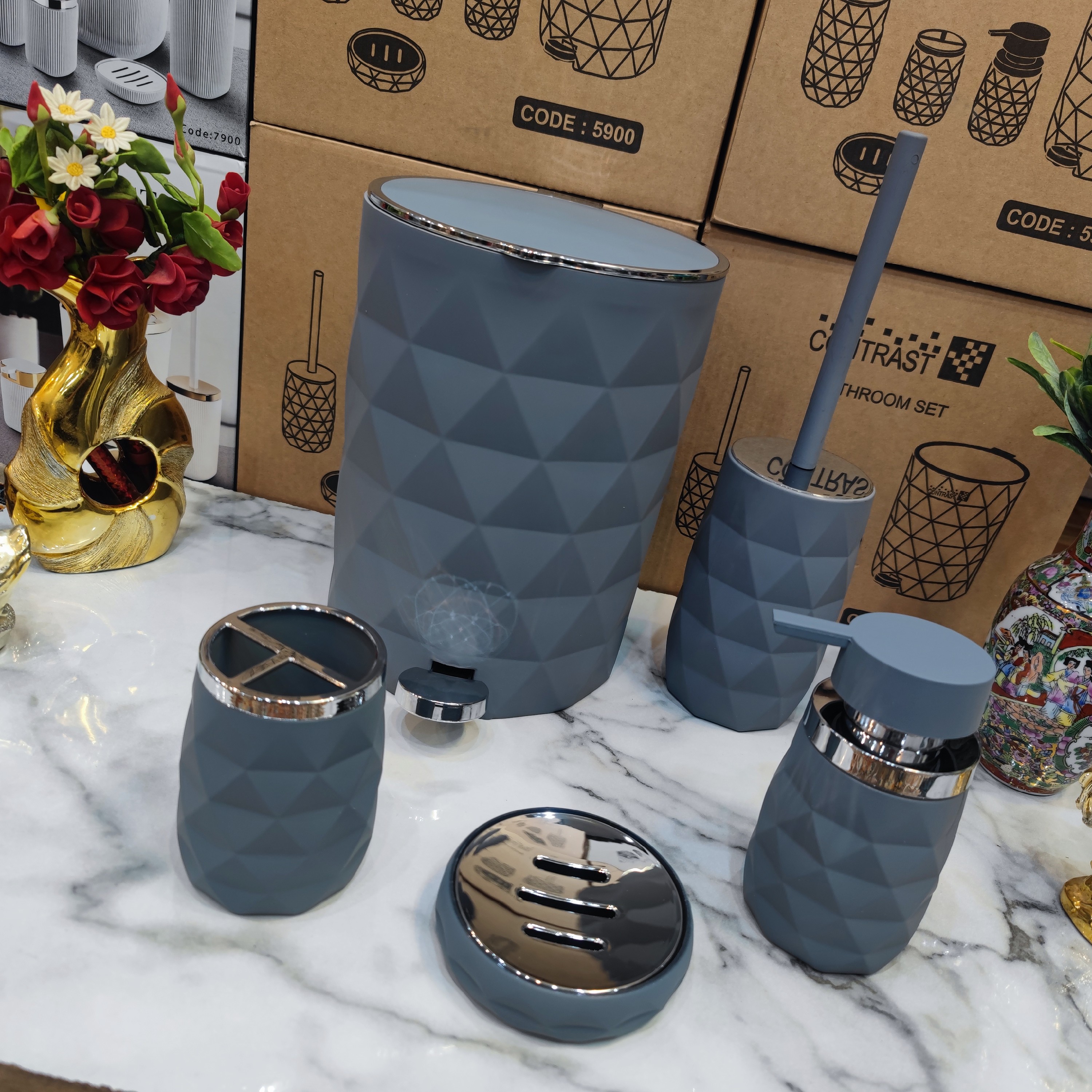 ست سرویس بهداشتی 5 پارچه طرح آناناسی رنگ بسیار زیبا و پرطرفدار و جذاب مخملی طوسی کروم مات برند کنتراست نو آکبند ساخته شده از پلاستیک فشرده اکرولیک درجه یک ABS آنتی باکتریال و روکش مخملی مات طوسی طرح بسیار زیبا و جدید و شیک و صادراتی آناناسی مخملی ست سرویس بهداشتی 5 پارچه شامل: 1. سطل زباله پدالی با درب آرامبند و تویی سطل جداگانه 2. برس و فرچه مخصوص شستشوی سرویس بهداشتی 3. جای مایع دستشویی با سرپمپ زیبا و باکیفیت و تضمینی 4. جای مسواک و خمیردندان 5. جای صابون جامد تضمین کیفیت ساخت عالی و بهترین کیفیت و نازلترین قیمت برای خریداران عزیز ارسال سریع به تمام نقاط کشور برای خریداران عزیز