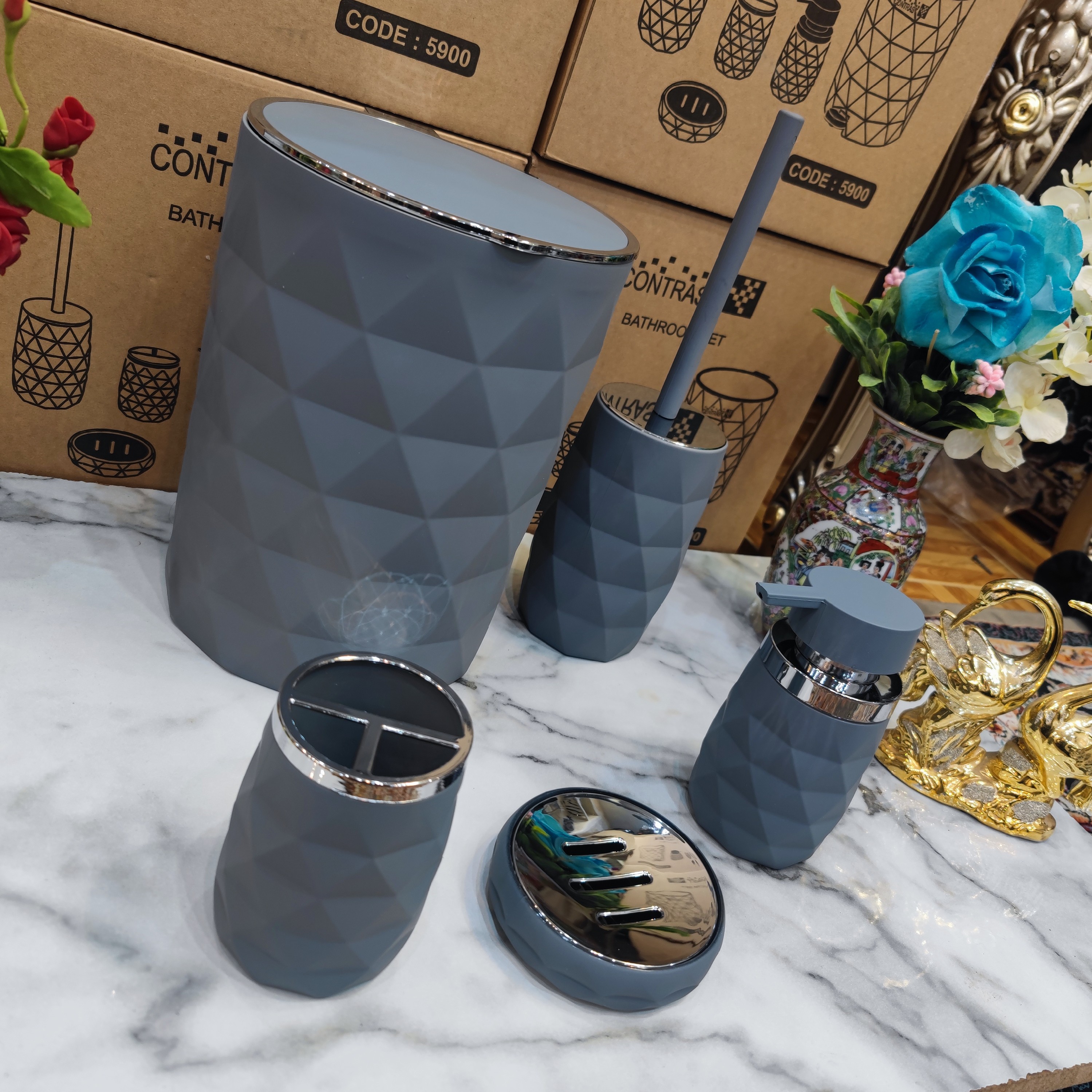 ست 5پارچه سرویس بهداشتی طرح شکیل آناناسی برند کنتراست رنگ زیبا و خاص و شیک مخملی طوسی مات کروم نو آکبند مبلمونسرا مدل 265823