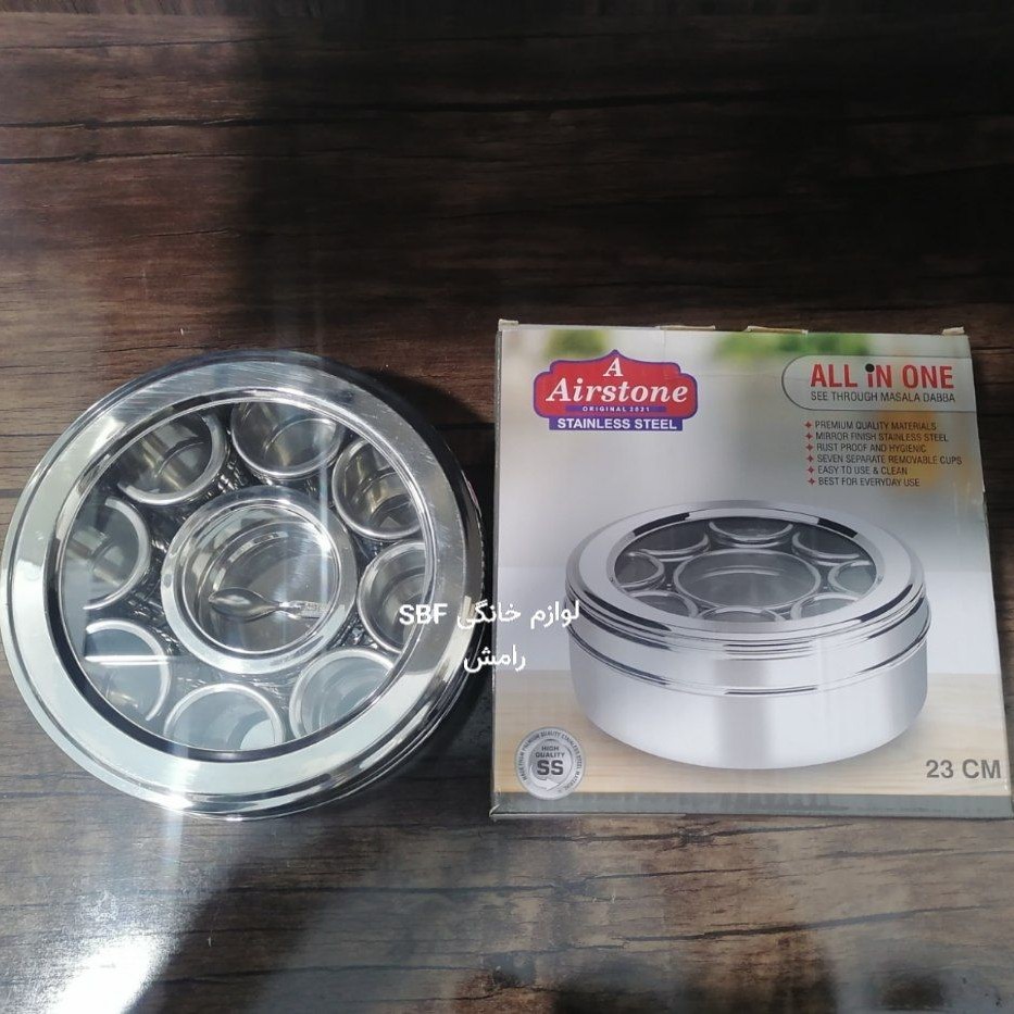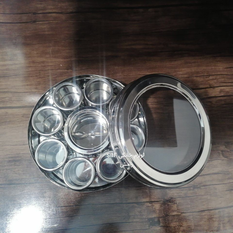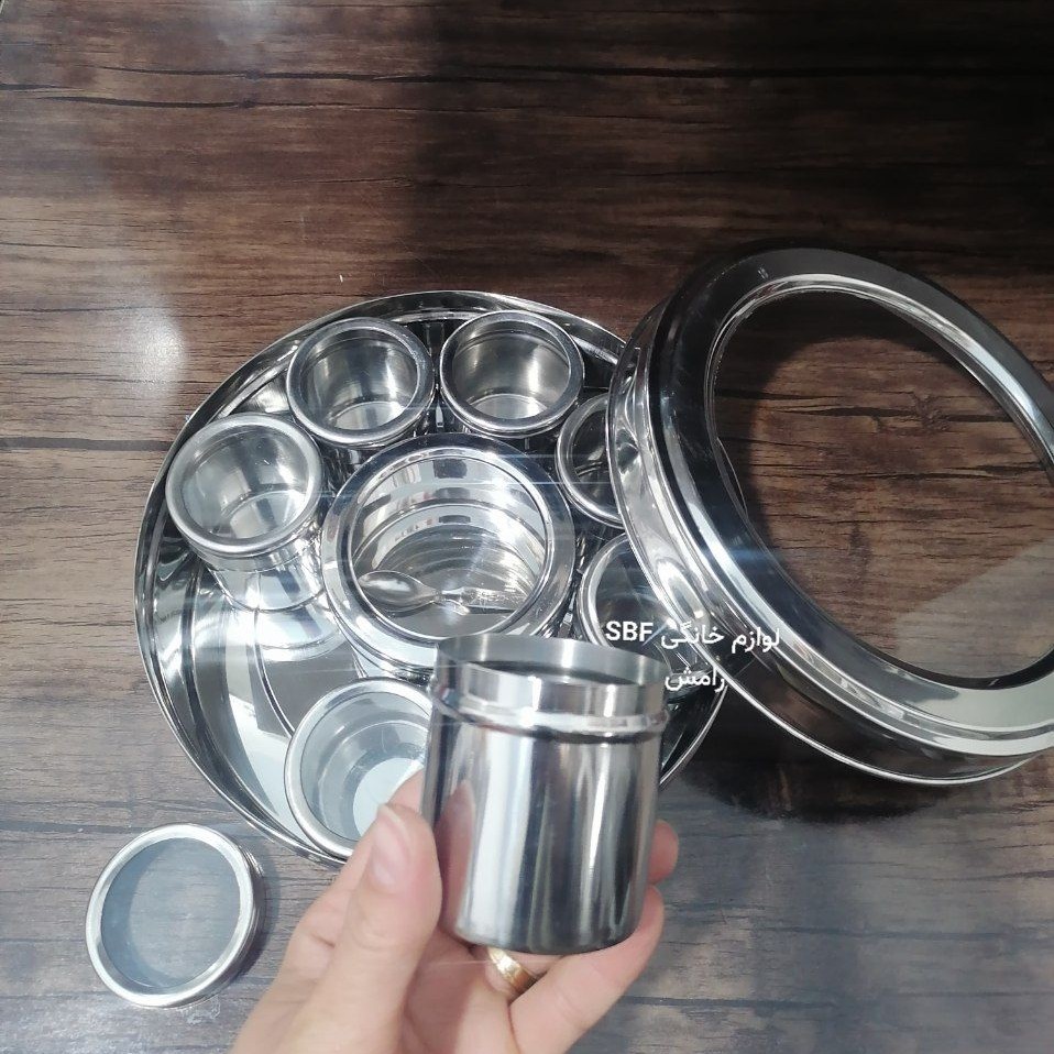 جا ادویه استیل. دارای 8 عدد قوطی کوچک درب دار. و 1 عدد قوطی بزرگ و 1 عدد قاشق ادویه. قطر کلی 23 س م میباشد. وسط دربها از شیشه زده شده تا محتویات قوطی ها پیدا باشد.