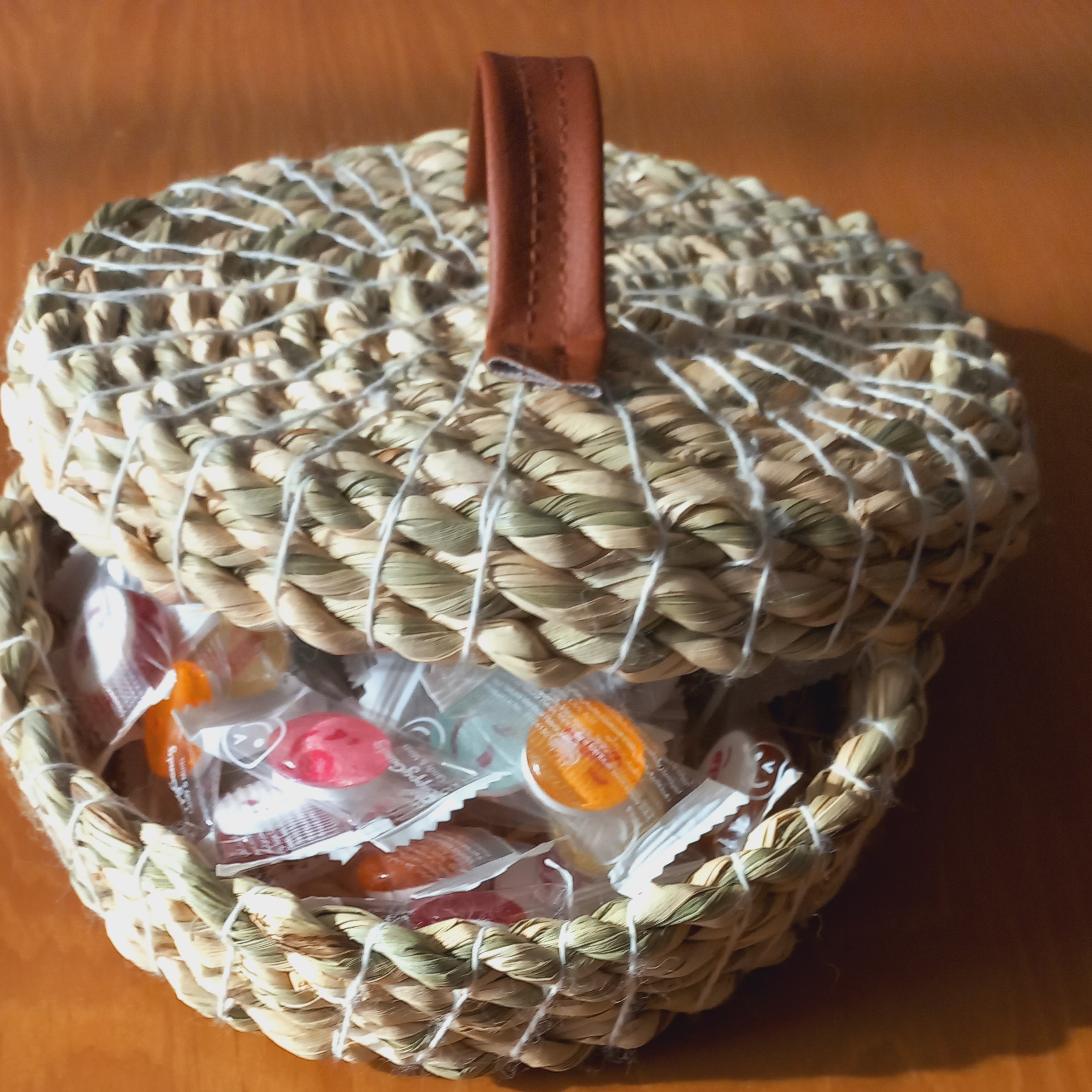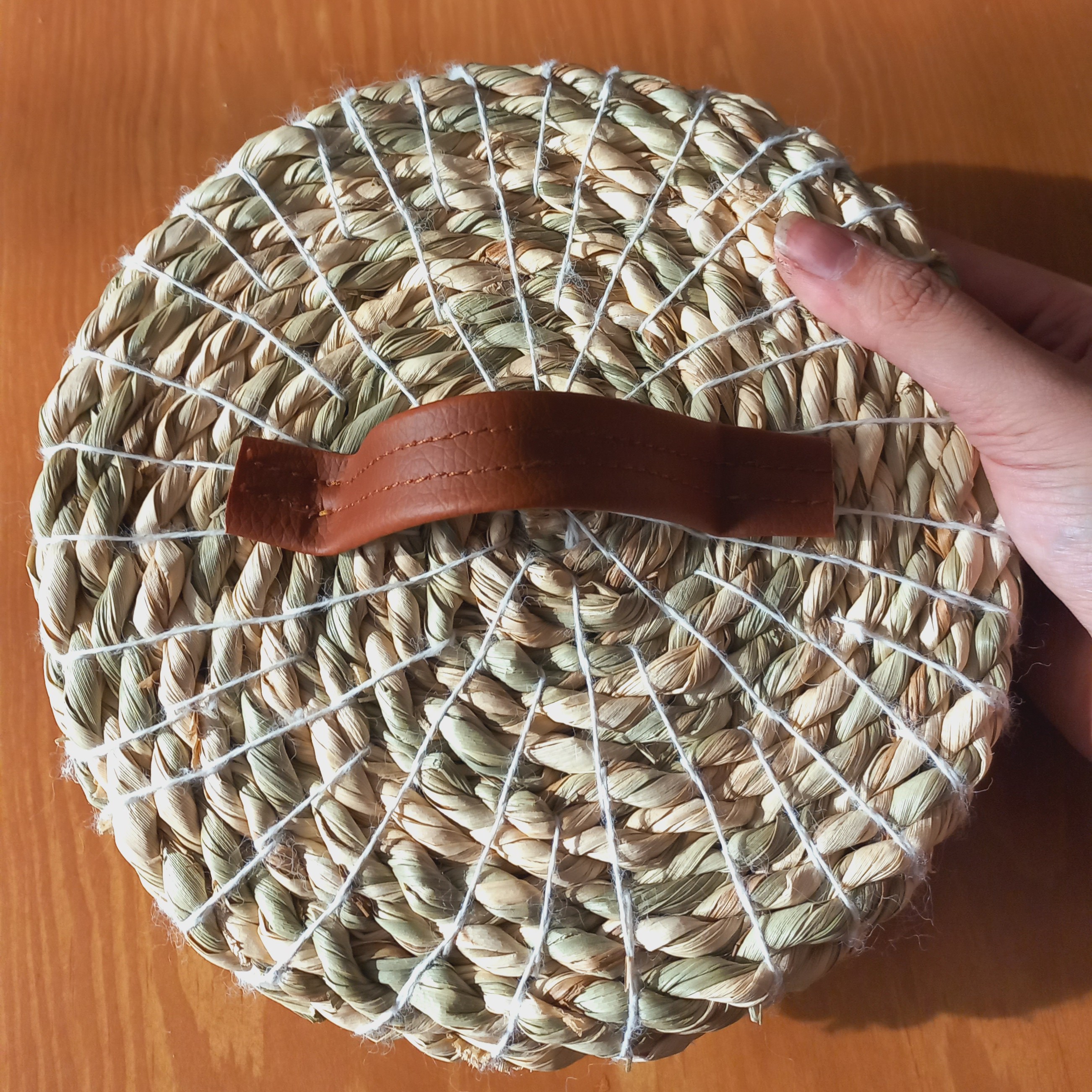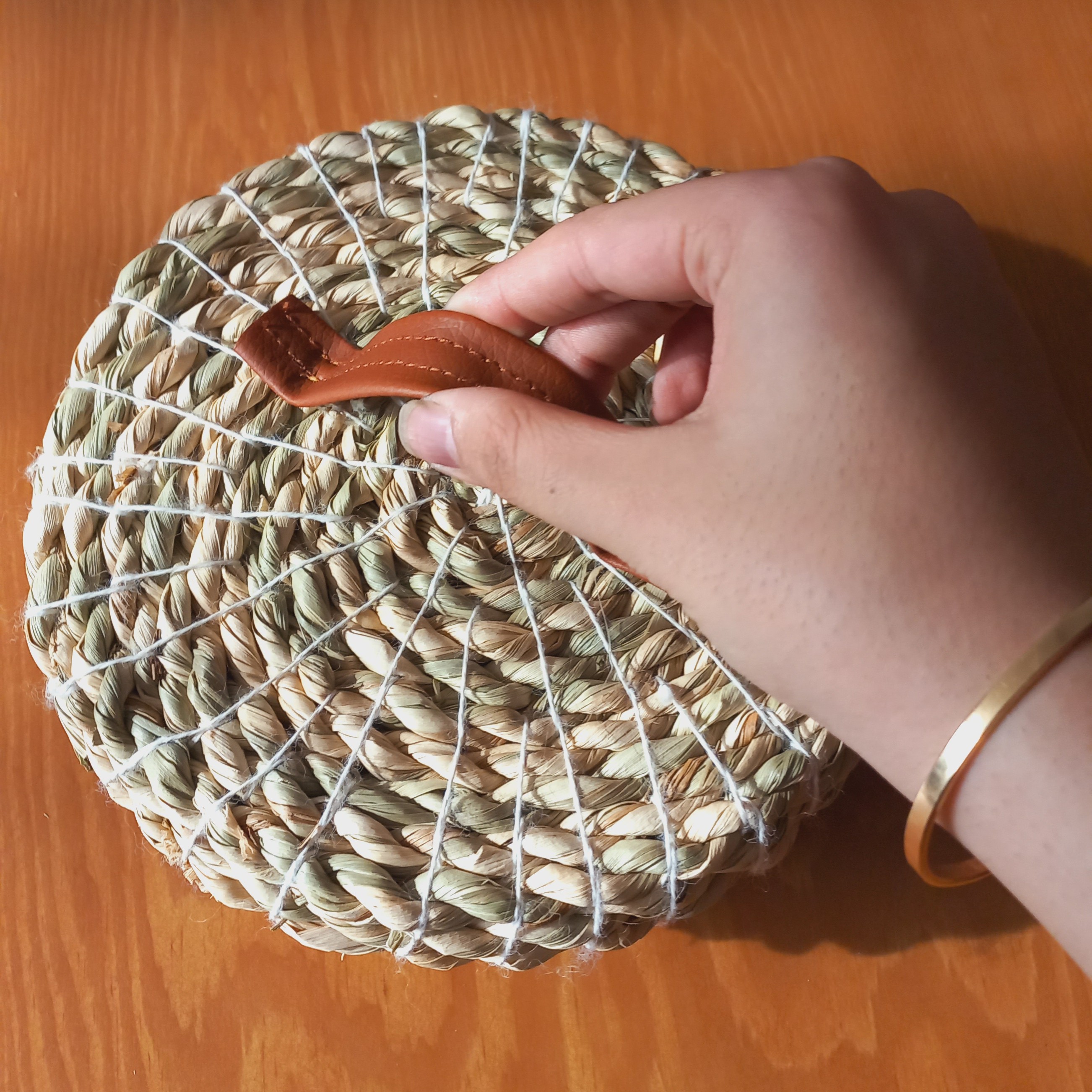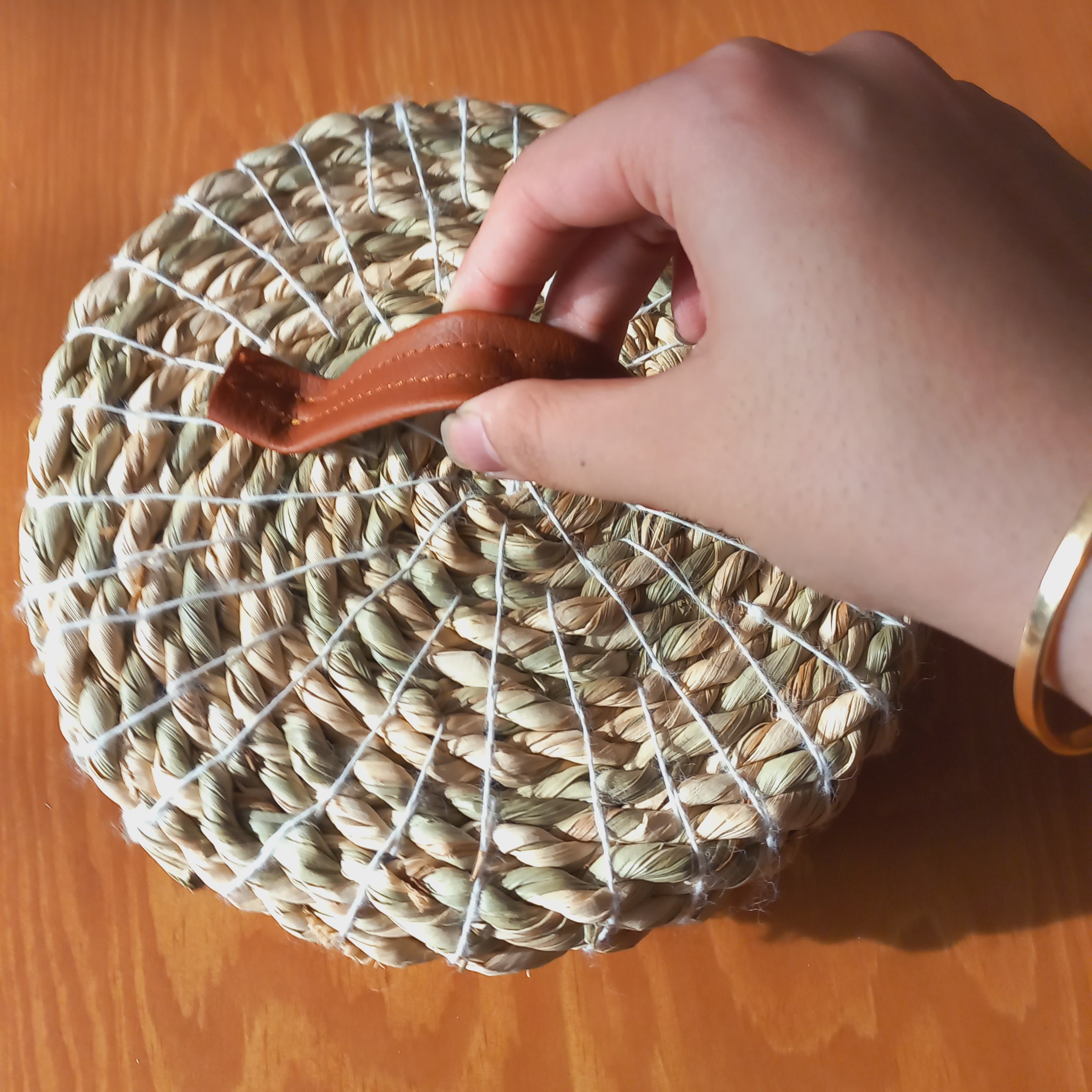شکلات خوری حصیری دسته چرمی این کار بافته شد با طناب حصیری ۱۰ میل یه کار بسیار محکم وزیبا