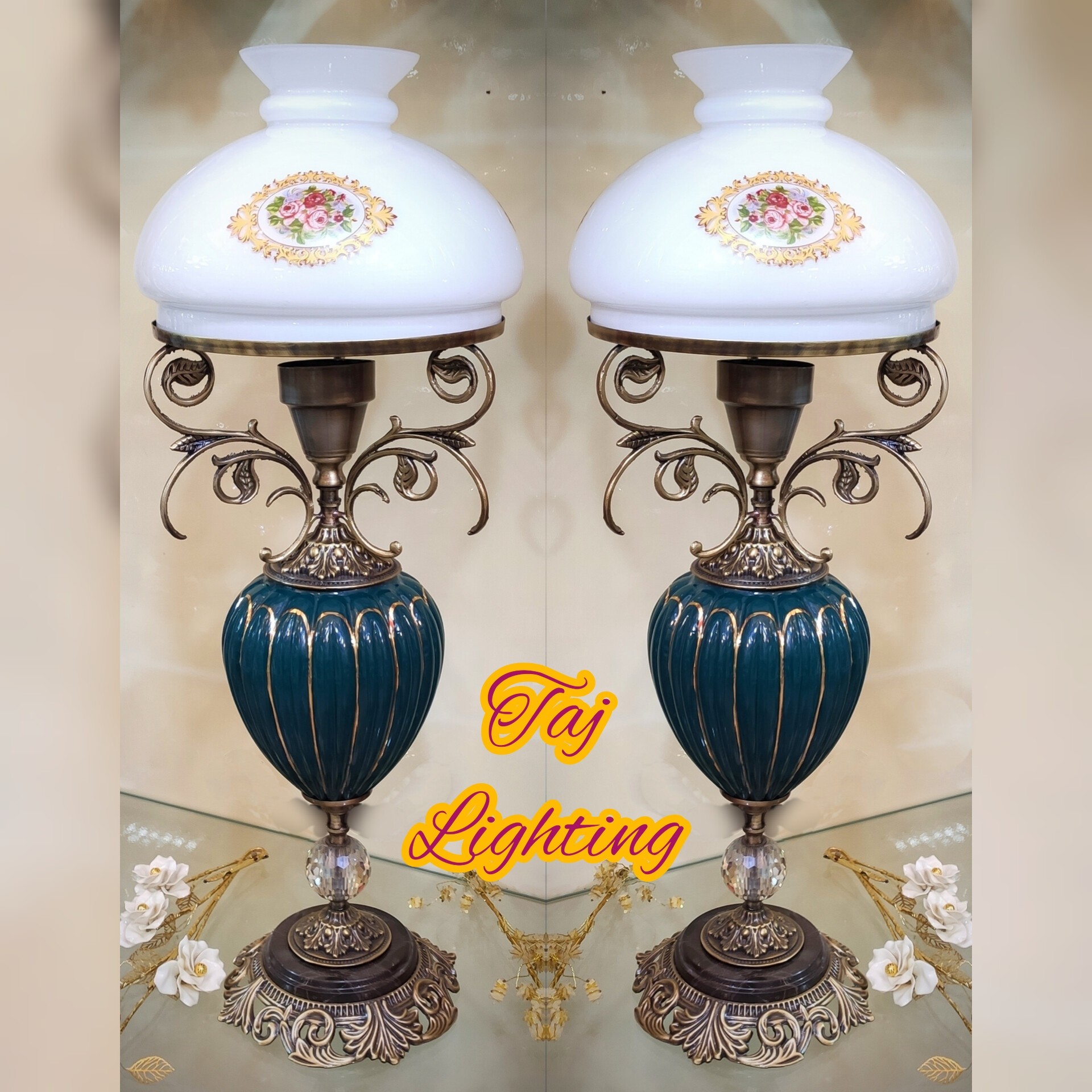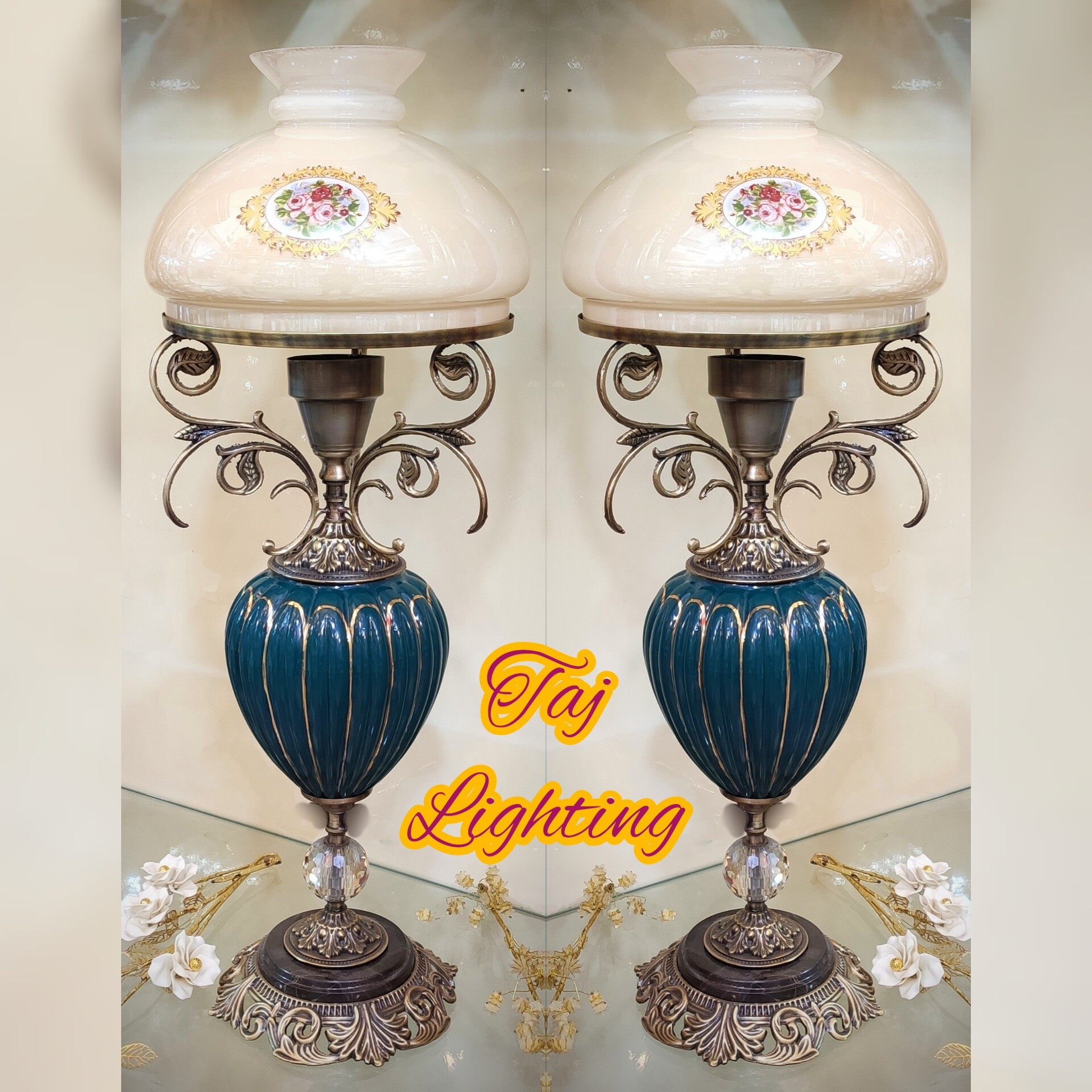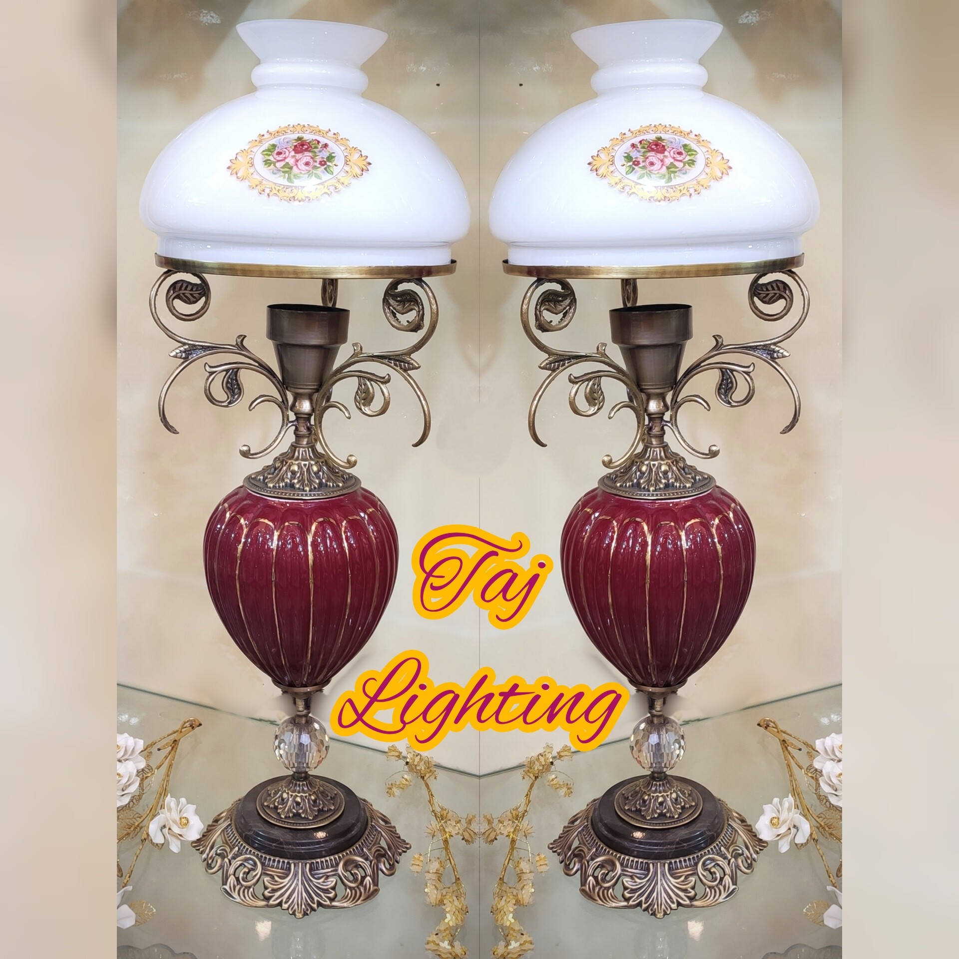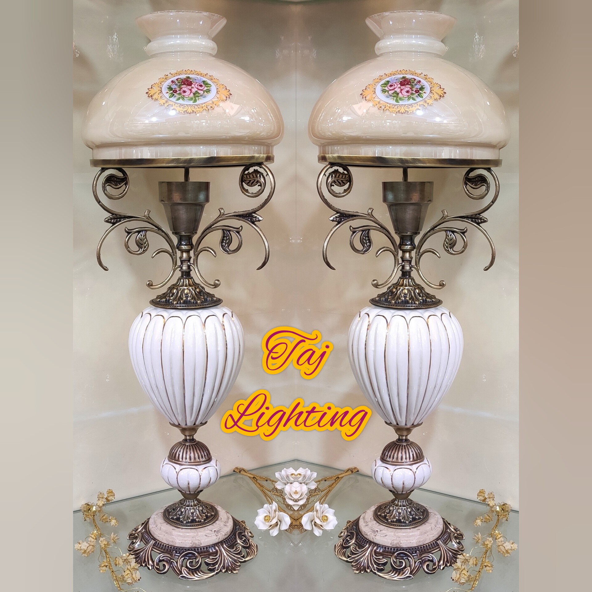 💥قیمت درج شده ، قیمت هر عدد چراغ می باشد جنس حباب : بلور رنگ حباب : سفید ، کِرِم جنس وسط تنه : چینی رنگبندی وسط تنه : سفید، زرشکی، سورمه ای ، فیروزه ای ، یشمی جنس پایه سنگ و برنز با آبکاری آنتیک