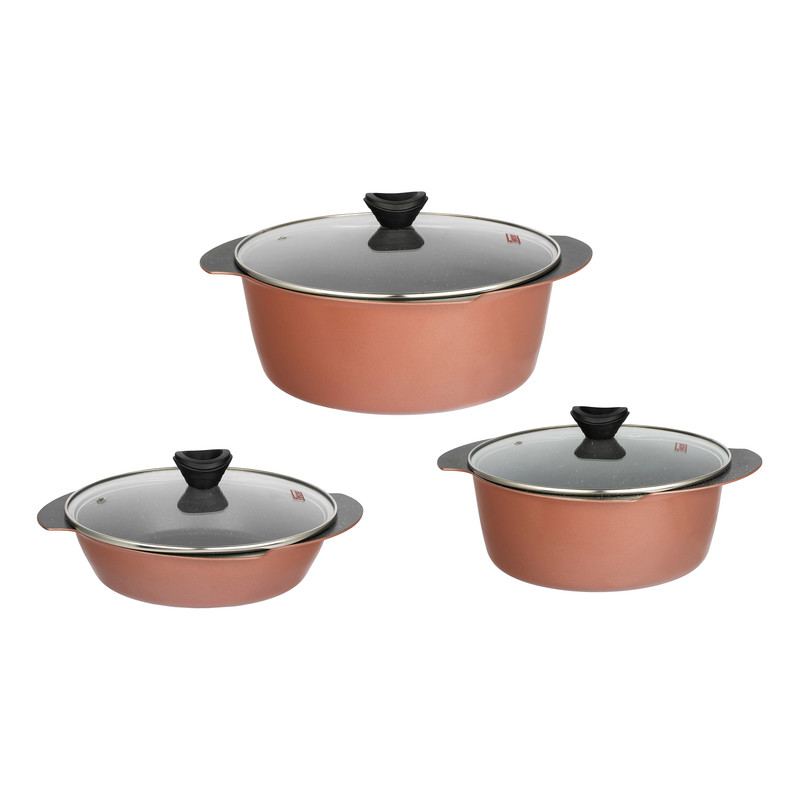 سرویس پخت و پز 6 پارچه تکنو مدل یک سرویس جمع و جور مناسب برای خانواده های کم جمعیت تا متوسط تولید شده است. این سرویس از جنس آلومینیوم و با پوشش گرانیت نچسب تولیدشده و دارای 2 قابلمه در سایز های 24 و 28 و یک تابه در سایز 24 می باشد. سرویس پخت و پز 6 پارچه تکنو مدل ، با ویژگی های بیان شده، یک انتخاب عالی برای داشتن یک تجربه آشپزی مطمئن و راحت است. روکش گرانیت قابلیت نچسب بودن روی کفه را دارد و باعث جلوگیری از چسبیدن مواد غذایی به کف ظرف خواهد شد. قپه این سرویس از جنس باکالیت ساخته شده است که باعث ایمنی در دستان شما میشود. این سرویس قابل استفاده در اجاق گاز بوده و همچنین قابل شستوشو با دست را داراست.