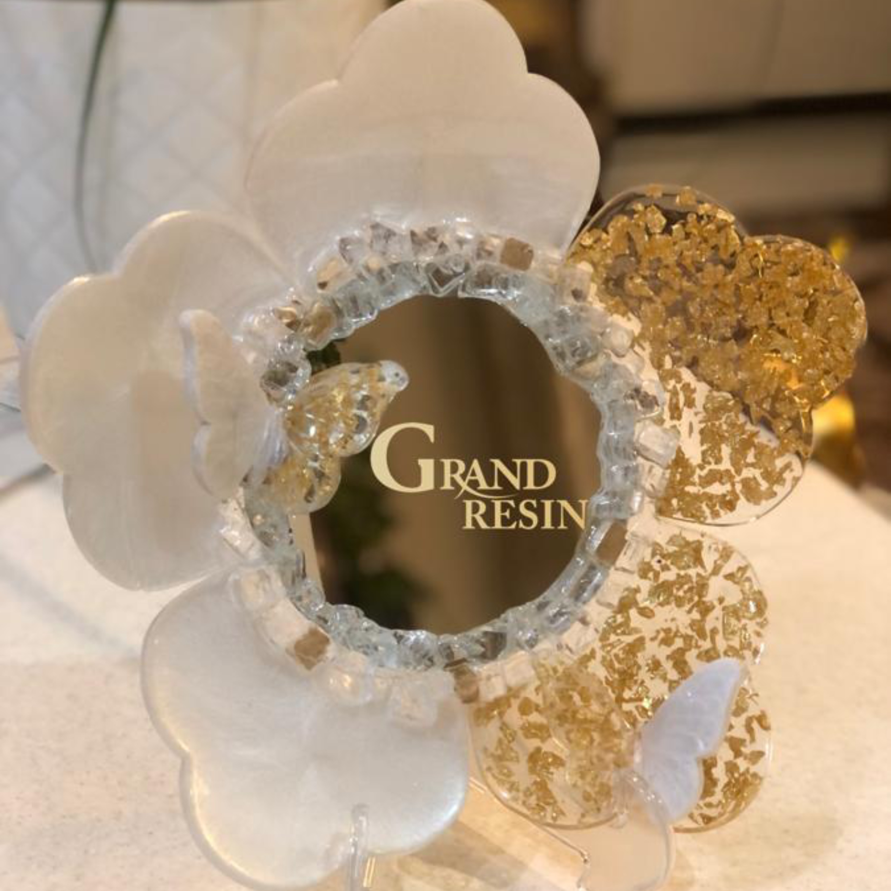 قاب آینه قطر 30 و 2 عدد شمعدان و 6 پیاله کار شده با ورق طلا طرح رنگ و ورق