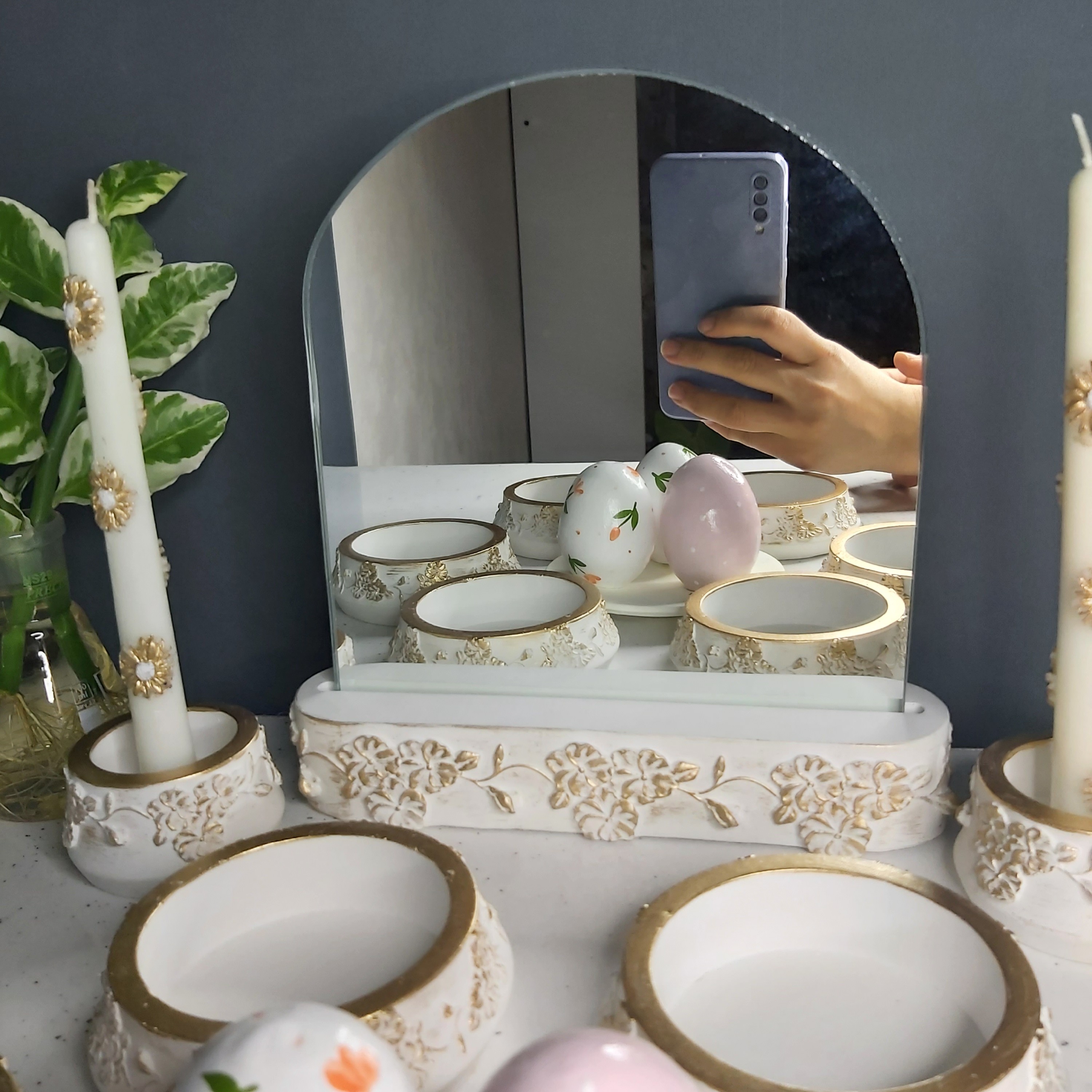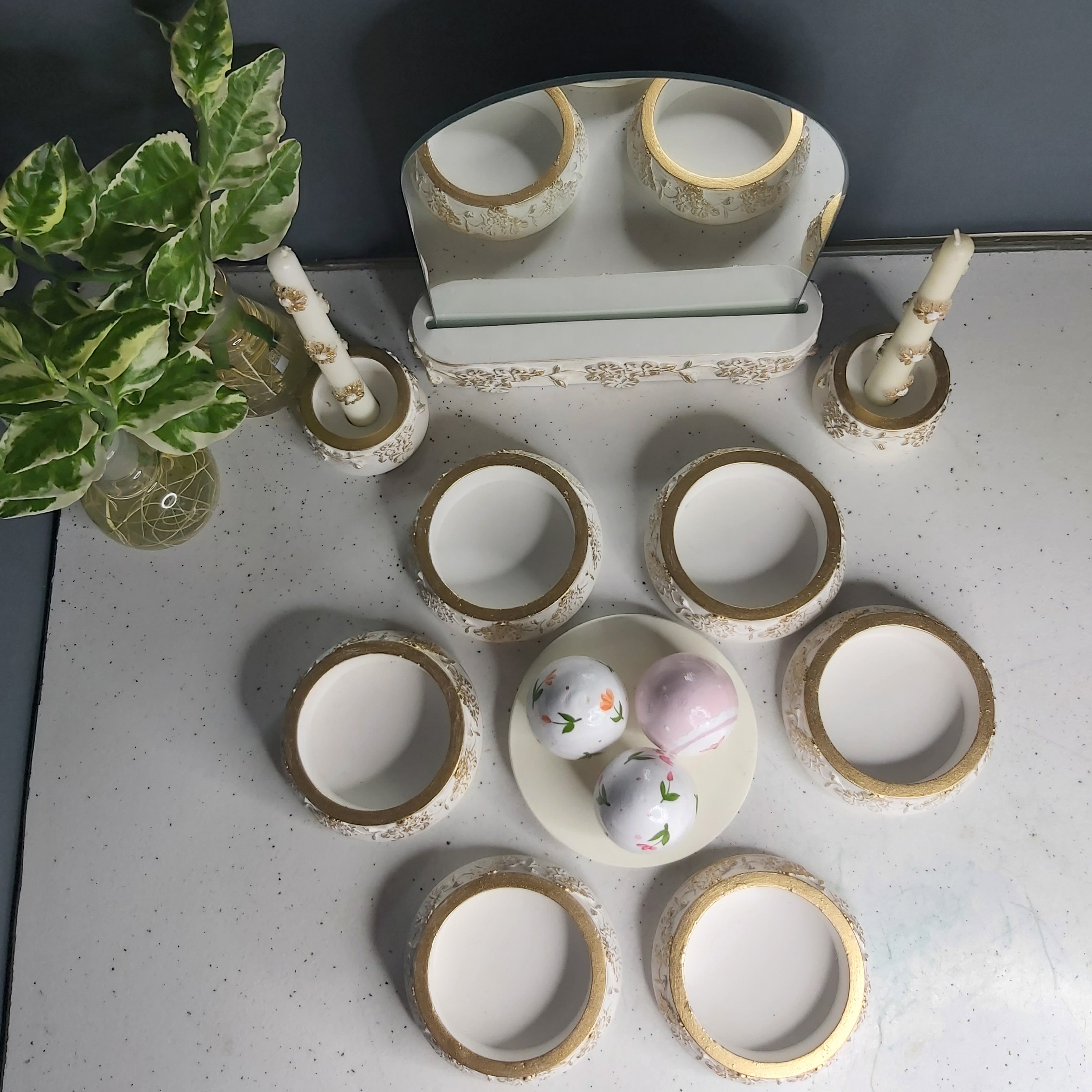 هفت سین سفید طلایی دارای 6کاسه یک آینه و پایه آینه دوعدد شمعدان مبلمونسرا مدل 259109