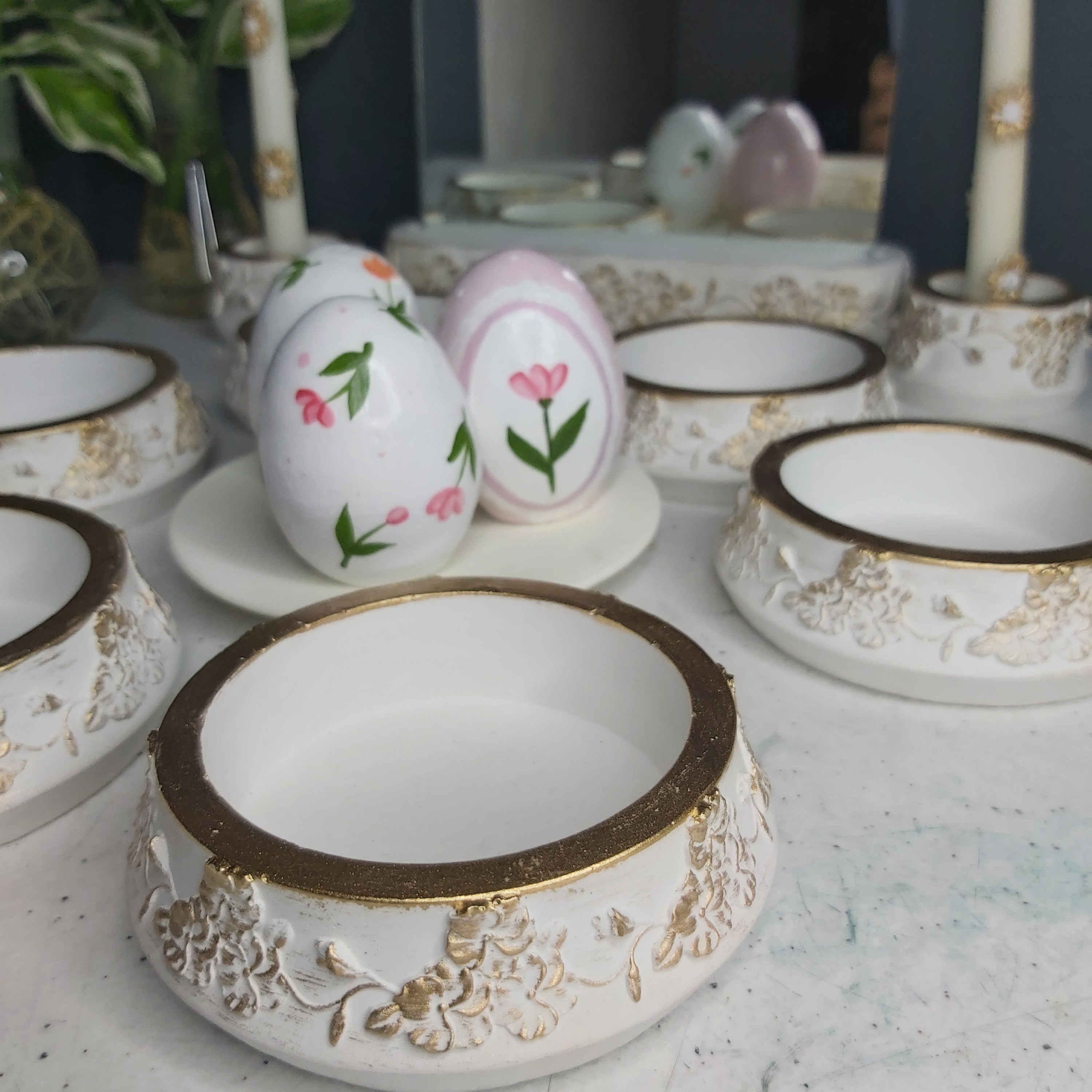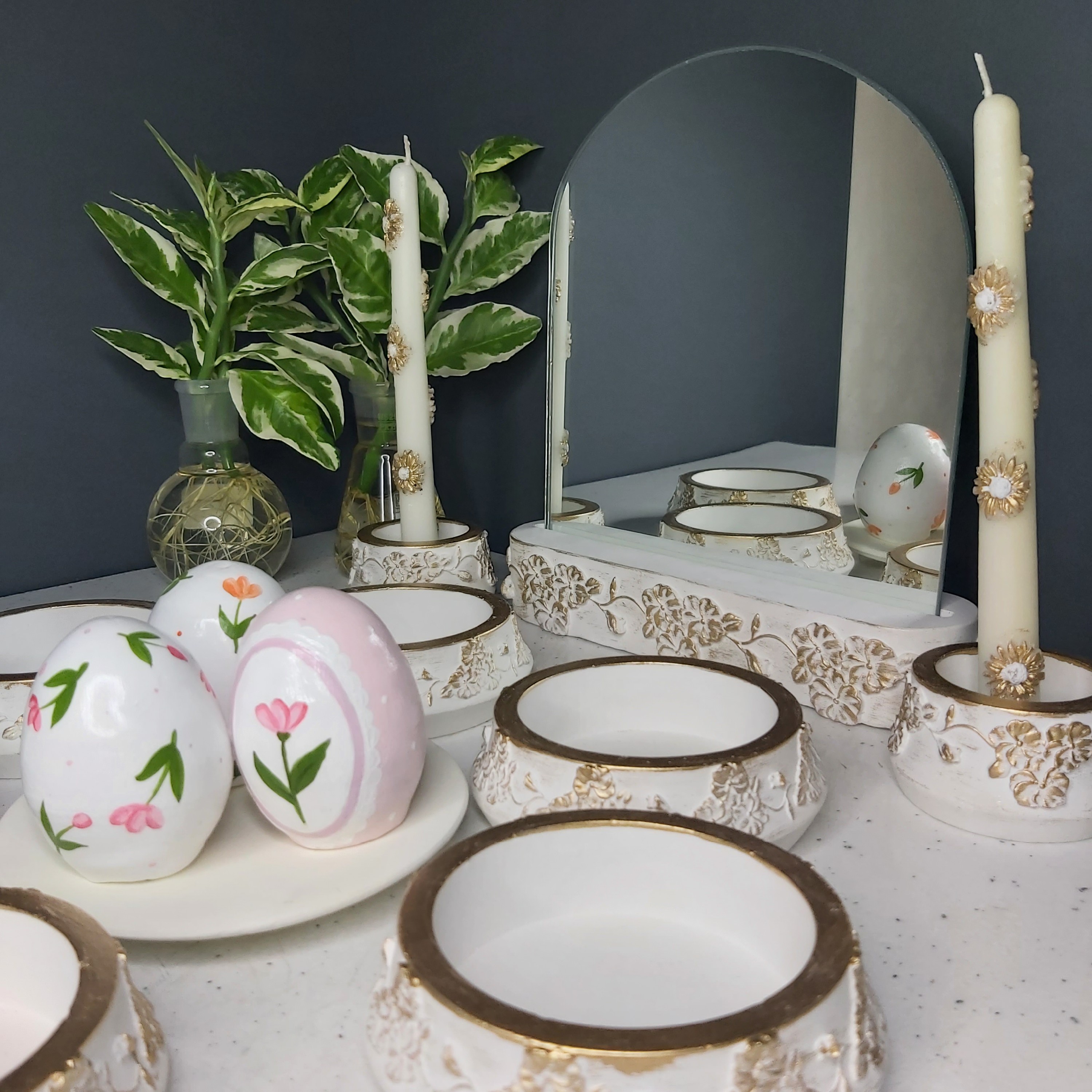 6کاسه ابعاد 10×3/5،پایه آینه ابعاد 22×4×5،تخم مرغ ارتفاع 8،شمعدان 7×4آینه ابعاد 19×22