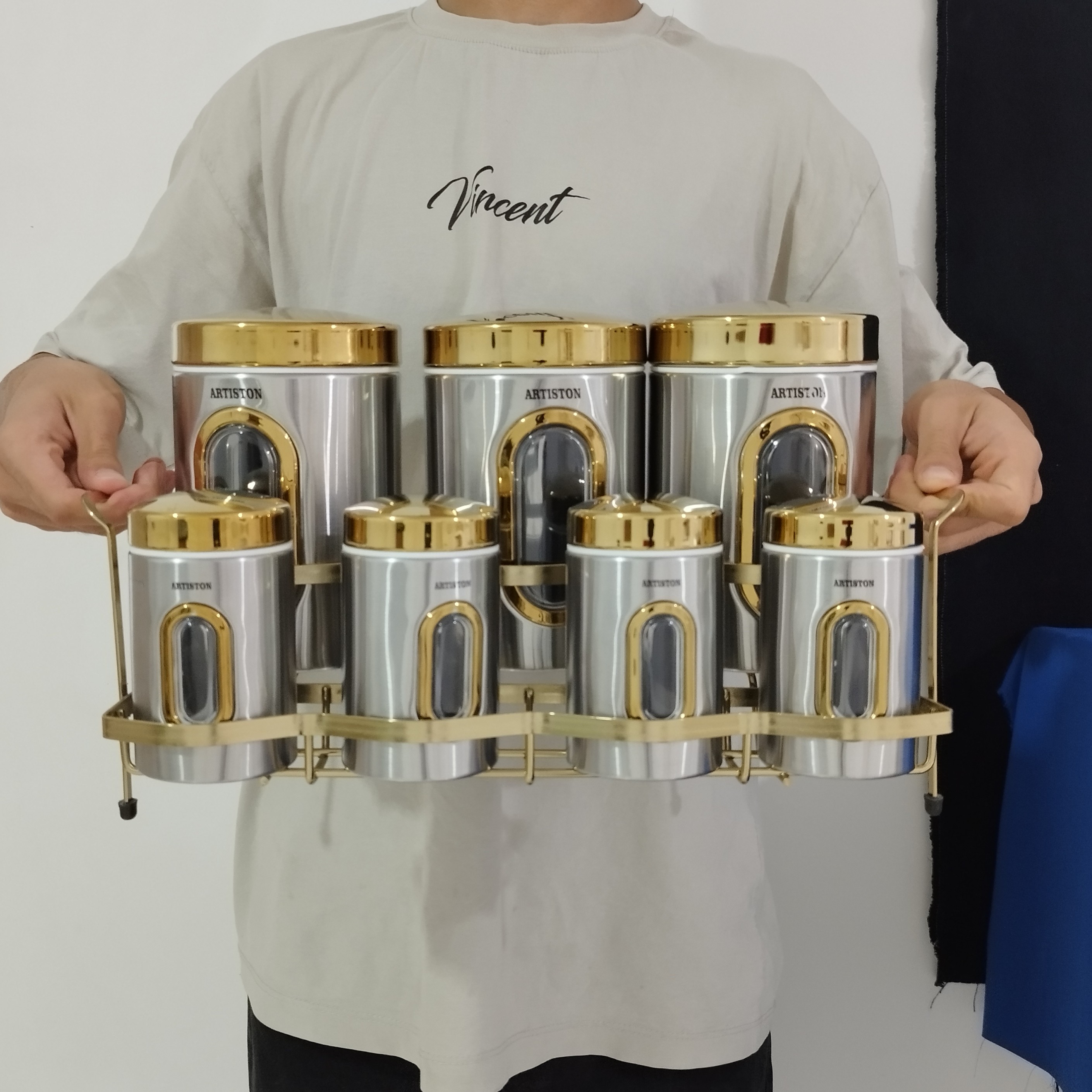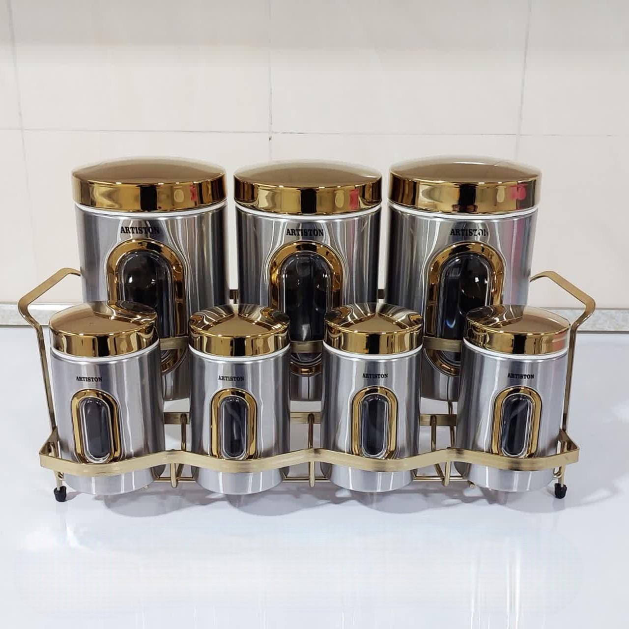 ست 8 پارچه ادویه و حبوبات استیل آرتیستون درب طلایی کد 8546 مبلمونسرا مدل 291552