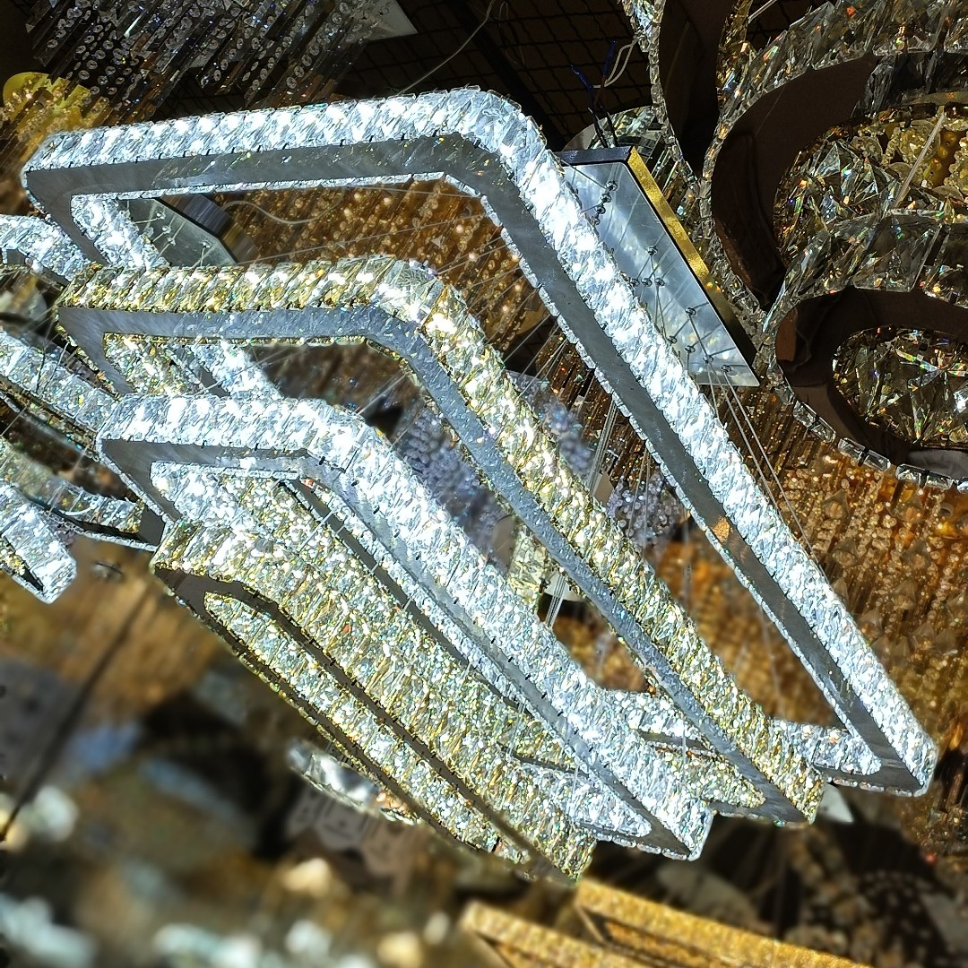 لوستر مدرن مستطیل سایز 60-100چهار طبقه نور دهی سه رنگ چهار حالته قابلیت اتصال به تلفن همراه بلوتوث سایز کریستال 3*5 قابل سفارش در ابعاد مختلف قیمت تولیدی