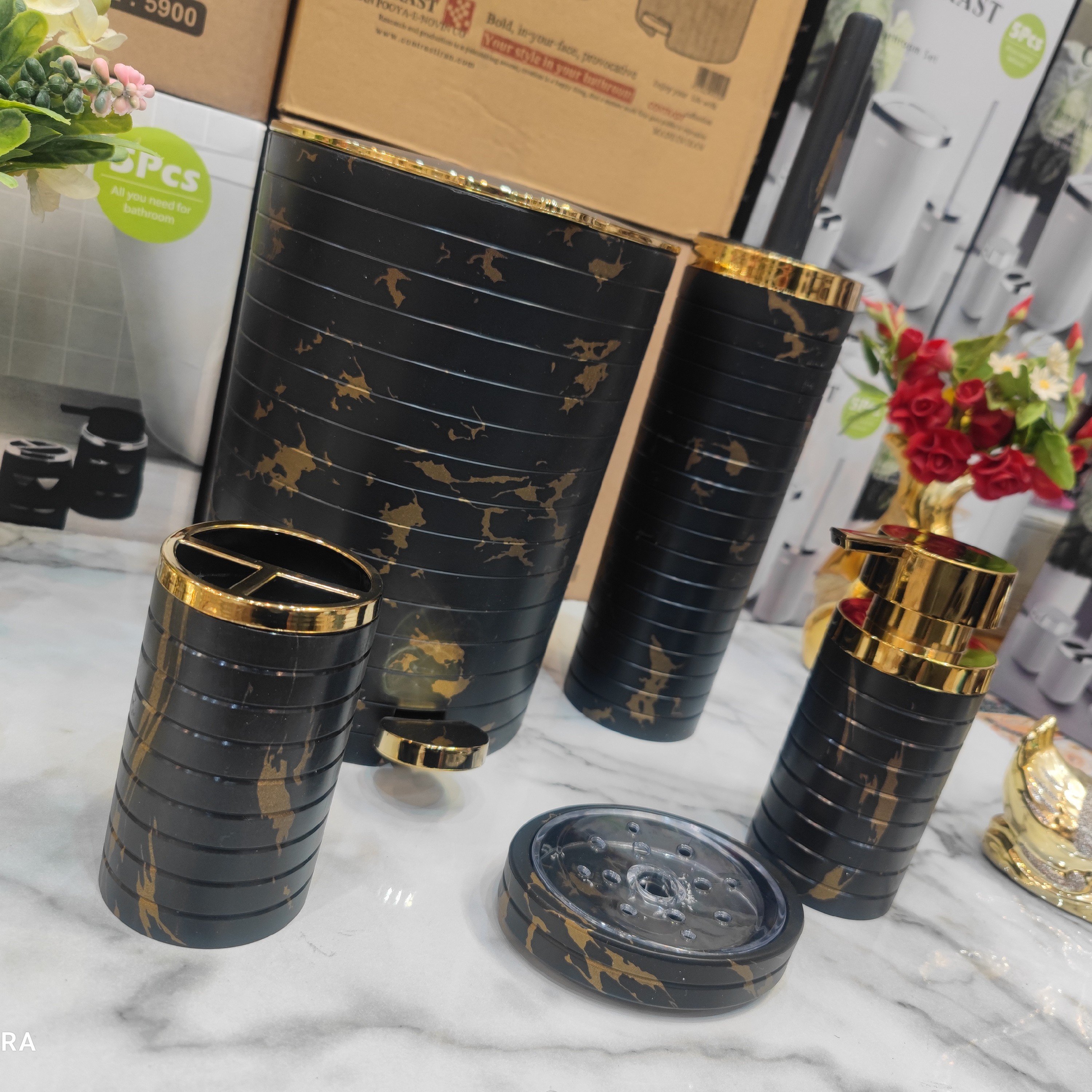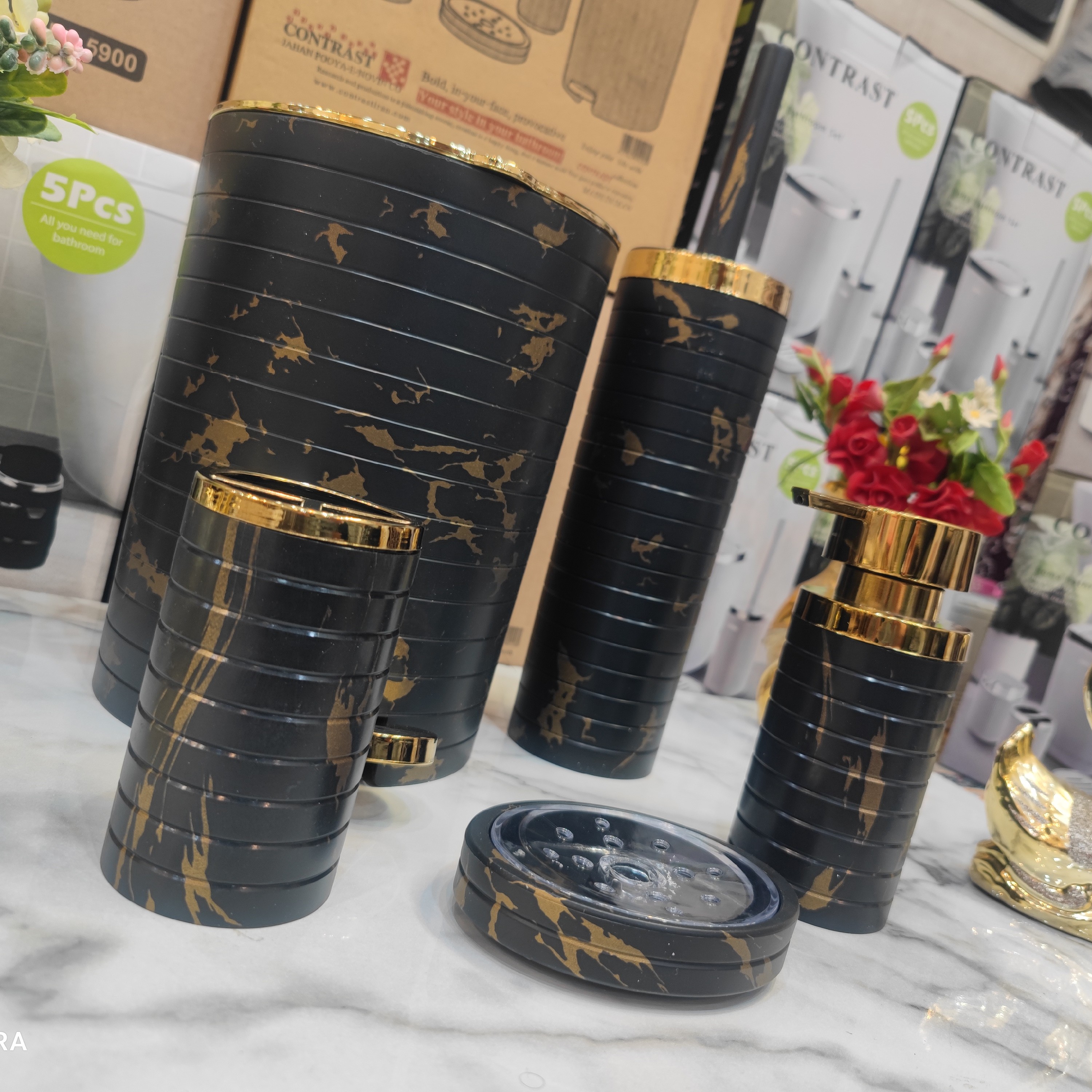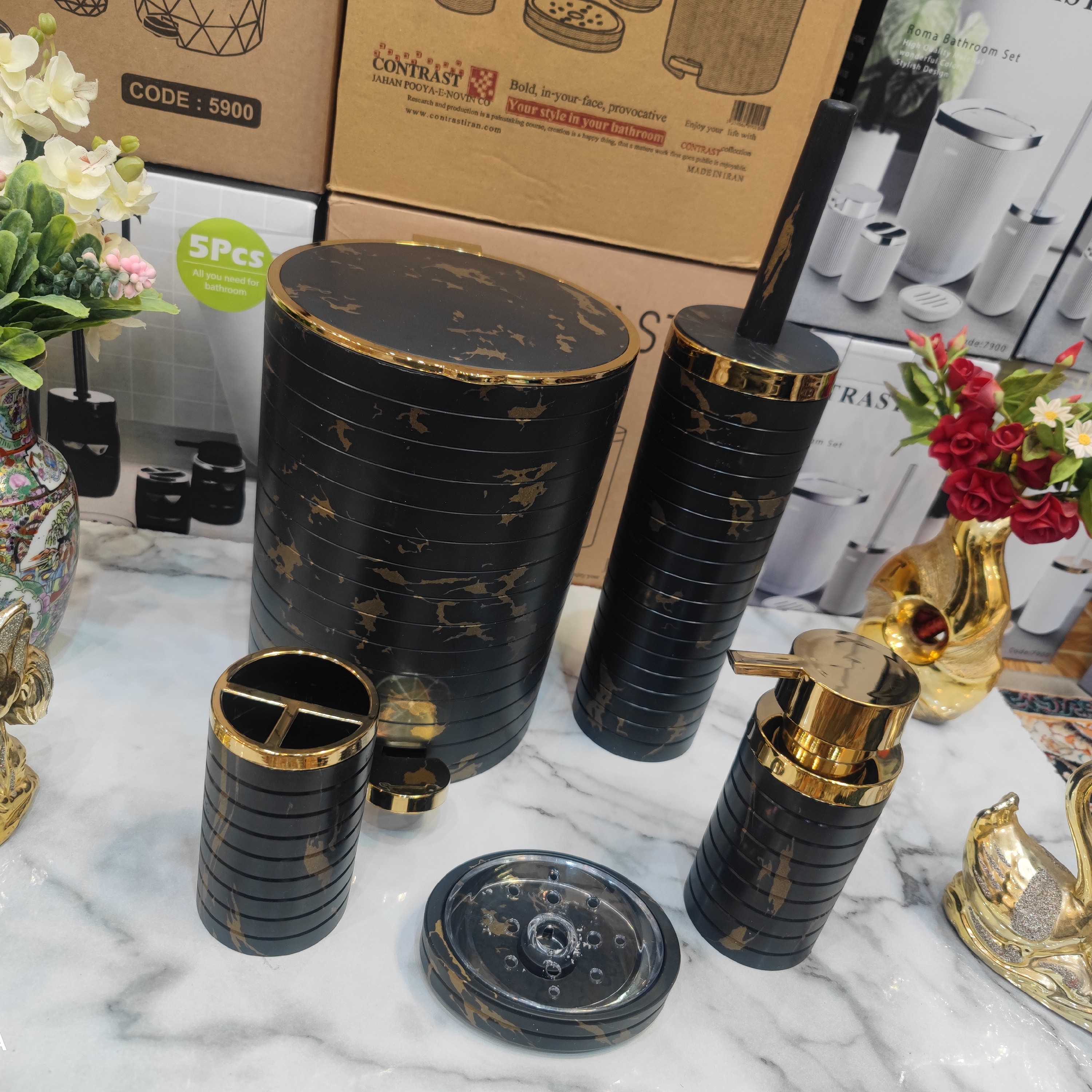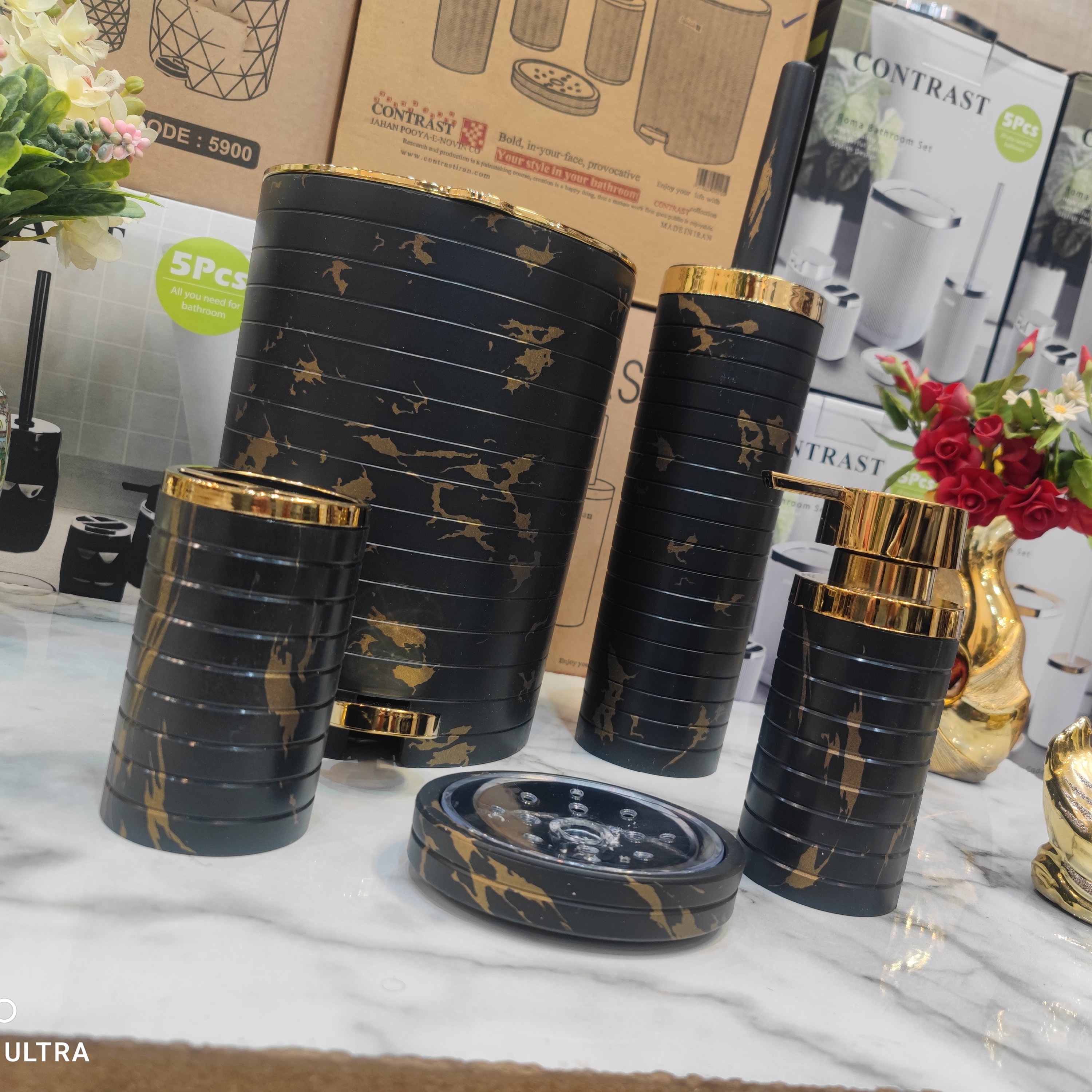 ست سرویس بهداشتی 5 پارچه طرح خط درشت برند کنتراست رنگ بسیار زیبا و پرطرفدار و جذاب و خاص ماربل مشکی طلایی مبلمونسرا مدل 266512