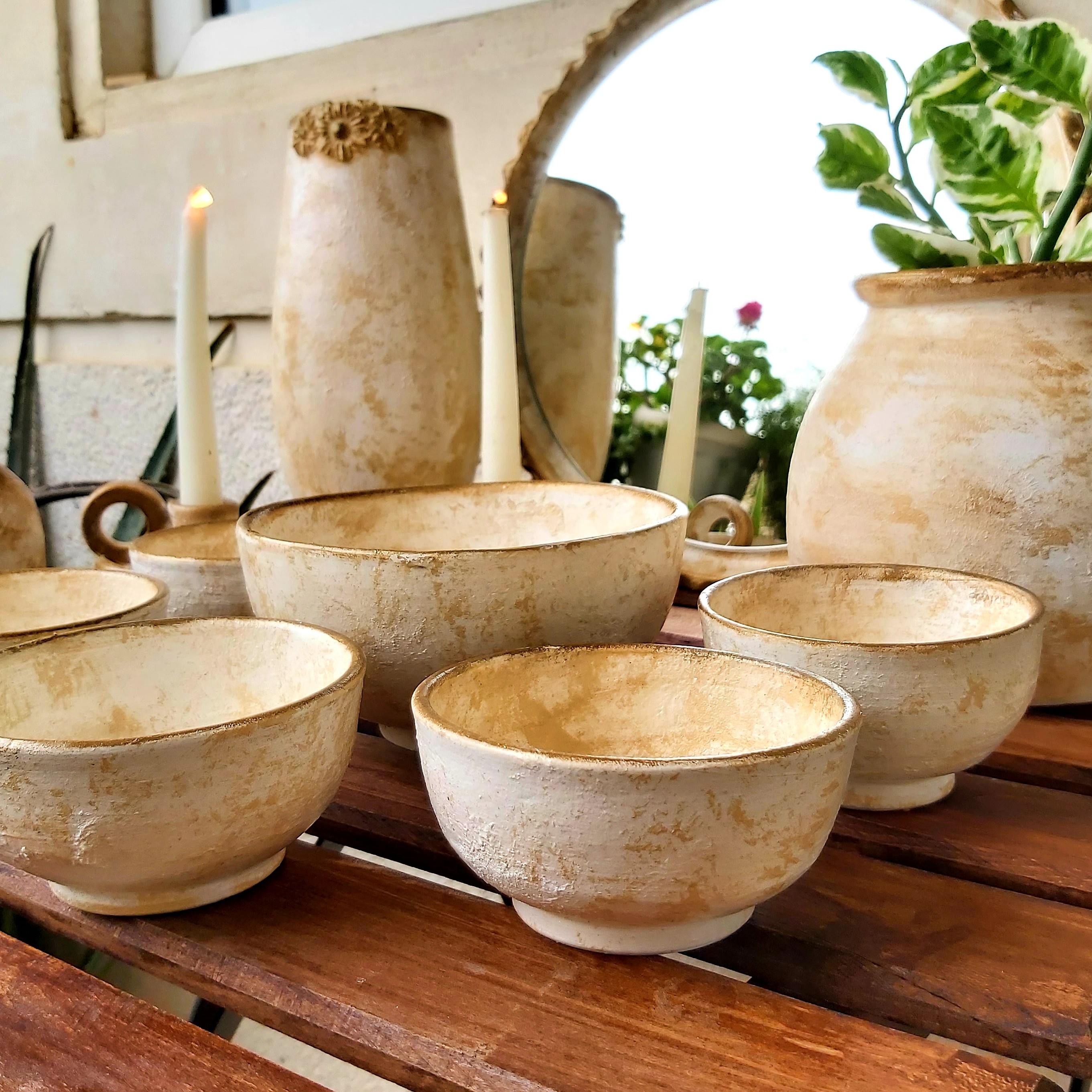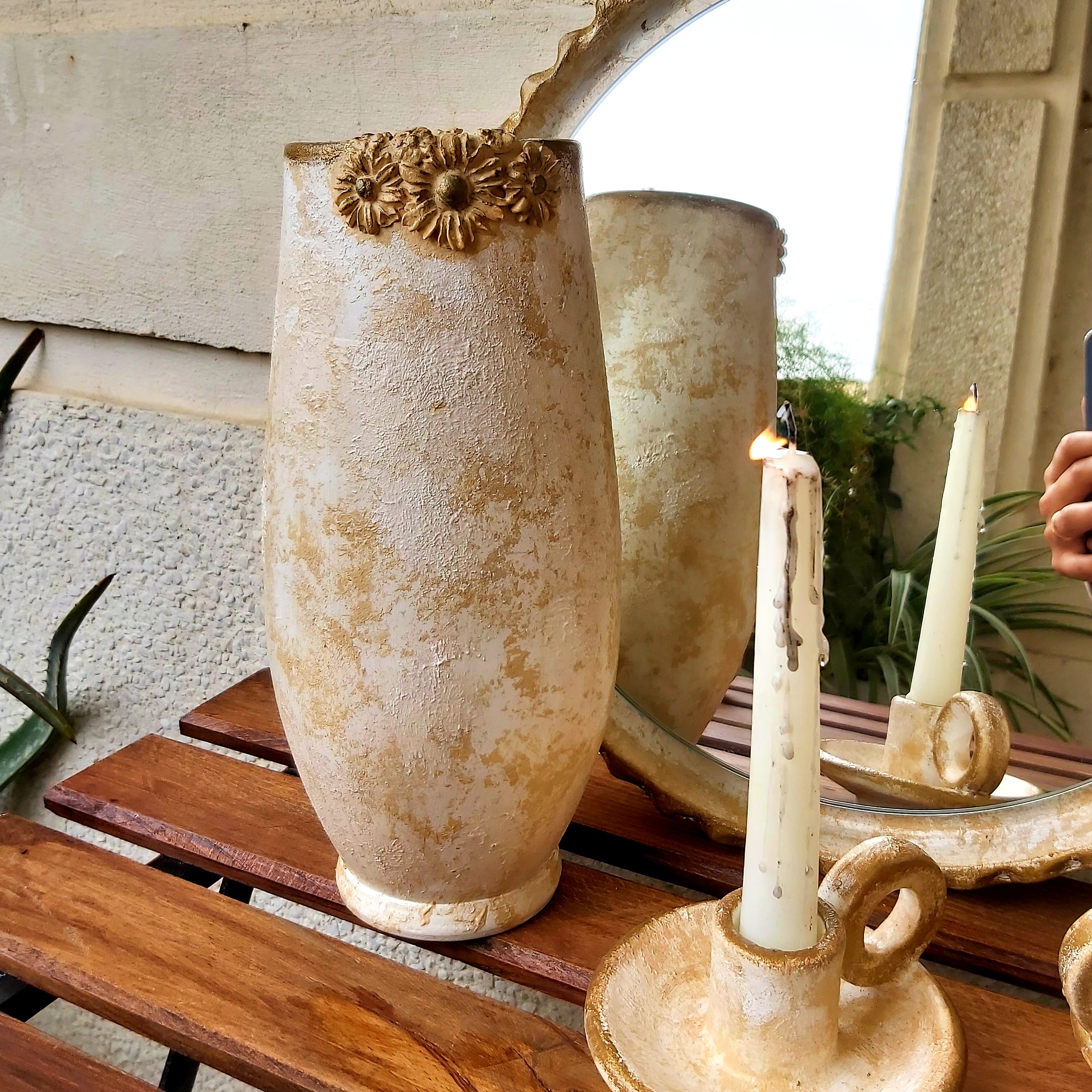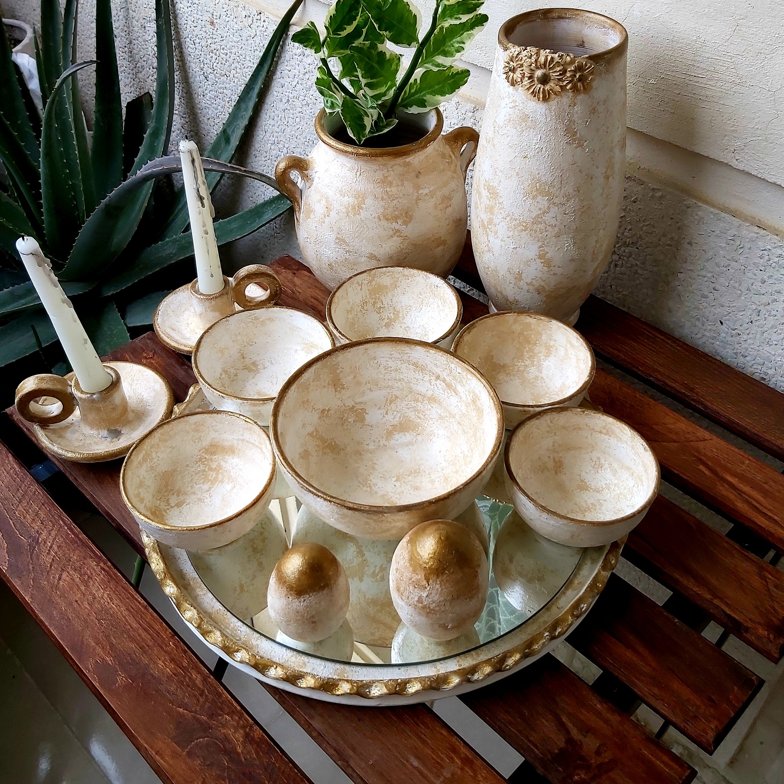 قطر آینه 35،5تا کاسه دهانه 10،یک کاسه دهانه 15،تخم مرغ ها ارتفاع 10و 8،جلشمعی قطر 11،گلدان دودسته دار ارتفاع 16،گلدان خمره ای ارتفاع 25سانتیمتر